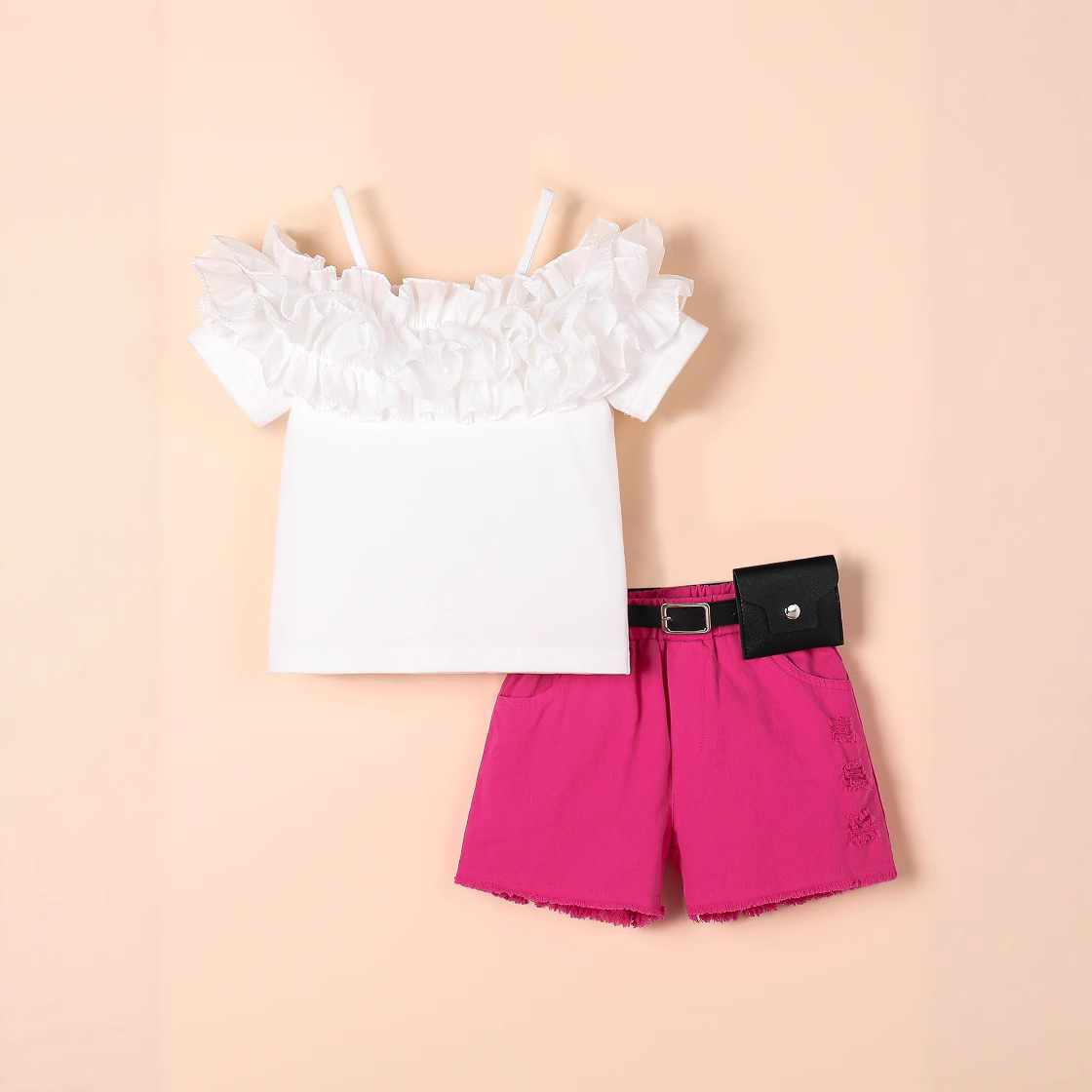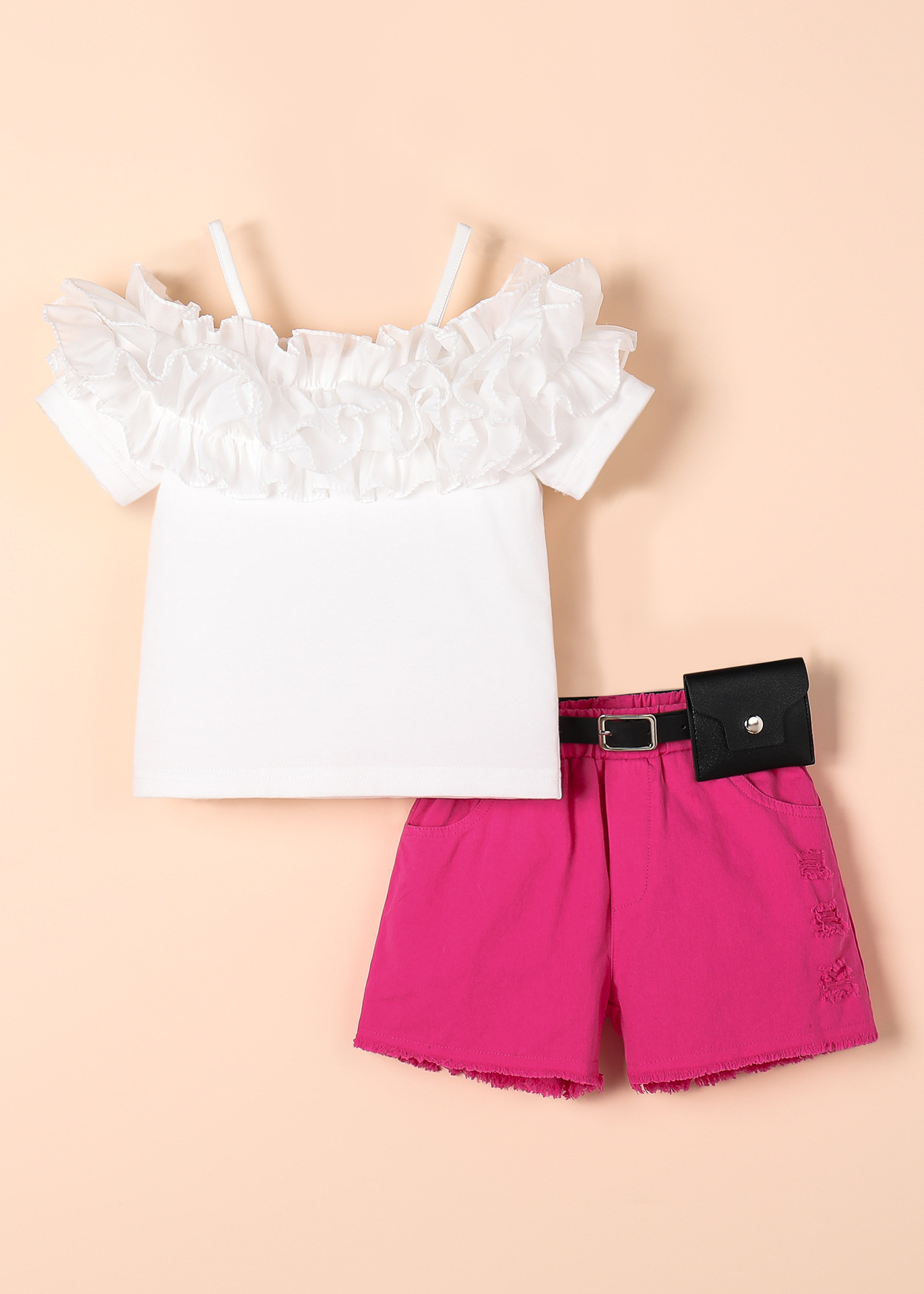 국경 간 유럽과 미국 여름 인기 판매 새로운 여자 정장 서스펜더 원 숄더 반팔 + 데님 반바지 + 벨트