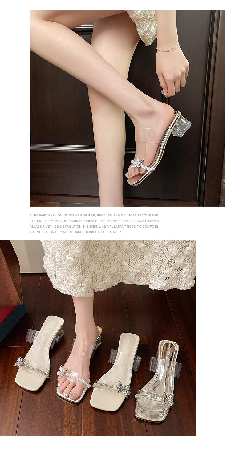 2025년 여름 신상 여성용 다용도 투명 크리스탈 두꺼운 굽 아우터 슬리퍼, 나비 스퀘어 토 슬리퍼스토어 가기