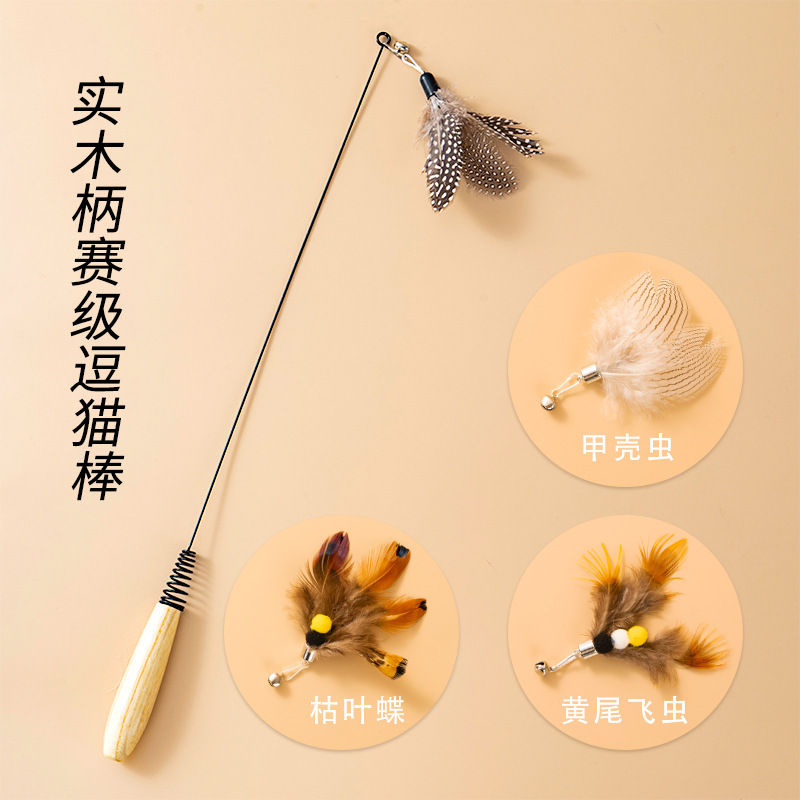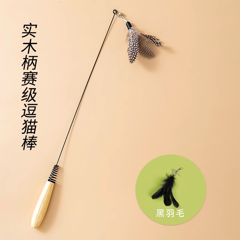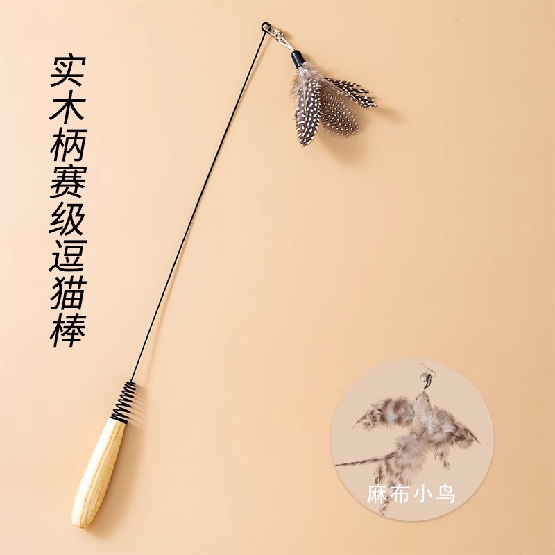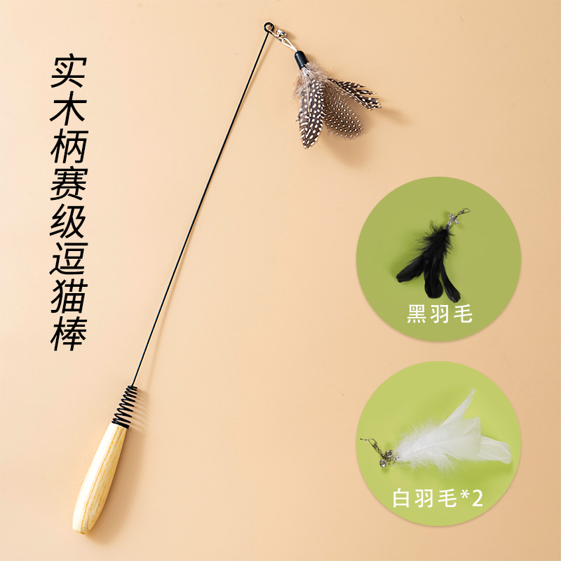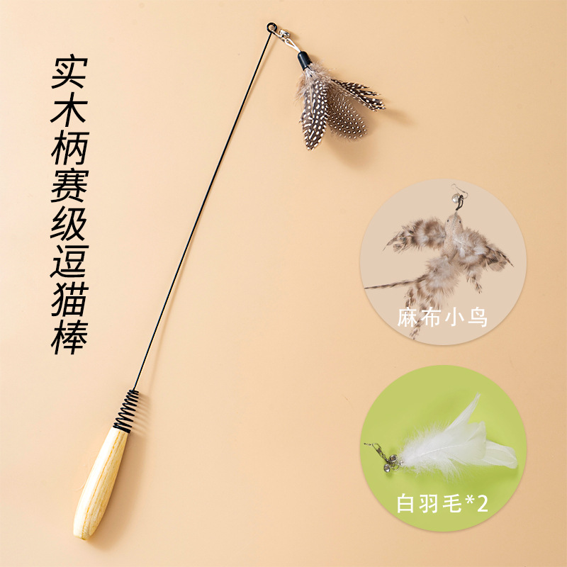 • 나무 손잡이 고양이 놀리는 막대 + 깃털 교체 헤드