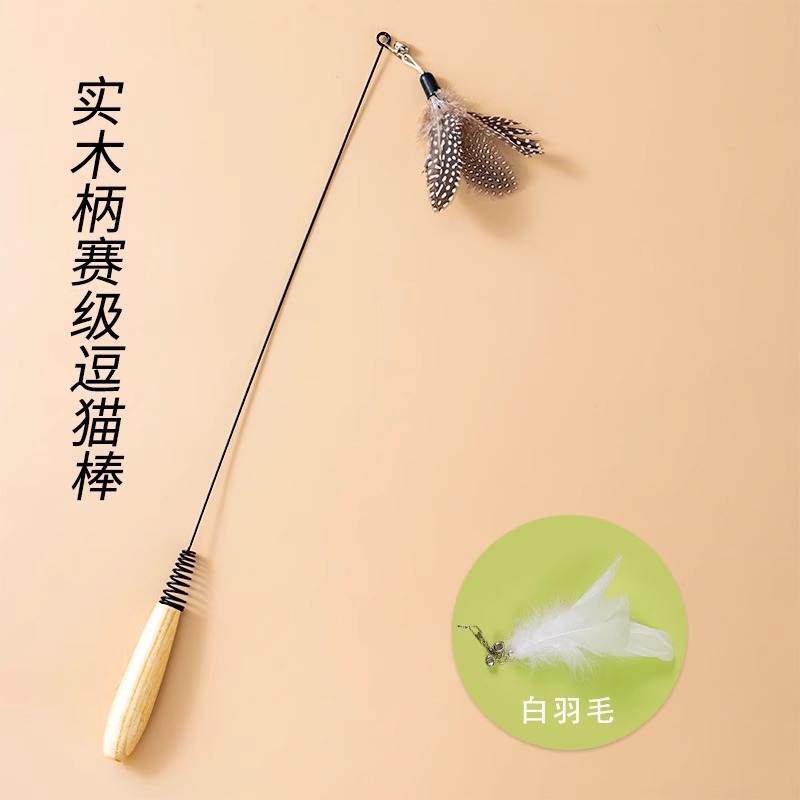 • 나무 손잡이 고양이 놀리는 막대 + 흰색 깃털 교체 헤드