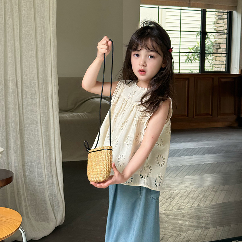 Elmo Beibei 여아 베이비 포레스트 리조트 스타일 디자인 중공 자수 달콤한 레이스 조끼 민소매 탑