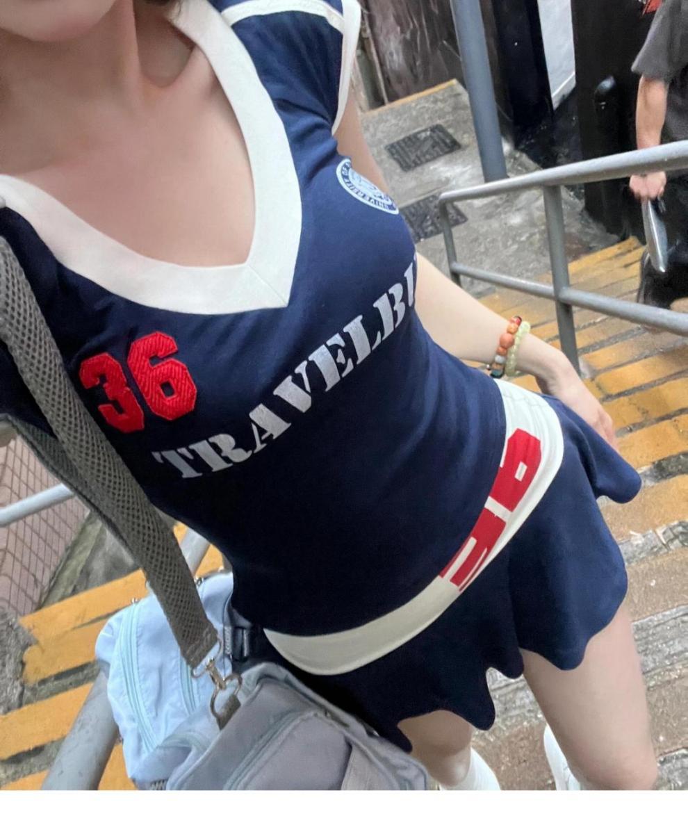 아메리칸 컬리지 스타일 슈트 핫걸 레터 스플라이싱 브이넥 반팔 탑 A라인 슬리밍 스커트 여성 여름 투피스 세트스토어 가기