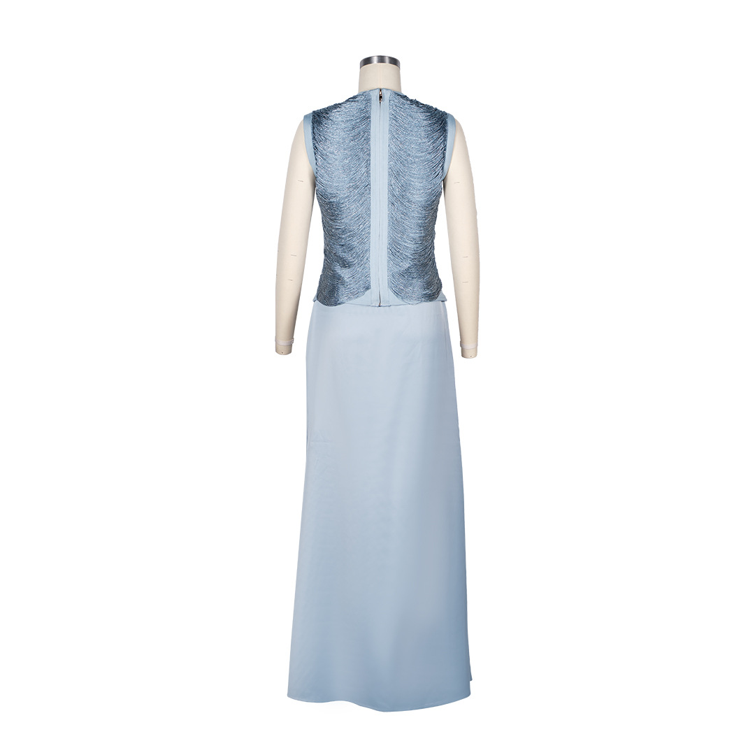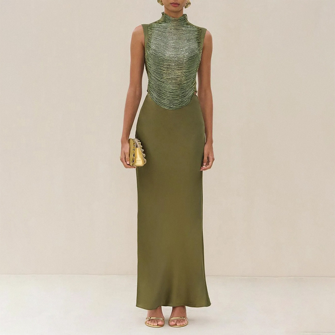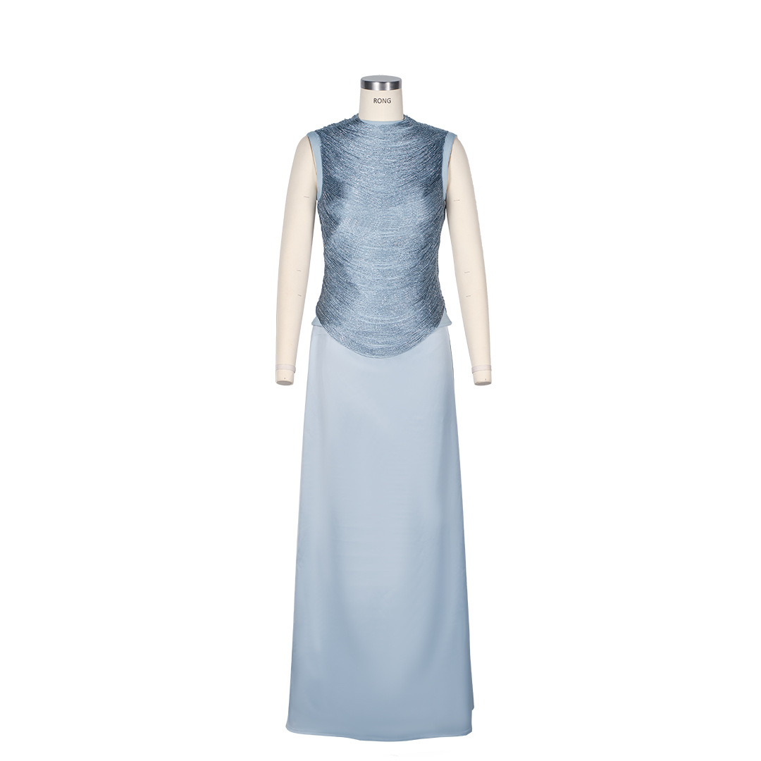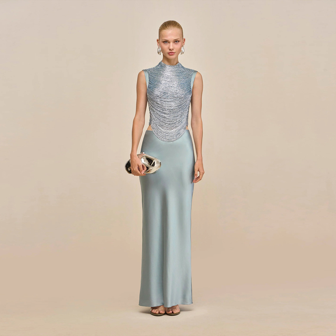 여성을위한 하이 엔드 투피스 양복 여름 새로운 민소매 하이 넥 태슬 스플 라이스 탑 새틴 스커트 슈트