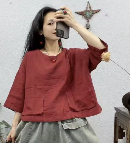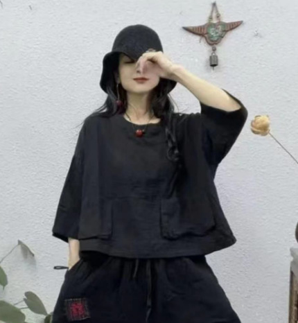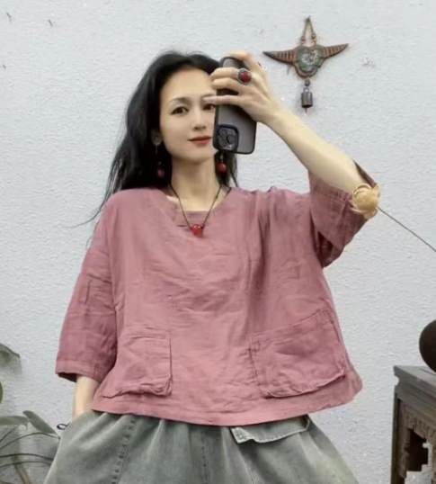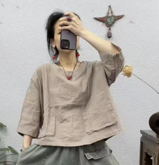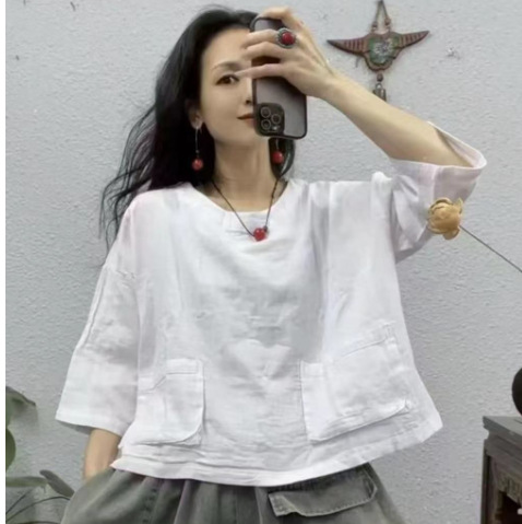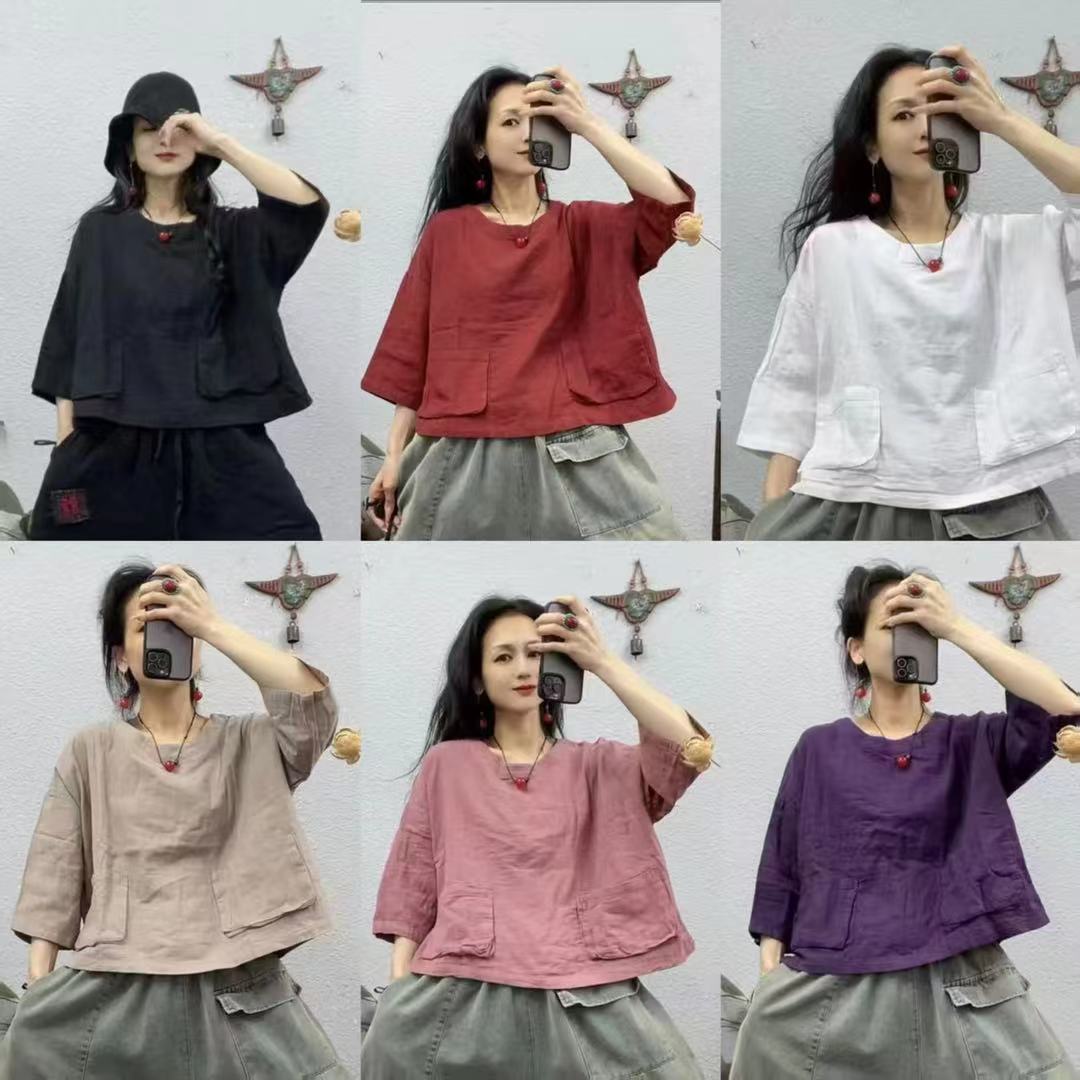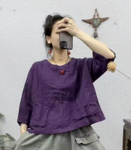 2025 새로운 면 셔츠 여성상의 더블 레이어 면사 7부 소매 대형 버전 뚱뚱한 MMT 셔츠 유럽과 미국의 대형 버전스토어 가기