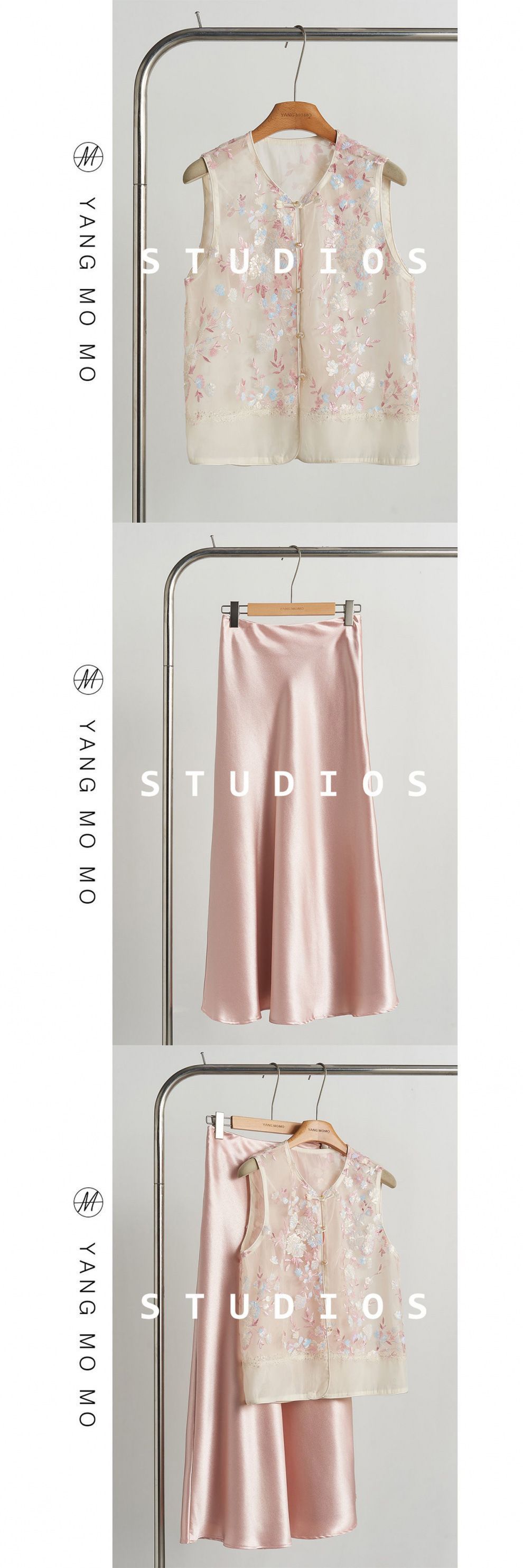 새로운 중국 스타일의 가벼운 민족 스타일 Tulle 스팽글 수 놓은 양복 조끼 아세테이트 스커트 정장 여성 여름 착용