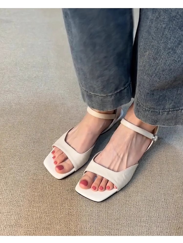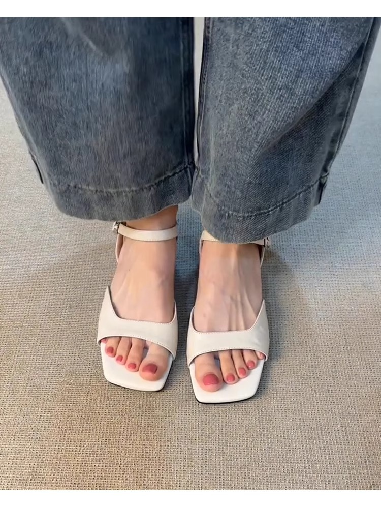 부드러운 가죽 버전 ~ 프렌치 레트로 심플 부드러운 가죽 버클 샌들 여성용 새로운 다용도 로우 힐 중공 로마 신발스토어 가기