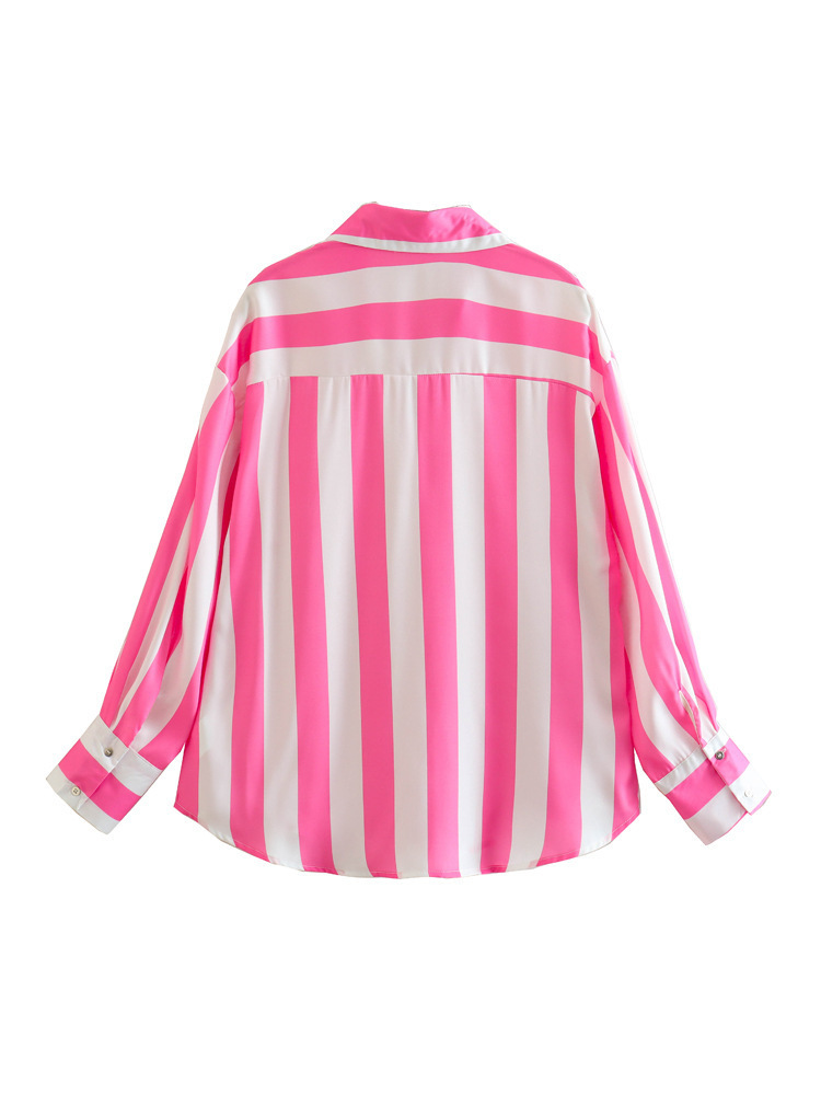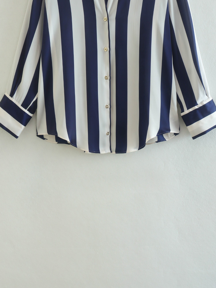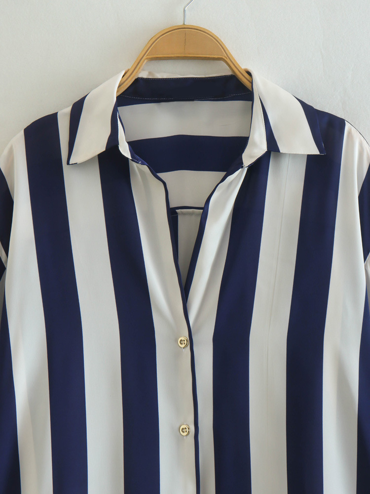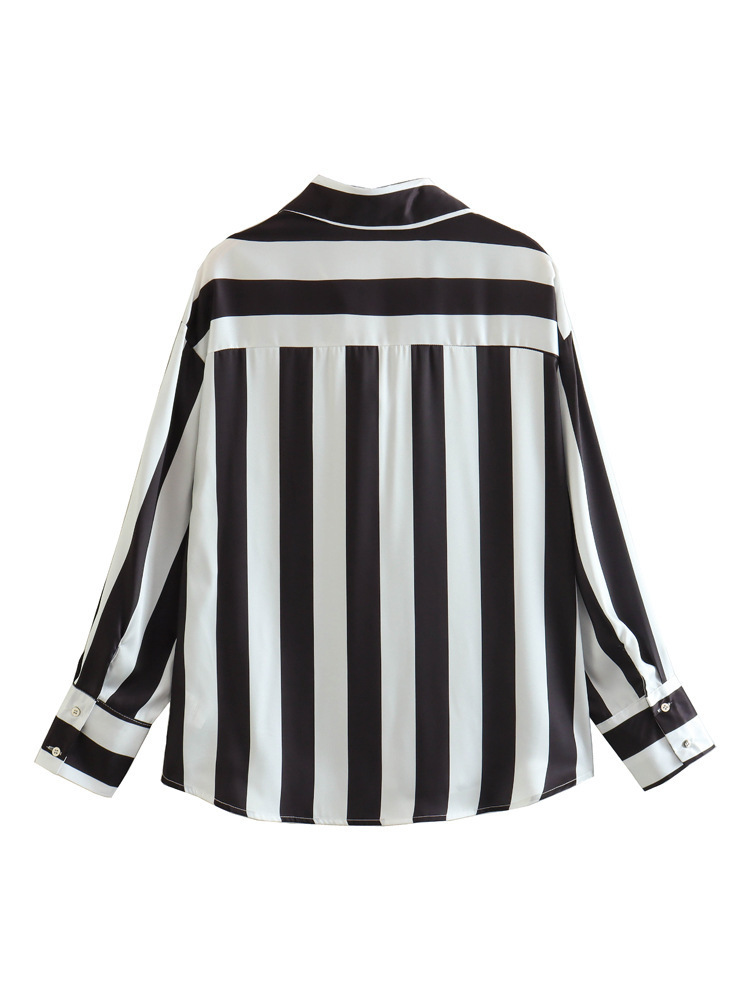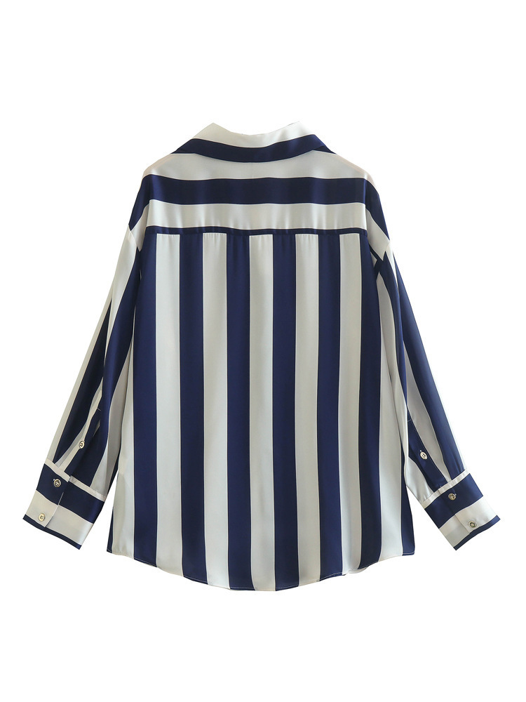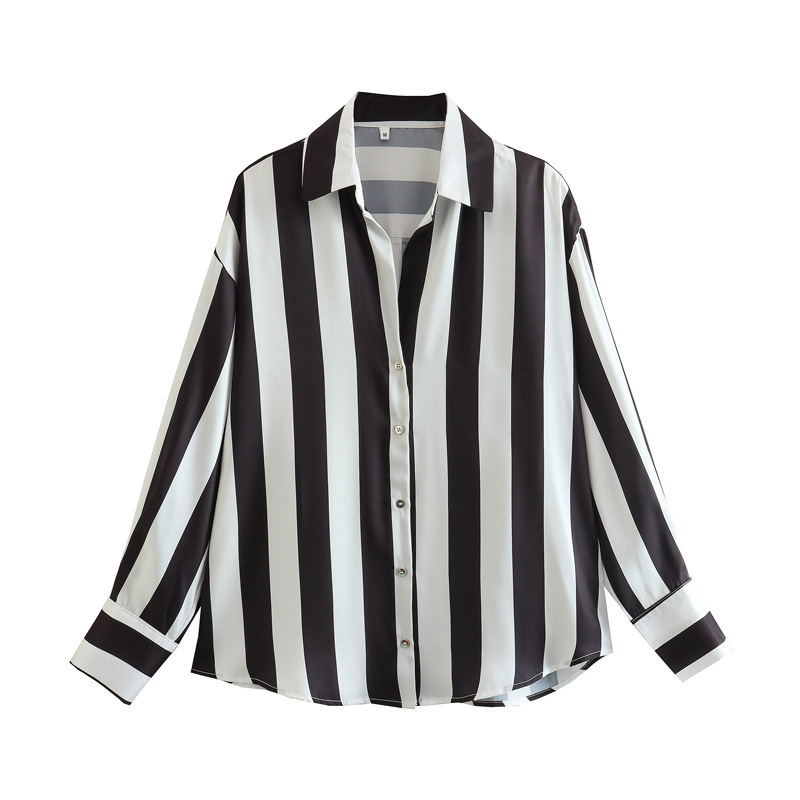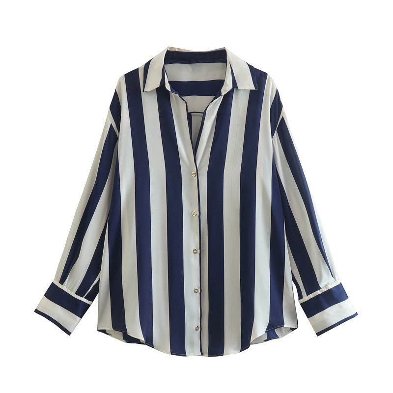 대외 무역 주문 도매 봄 유럽과 미국 스타일의 인쇄 줄무늬 실크 새틴 질감 드레이프 셔츠 여성용스토어 가기