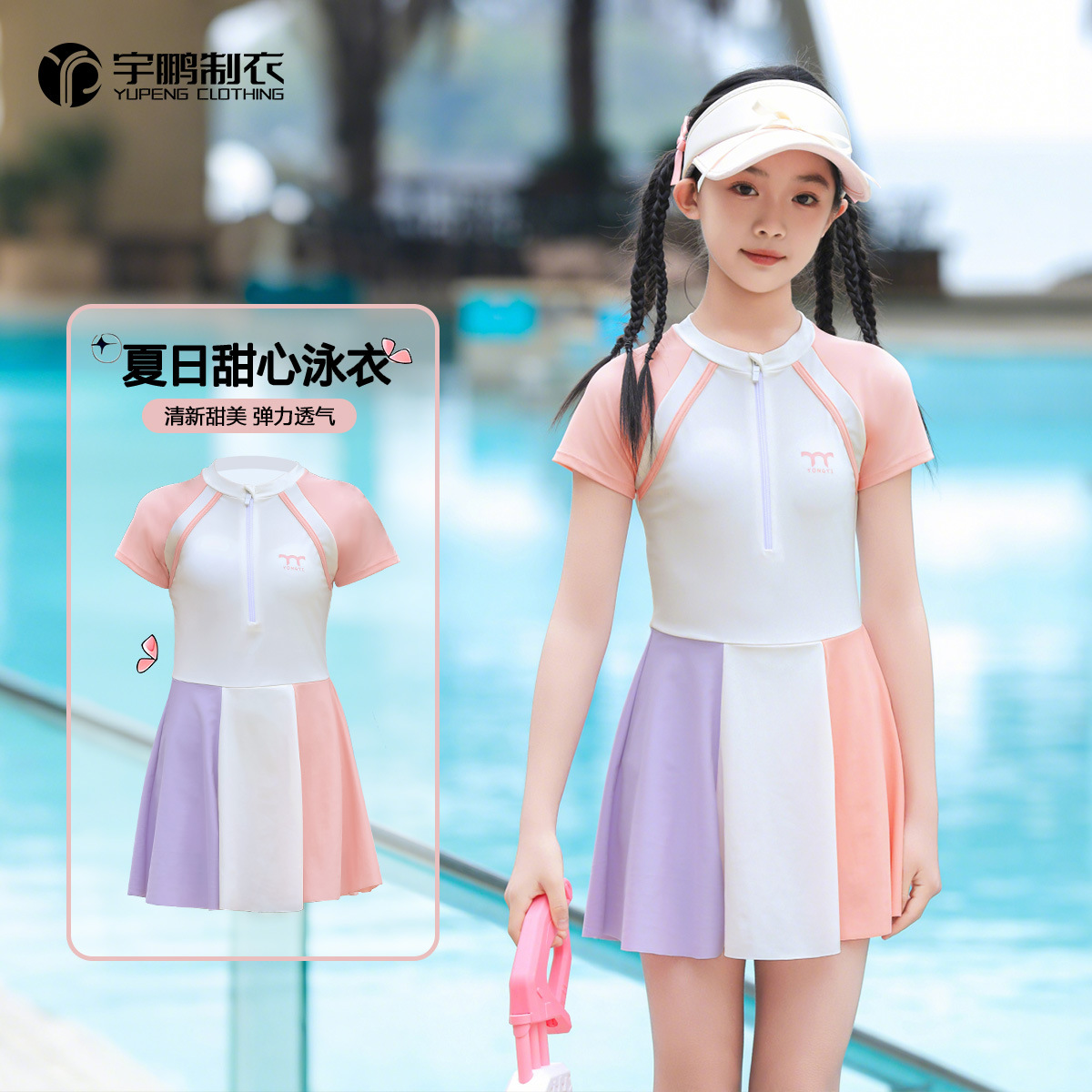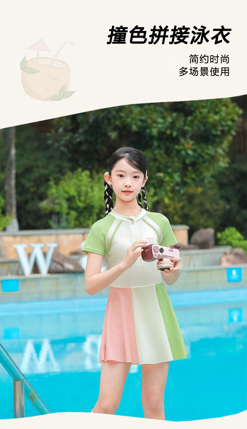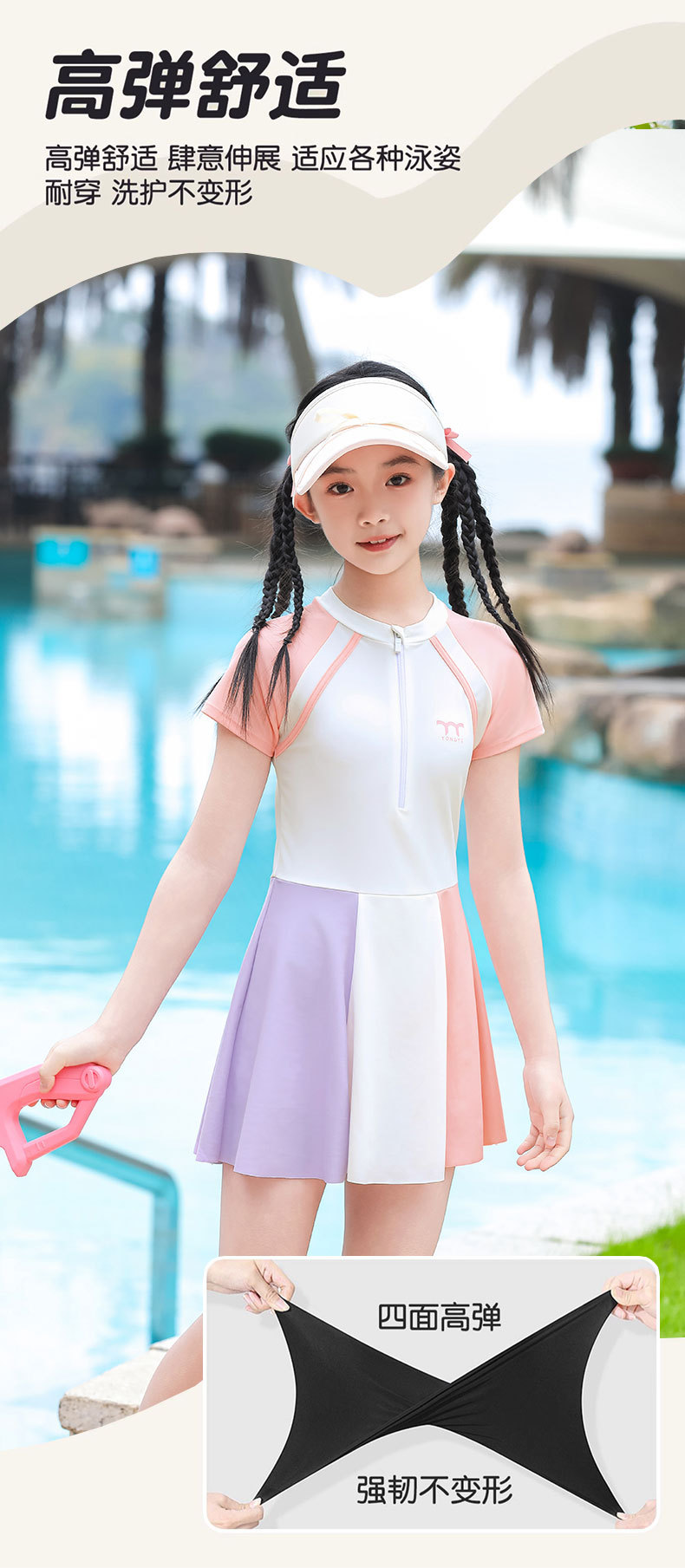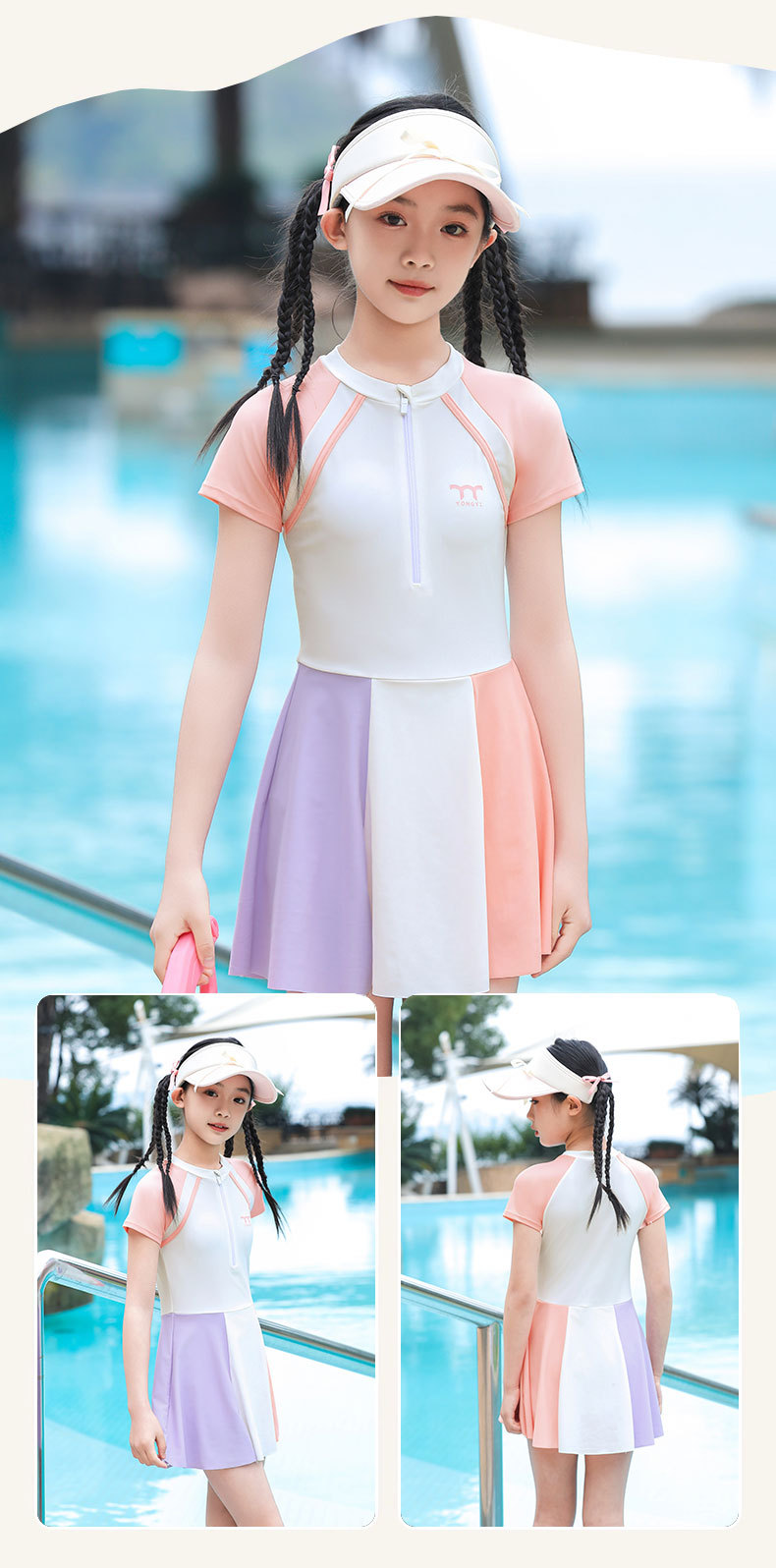 소녀들을 위한 새로운 어린이 수영복, 컬러 블록 원피스 스커트 스타일, 보수적이고 슬림하고 달콤한 학생 수영 훈련 휴가 수영복스토어 가기