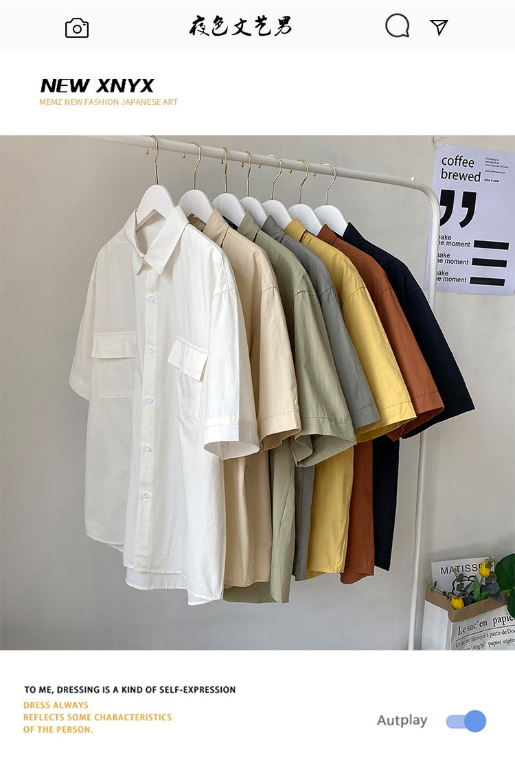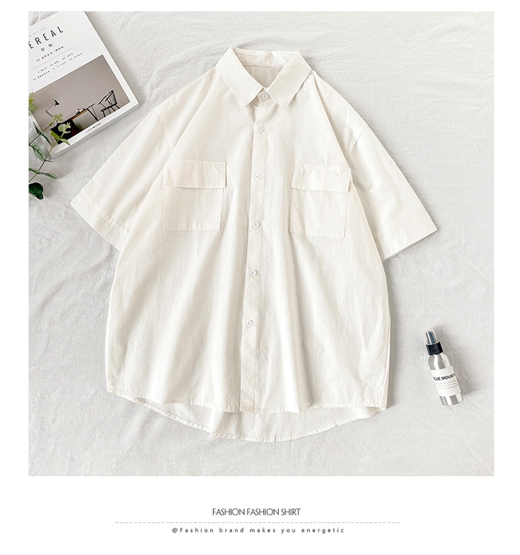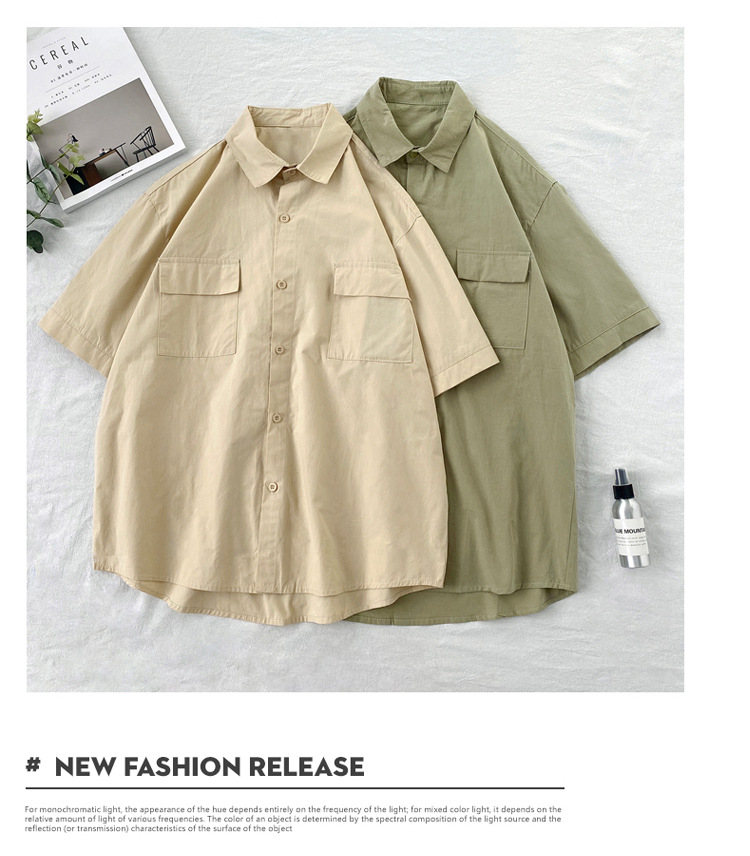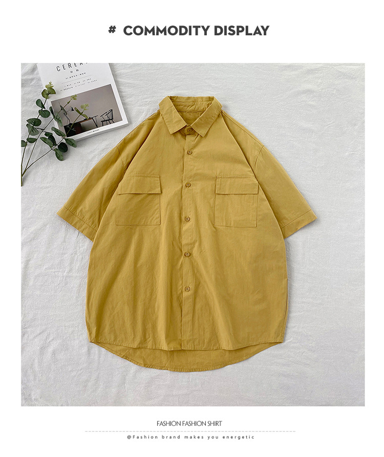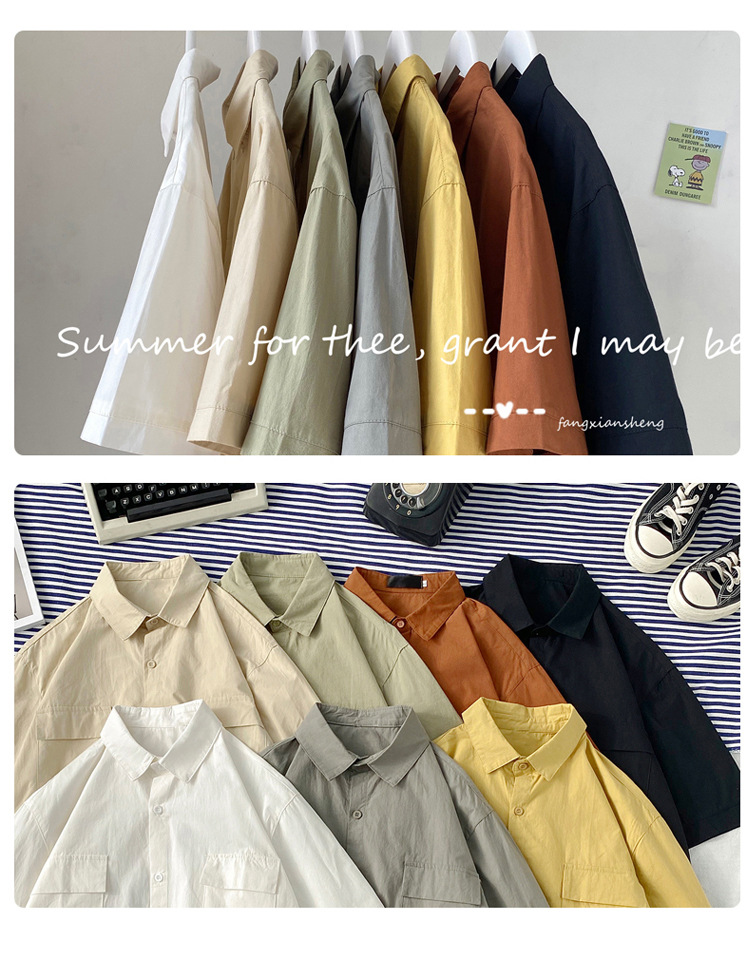 일본 솔리드 컬러 5부 소매 셔츠 남성용 루즈 여름 인 홍콩 스타일 커플 니치 미드 슬리브 라펠 셔츠 재킷스토어 가기