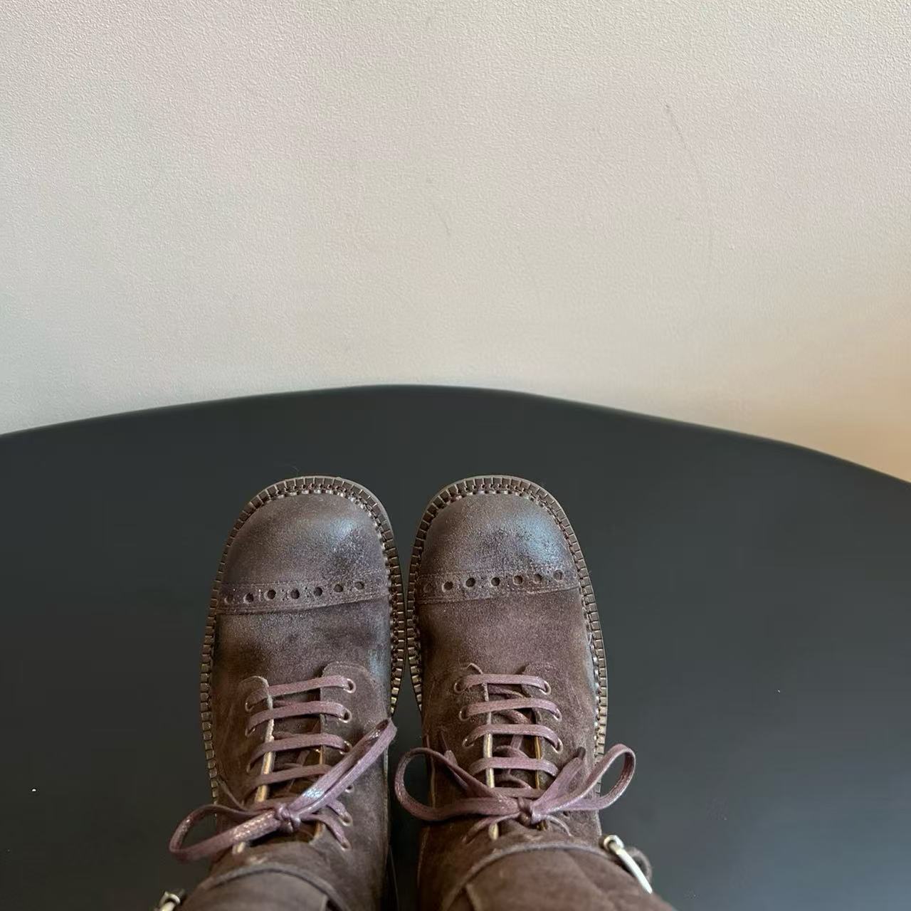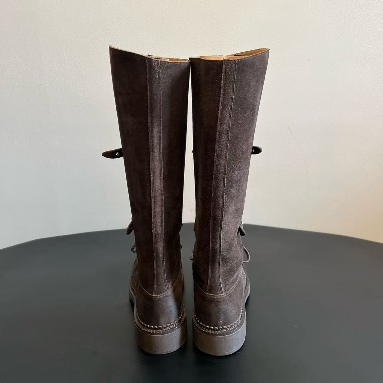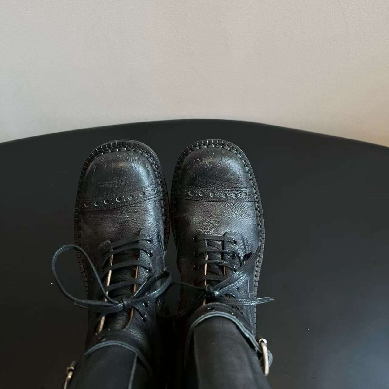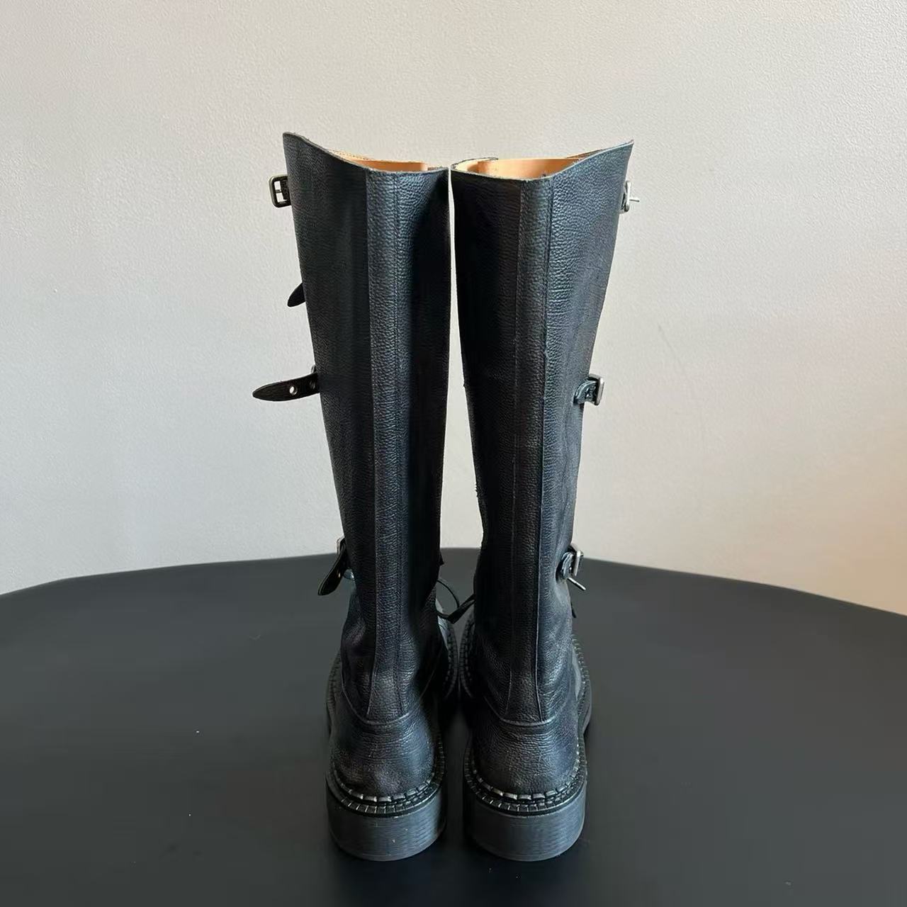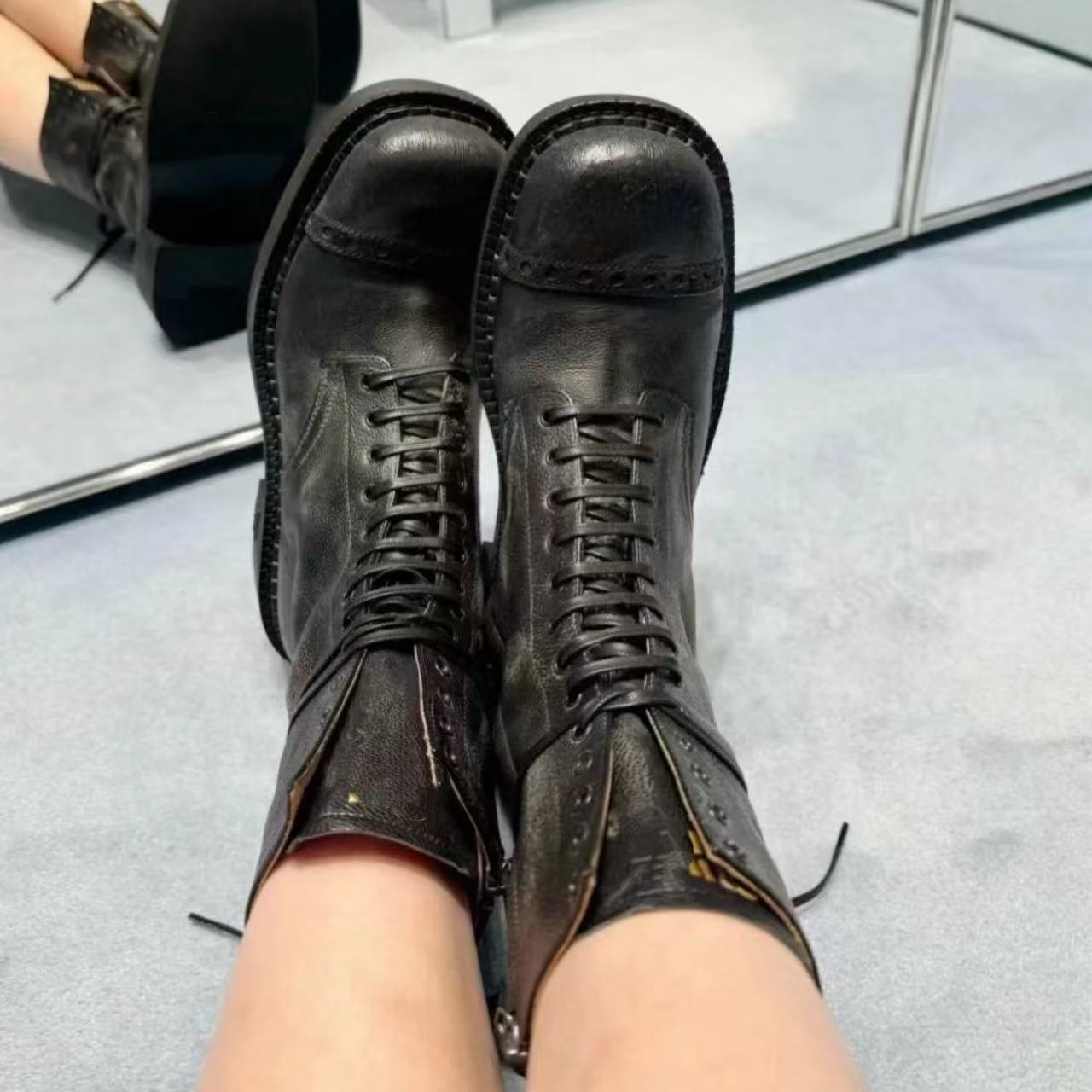 Miu Catwalk 여성용 키가 큰 마틴 부츠 2024 여성용 새로운 레트로 스퀘어 토 오토바이 부츠 짧은 부츠스토어 가기