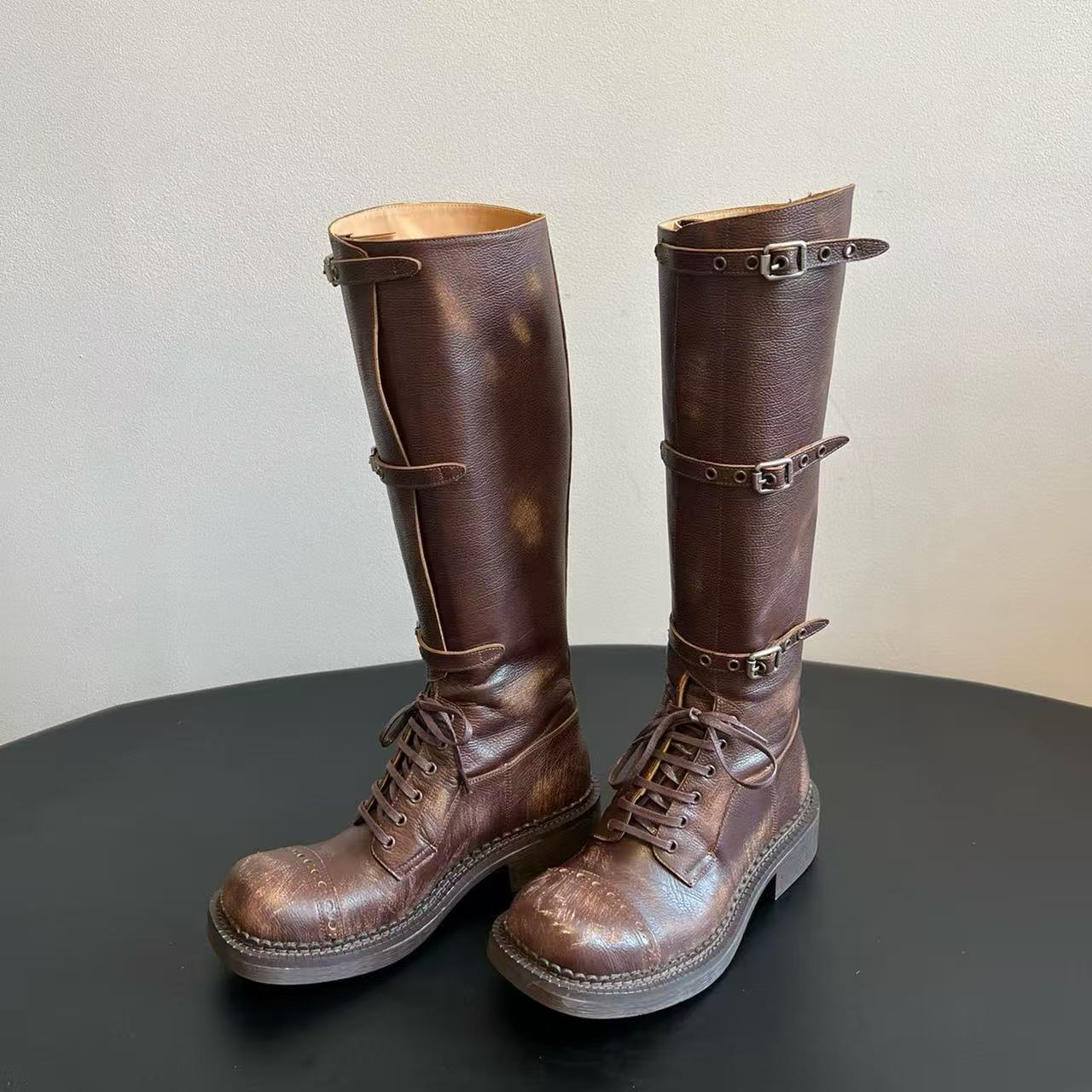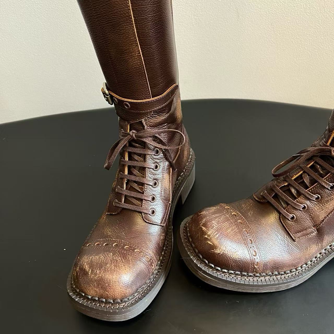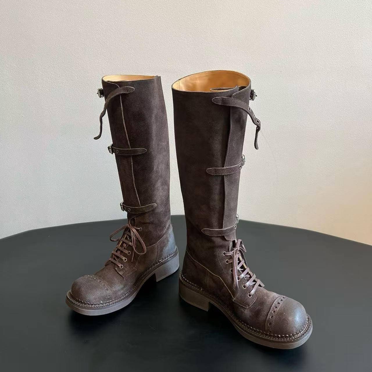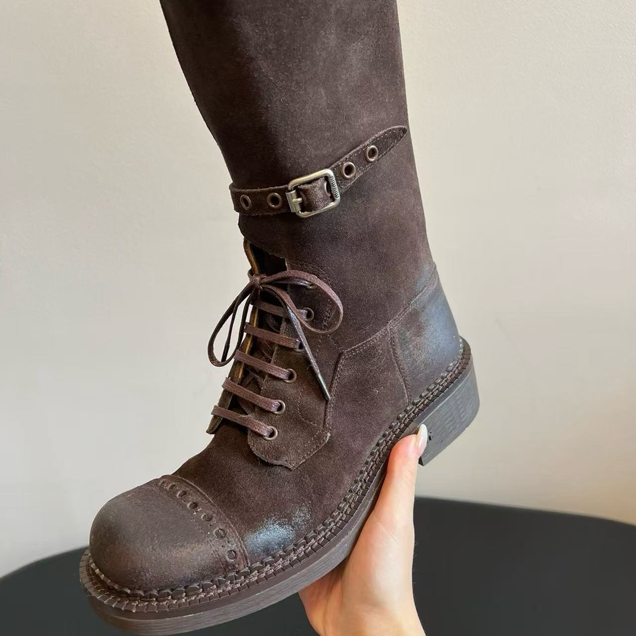 Miu Catwalk 여성용 키가 큰 마틴 부츠 2024 여성용 새로운 레트로 스퀘어 토 오토바이 부츠 짧은 부츠