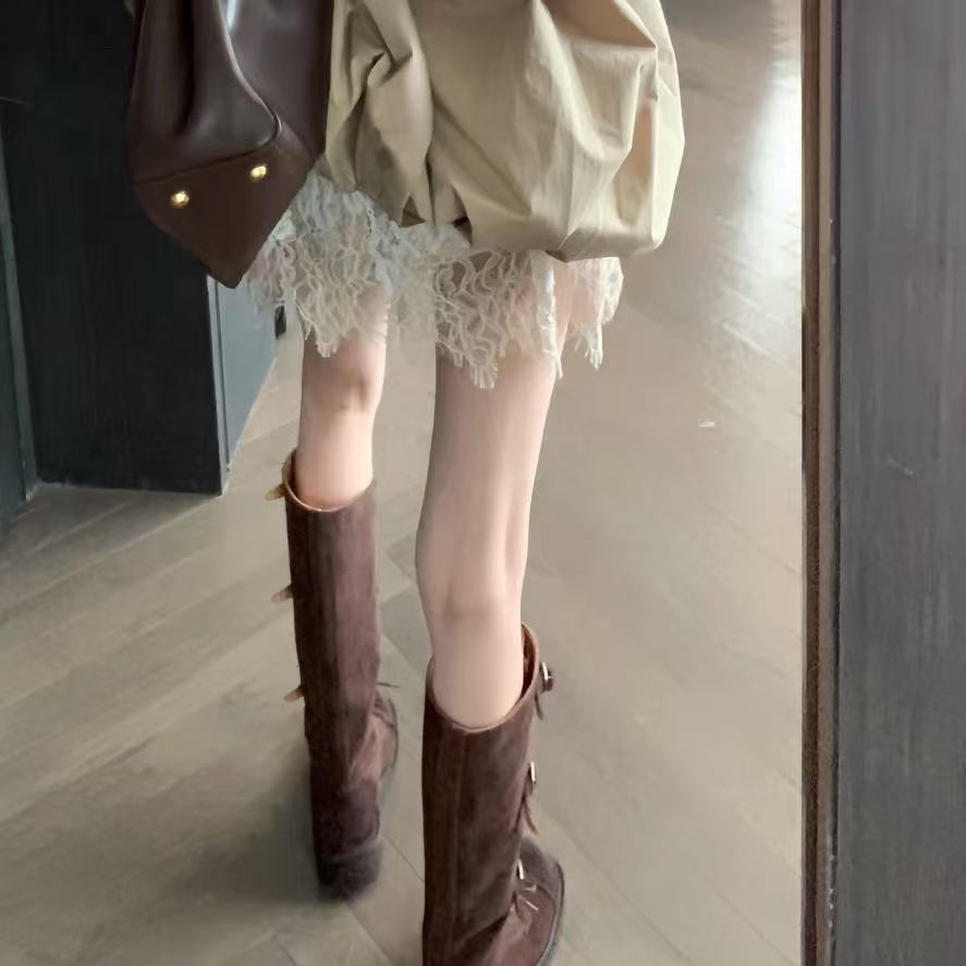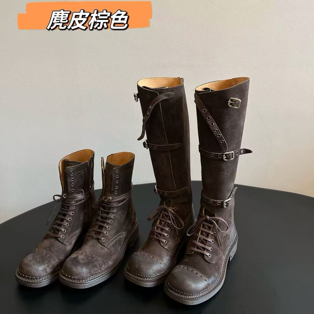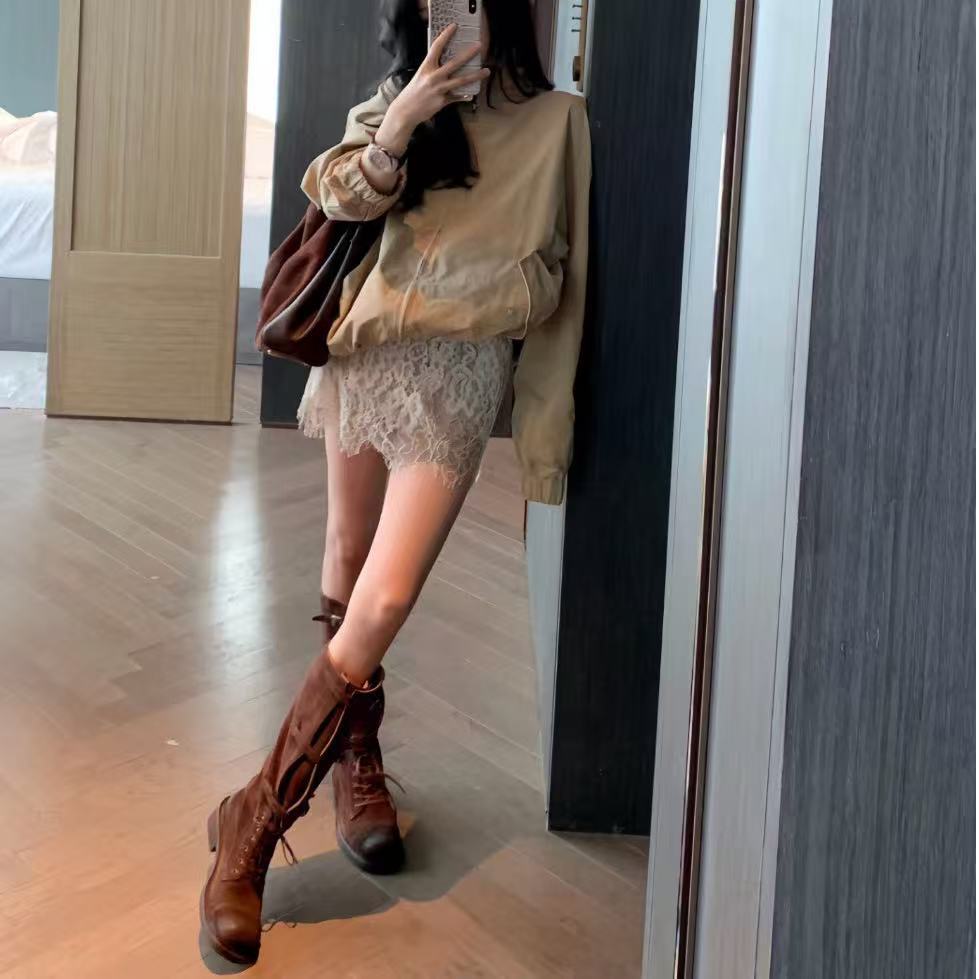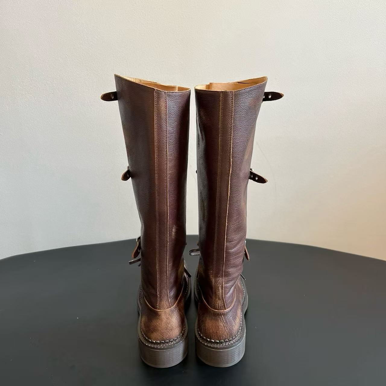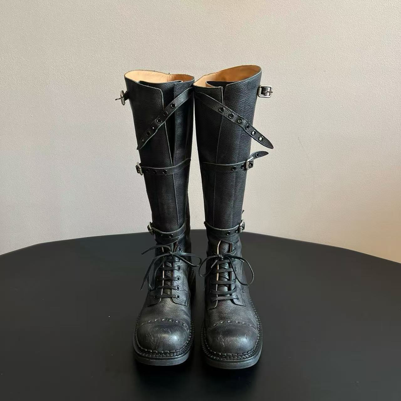 Miu Catwalk 여성용 키가 큰 마틴 부츠 2024 여성용 새로운 레트로 스퀘어 토 오토바이 부츠 짧은 부츠