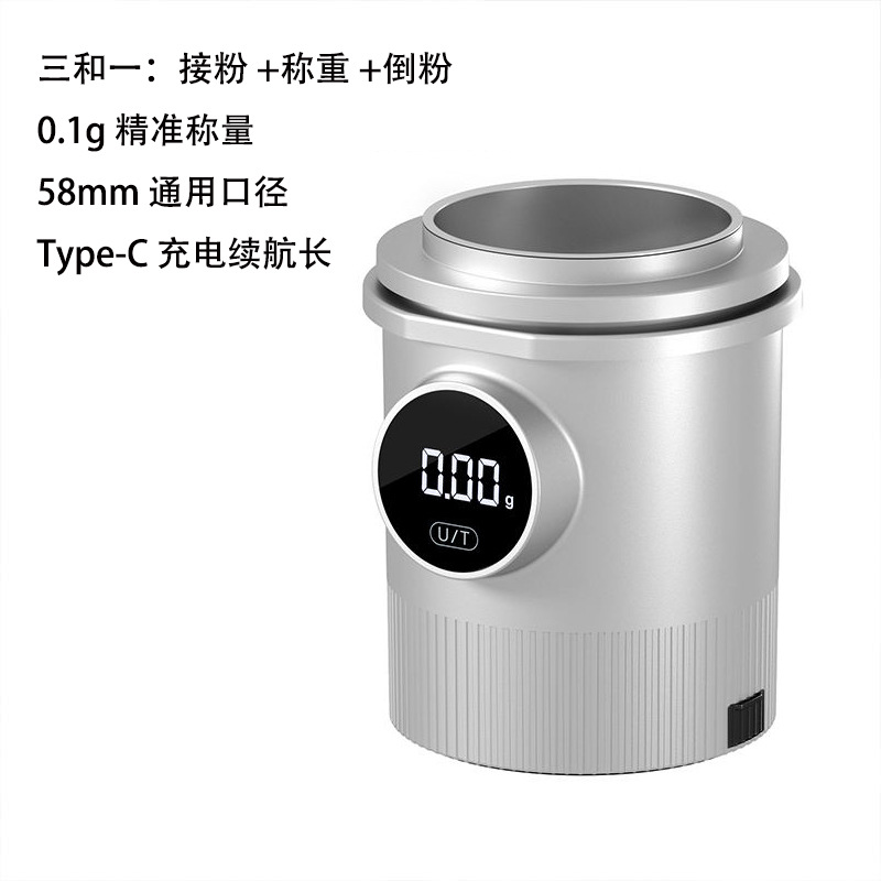 三合一设计:集「接粉、称重、倒粉」于一体,一杯在手即可接收研磨粉并实时精准称量 。 精度:0.1g分度值电子称重,助力咖啡爱好者精确掌控粉水比 。 优质材质:(内胆食品级304不锈钢)一体成型,坚固耐磨不易变形,使用寿命长 。 Type-C快充:内置大容量锂电池,支持Type-C充电接口,一次充满可连用数日,免换电池烦恼 。 58mm通用口径:符合主流意式咖啡机手柄标准,广泛兼容市面上多款58mm磨豆机和咖啡机手柄。