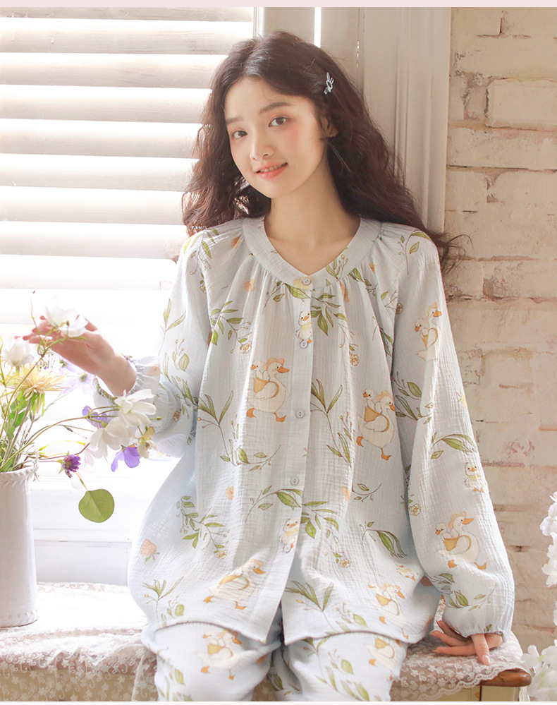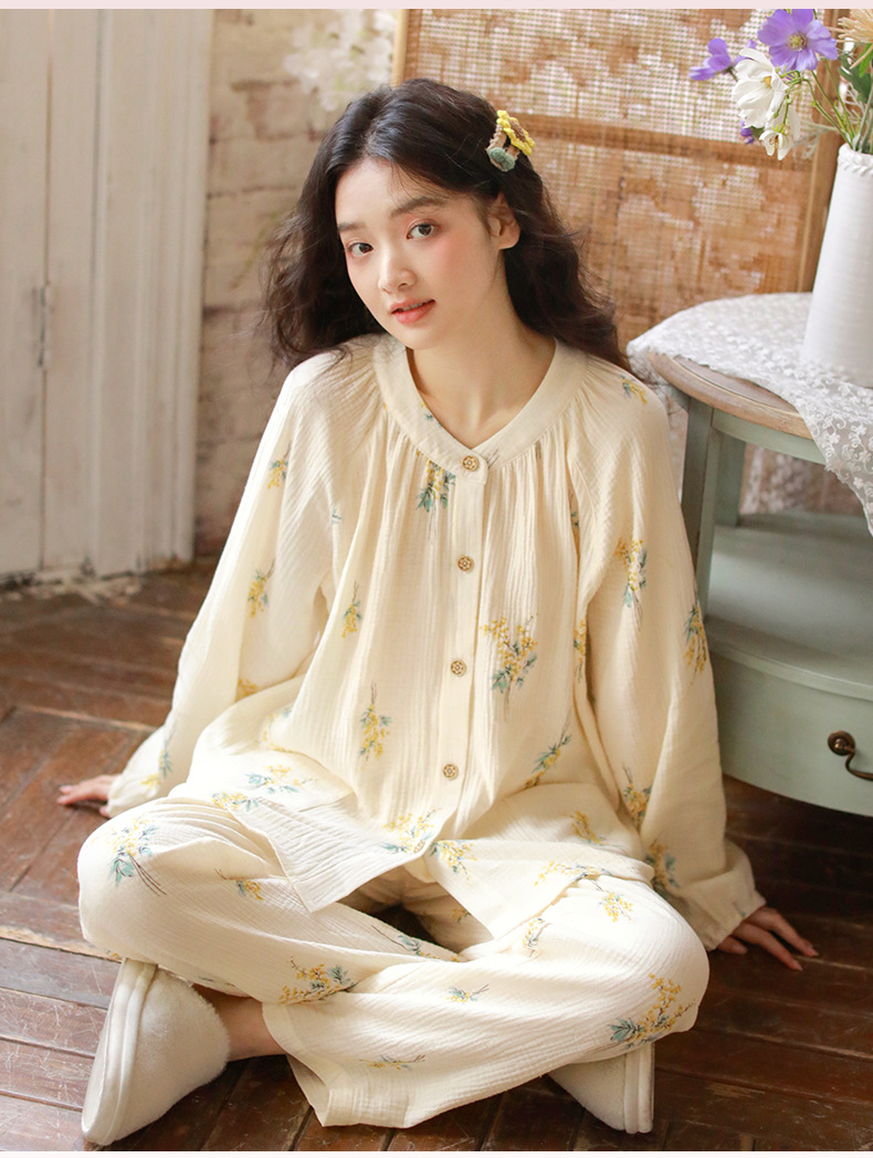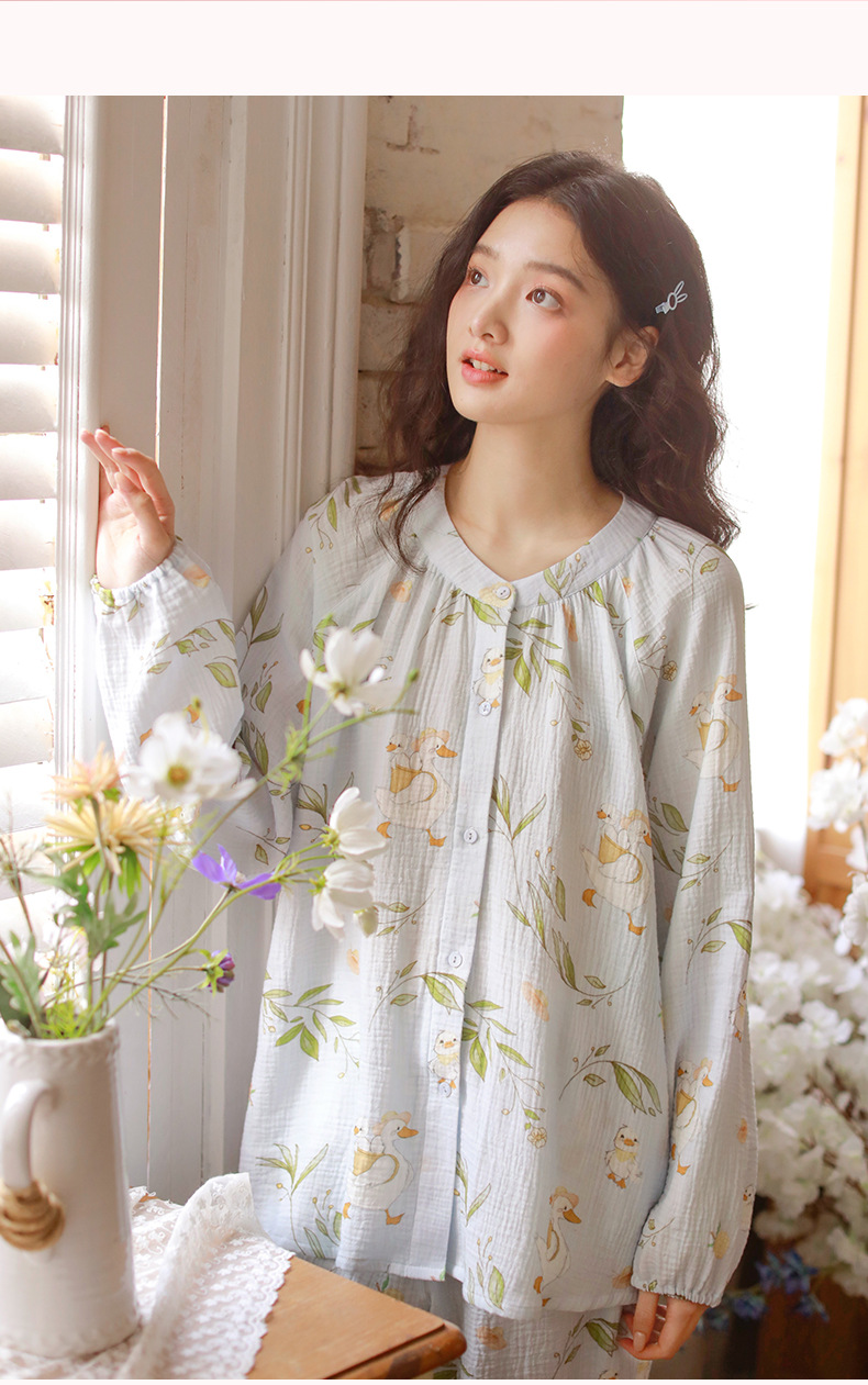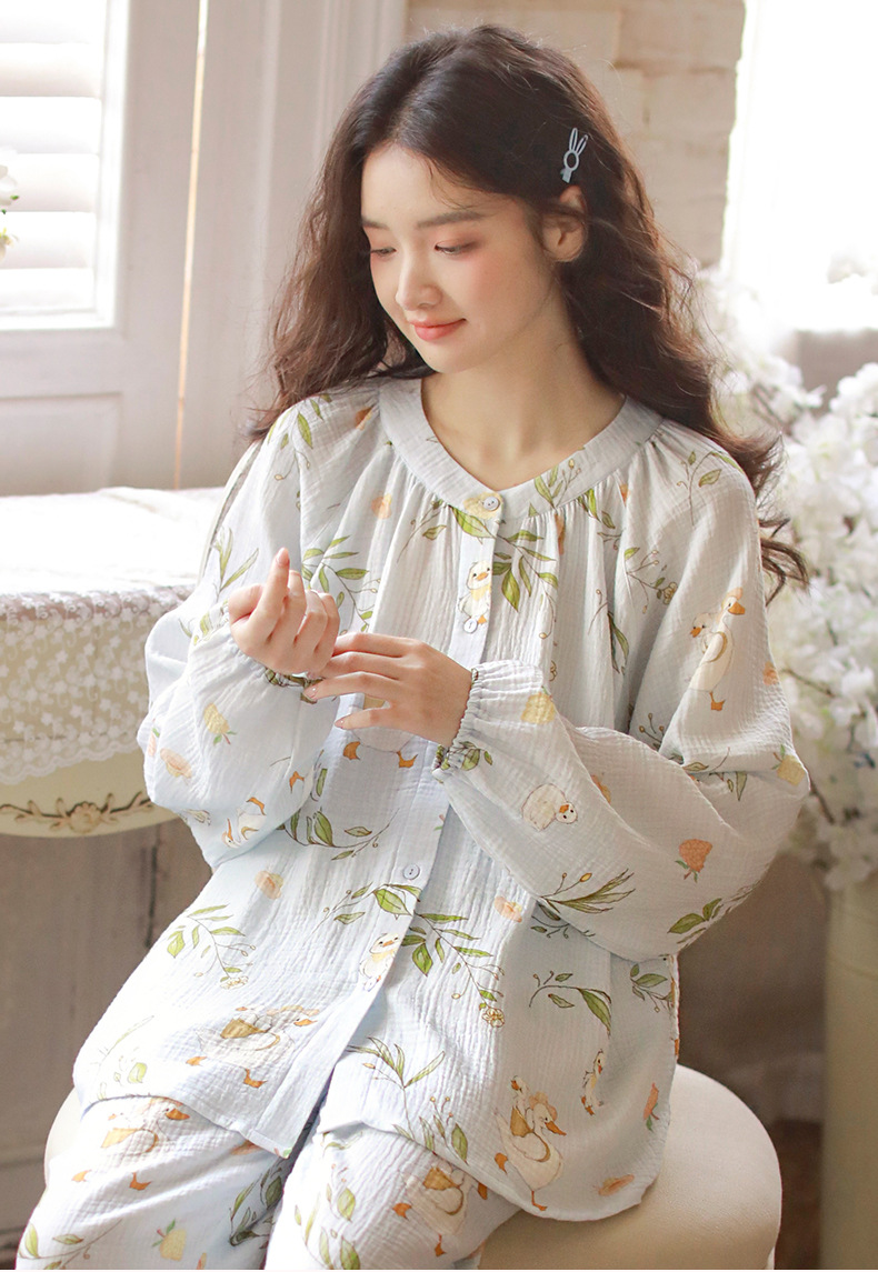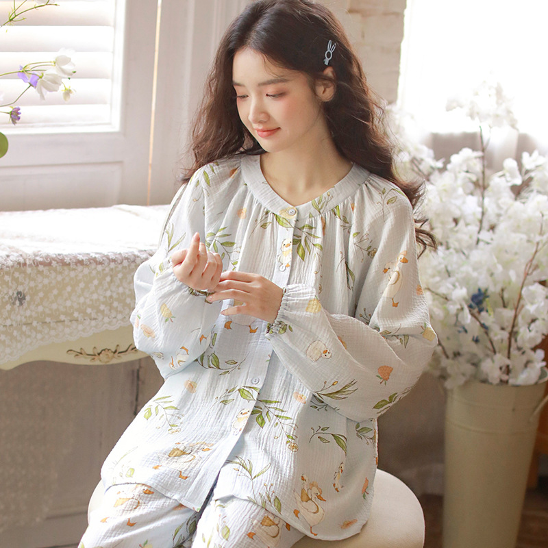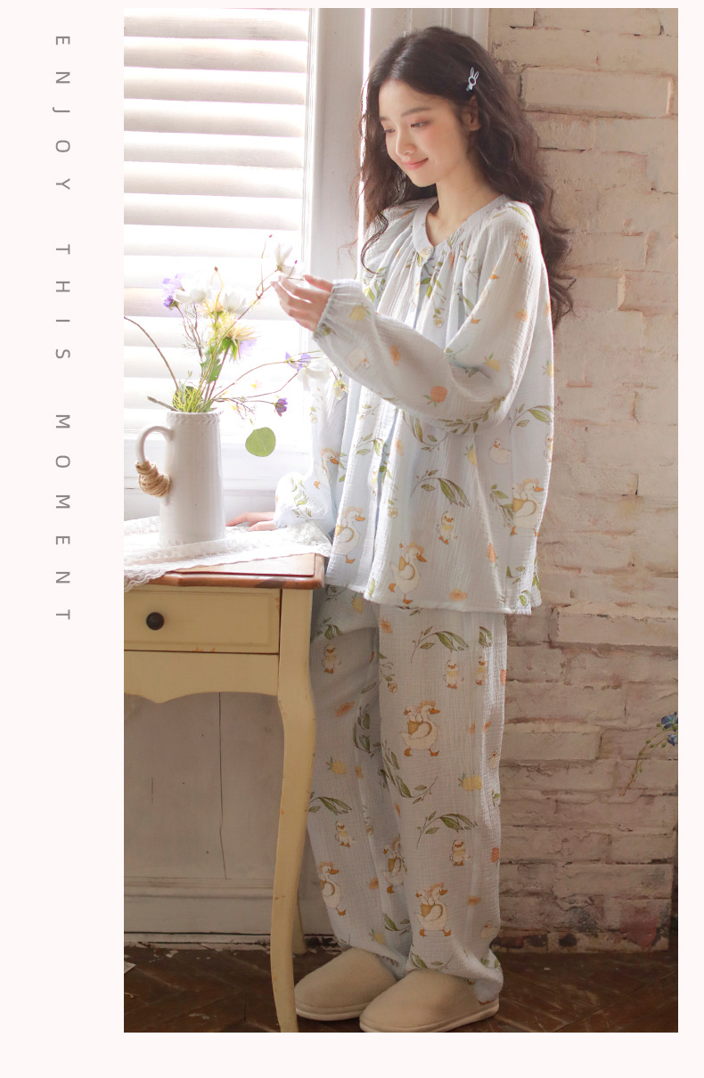 여성을위한 얇은 순수 코튼 거즈 잠옷 긴팔 캐주얼 게으른 인쇄 긴팔 바지 잠옷 여성 홈웨어 세트스토어 가기