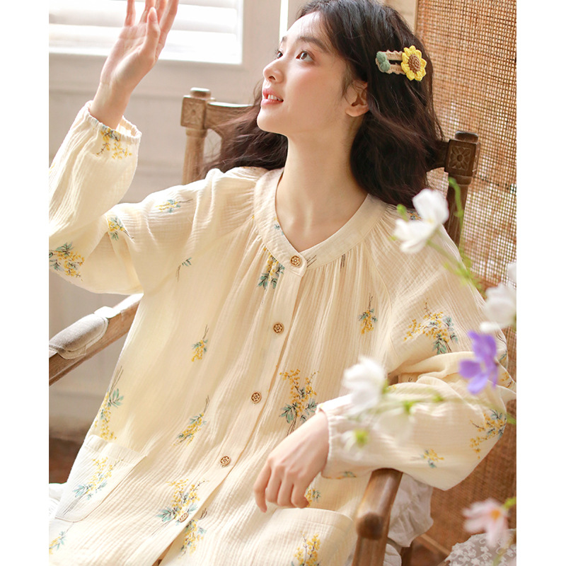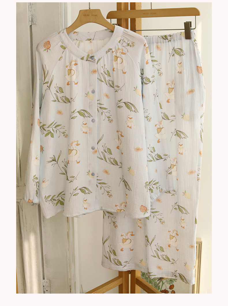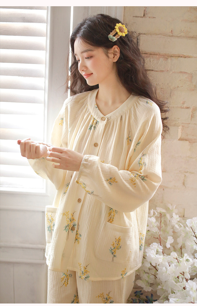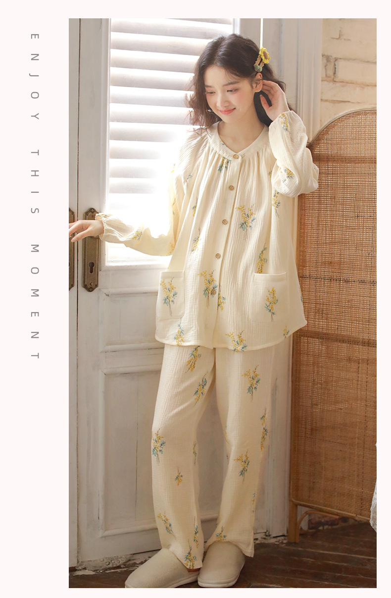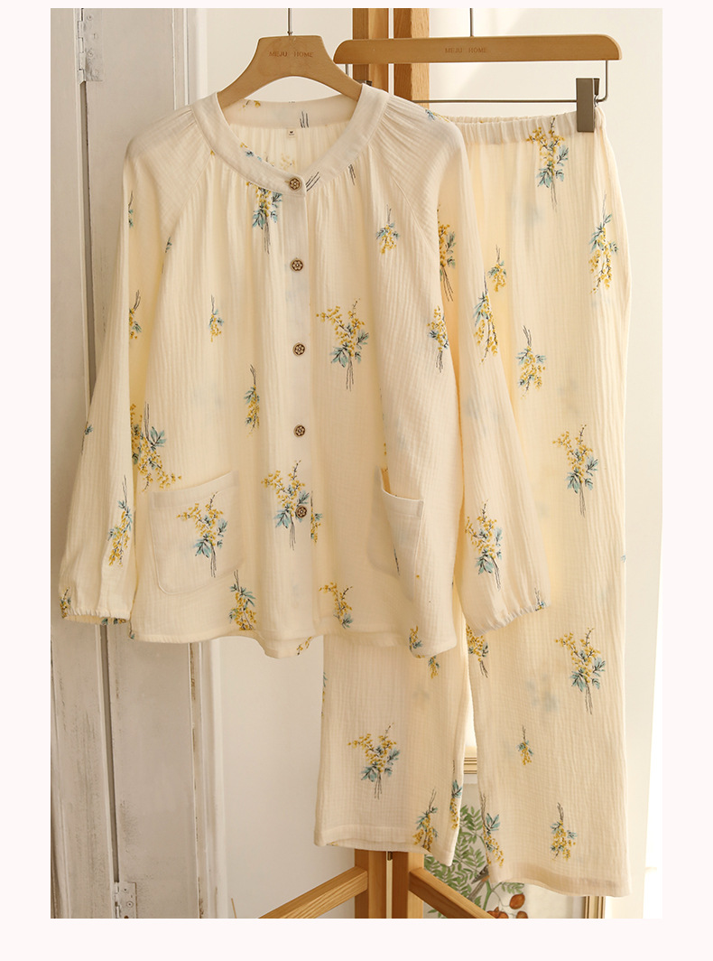 여성을위한 얇은 순수 코튼 거즈 잠옷 긴팔 캐주얼 게으른 인쇄 긴팔 바지 잠옷 여성 홈웨어 세트스토어 가기