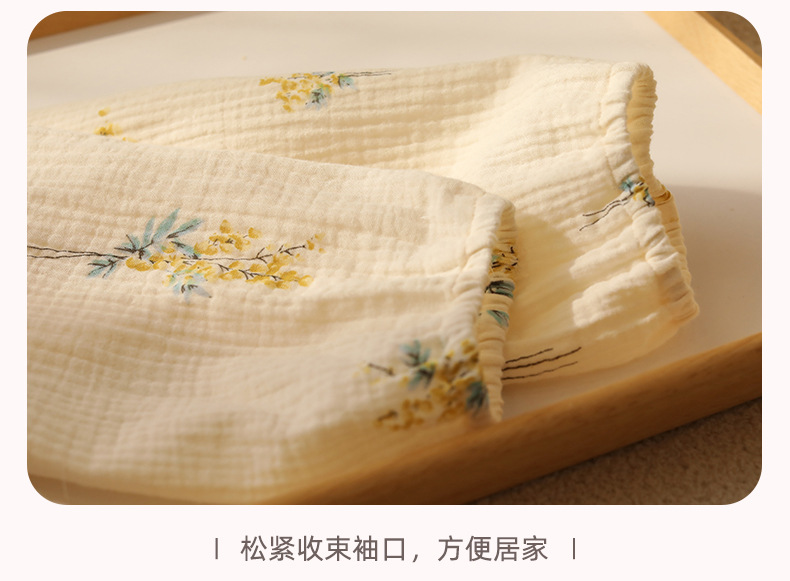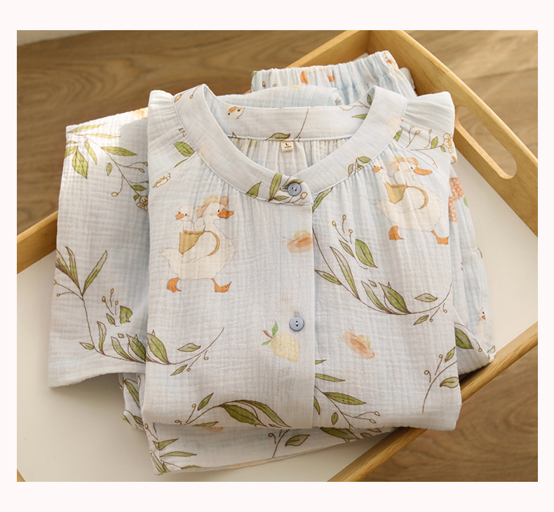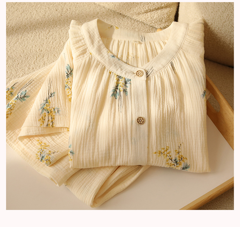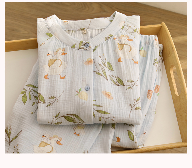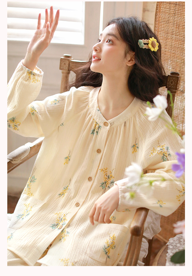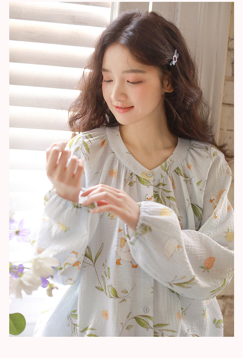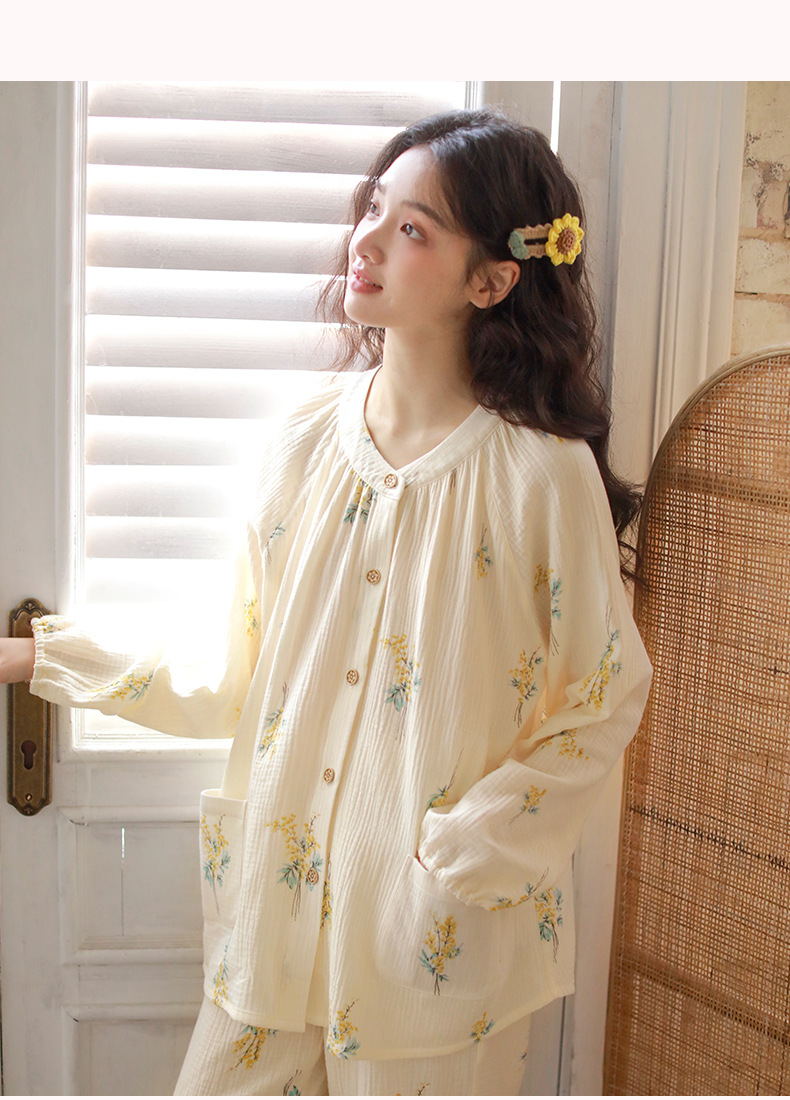 여성을위한 얇은 순수 코튼 거즈 잠옷 긴팔 캐주얼 게으른 인쇄 긴팔 바지 잠옷 여성 홈웨어 세트스토어 가기