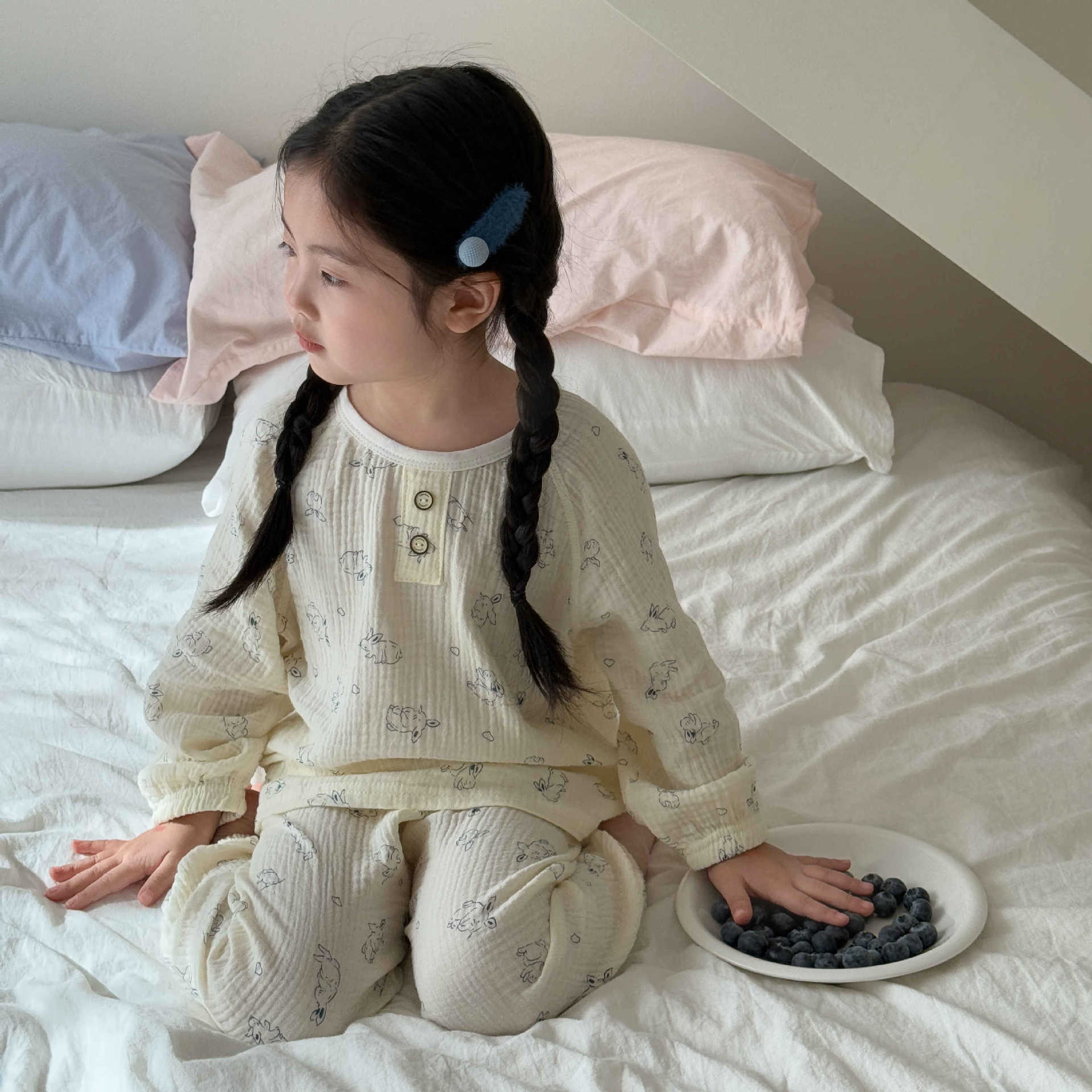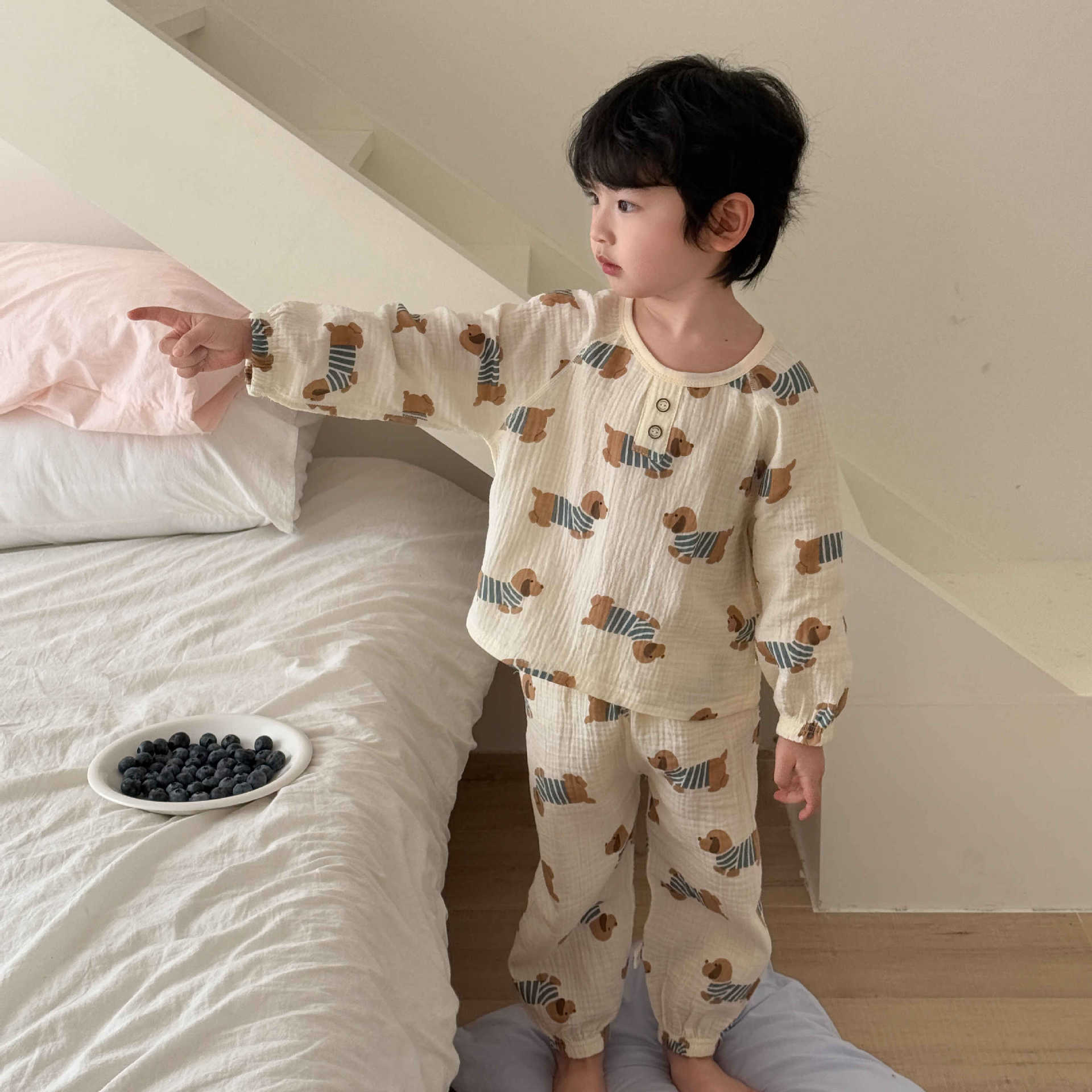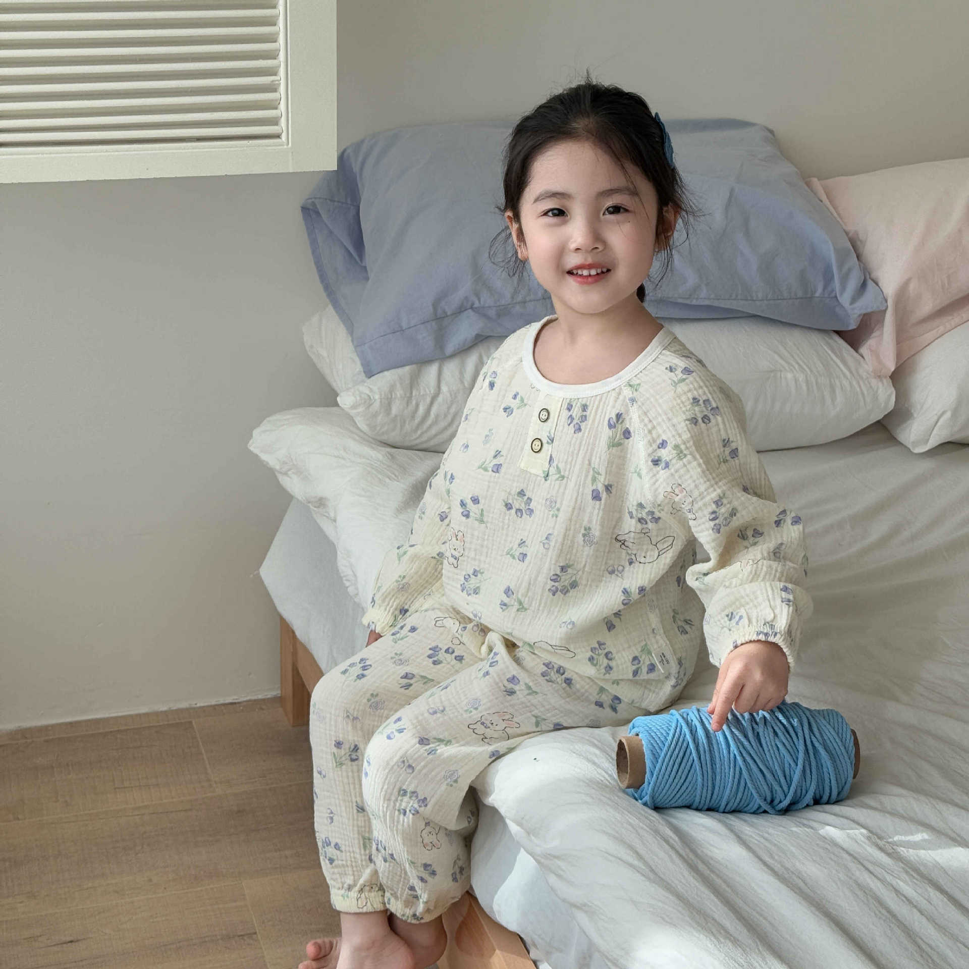 2025 새로운 어린이 뼈없는 순수 코튼 거즈 잠옷 봄과 여름 코튼 거즈 홈 의류 소녀 느슨한 긴팔 에어컨 옷스토어 가기
