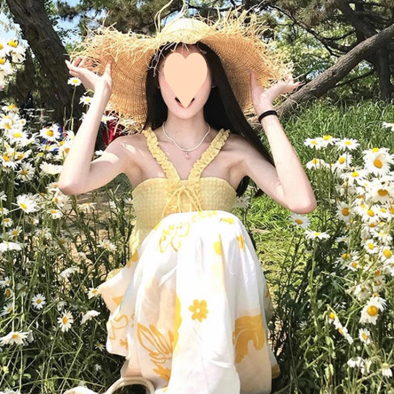 드레이프 플로럴 하프 길이 + 젠틀 홀리데이 스타일 홀터넥 슈트 스커트 여성 여름 민소매 캐미솔 탑 스커트 투피스 세트스토어 가기