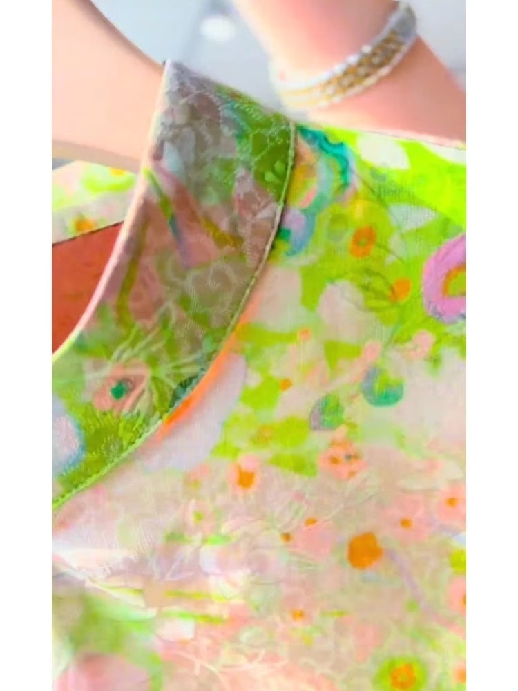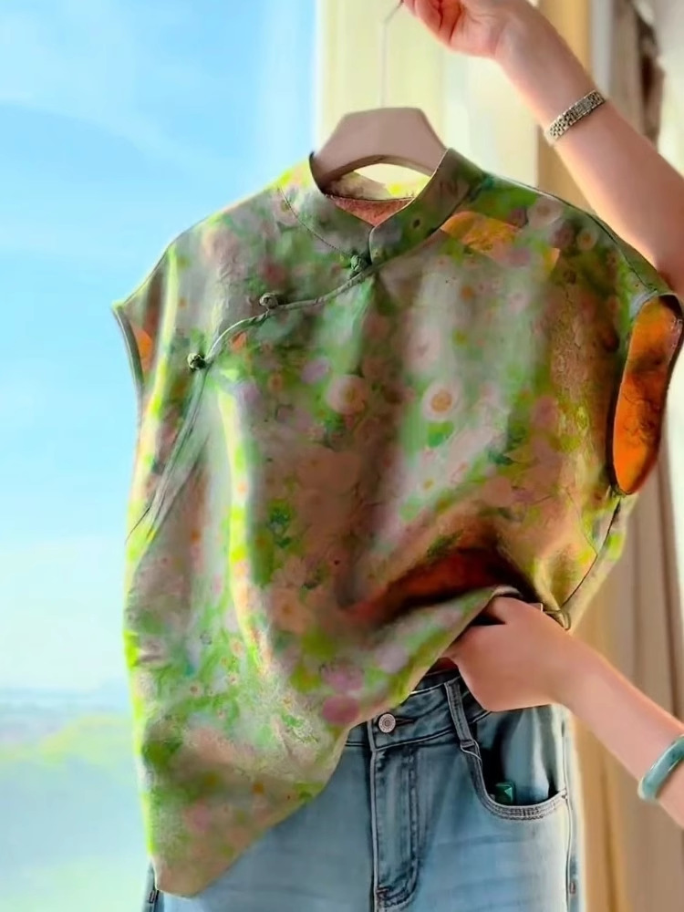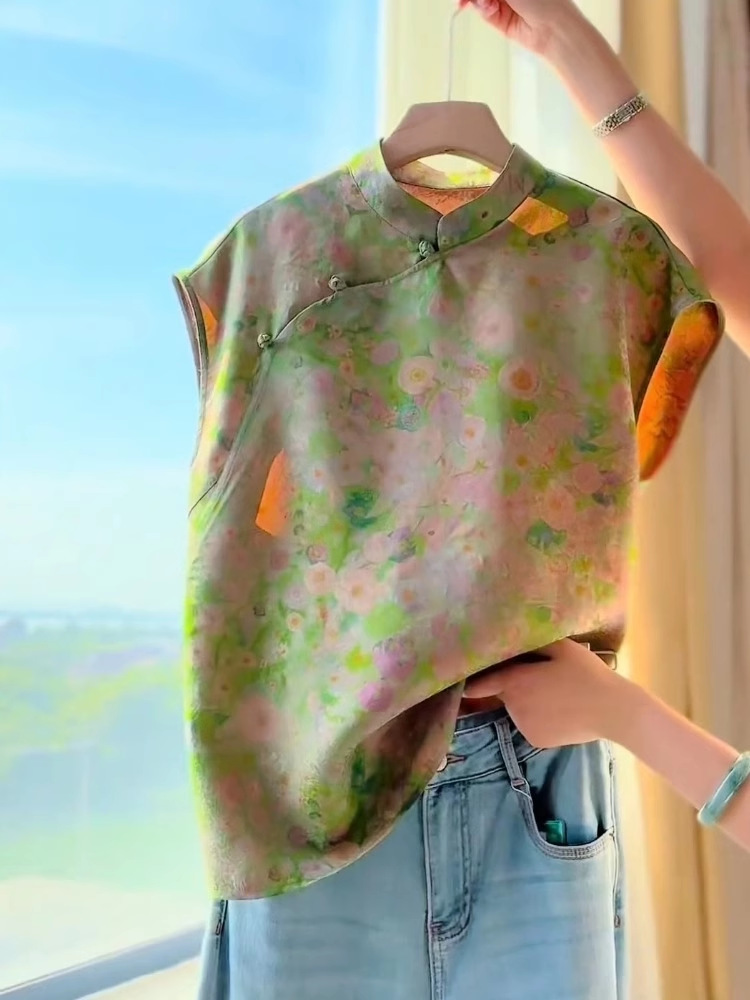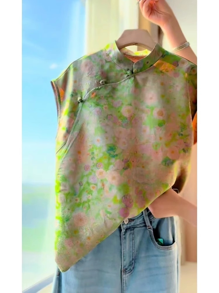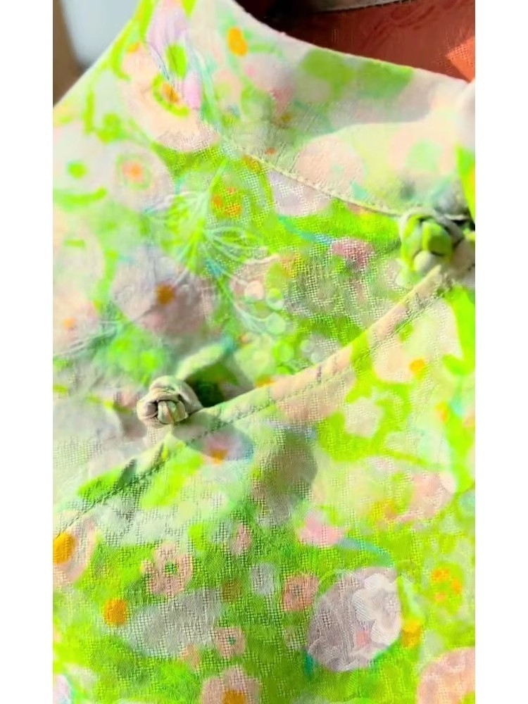 새로운 중국 스타일 녹색 인쇄 대각선 라펠 여름 여성 셔츠 서양식 복고풍 선 기념일 탑 A4227스토어 가기