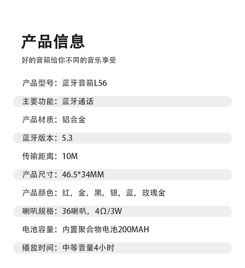 L56 메탈 블루투스 스피커 휴대용 중저음 강화 야외 미니 고품질 오디오 블루투스 5.3