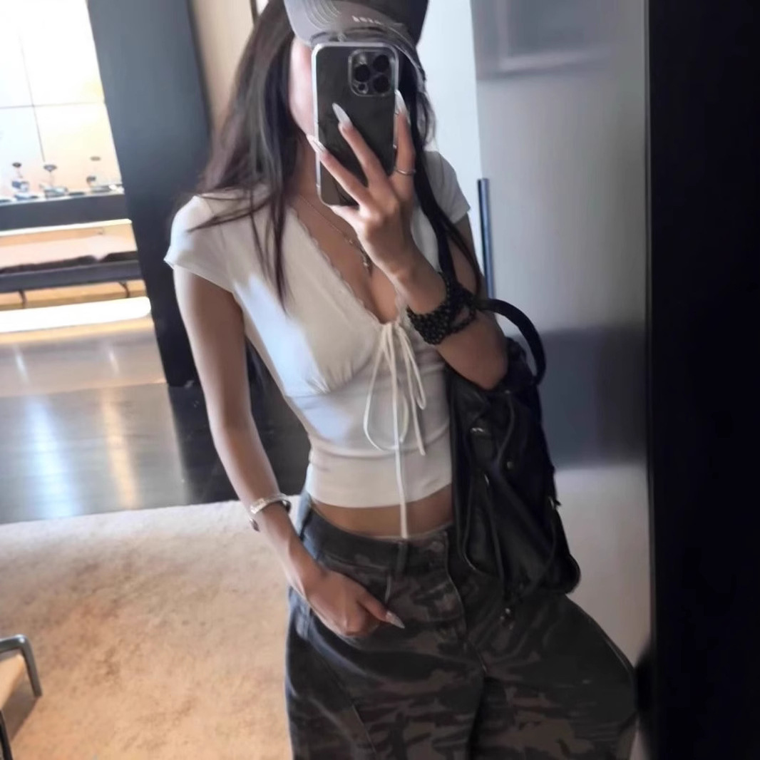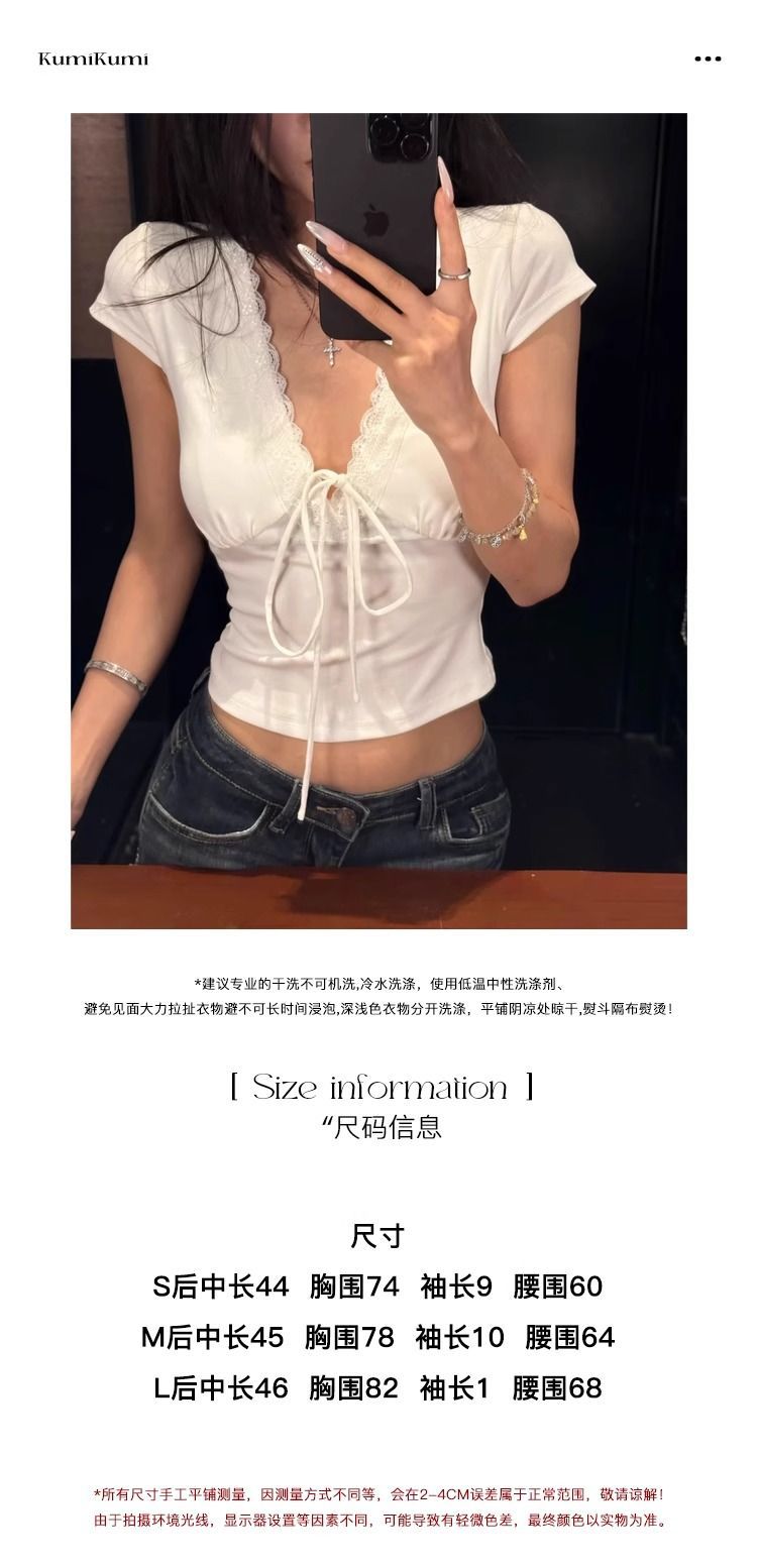 보라색 레이스 스플 라이스 v 넥 반팔 티셔츠 여성 여름 로얄 자매 가벼운 성숙한 스타일 핫 소녀 섹시한 타이트 탑