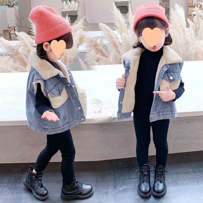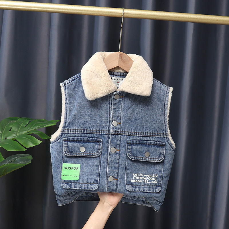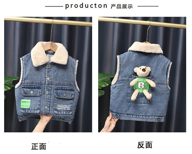 소년을위한 아기 벨벳 두꺼운 데님 조끼 2025 봄 새로운 한국어 버전 만화 유아 및 어린이 세련되고 귀여운스토어 가기