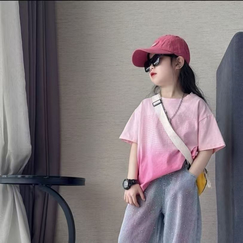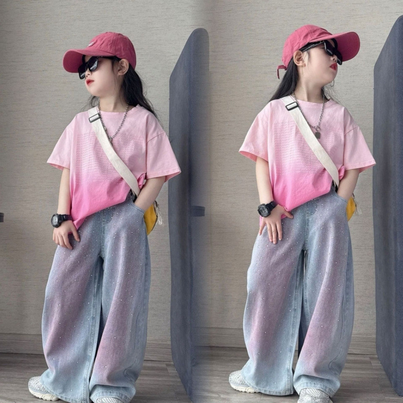 여자 여름 정장 2025 새로운 여름 스타일 스타일 드롭 염색 반팔 티셔츠 핫 다이아몬드 데님 와이드 레그 팬츠 투피스 세트스토어 가기