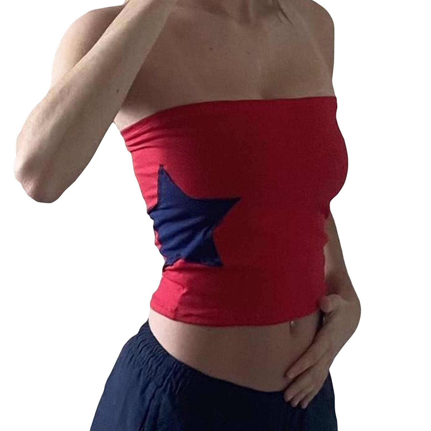 여성용 레드 블루 스타 패치워크 슬리브 반두 탑 슬림스토어 가기