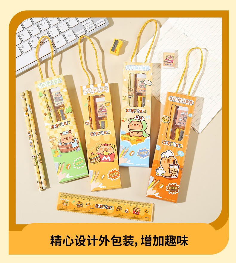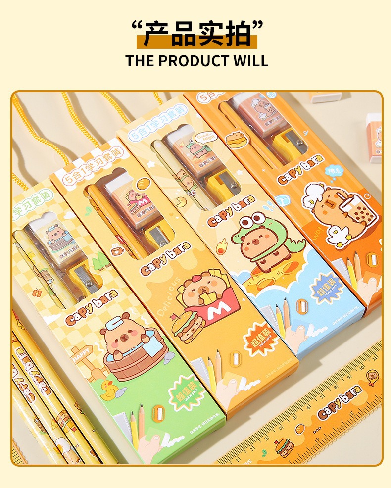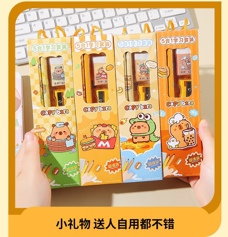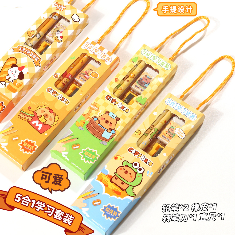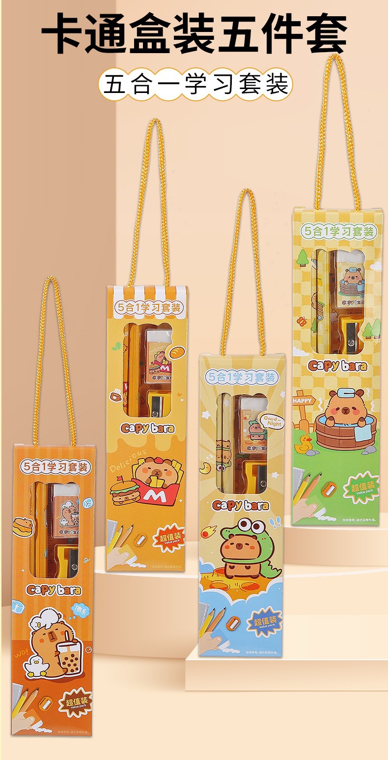 Kapibala 5-in-one 연필 문구 세트 어린이 5피스 상품 눈금자 지우개 세트 선물 상자 도매스토어 가기