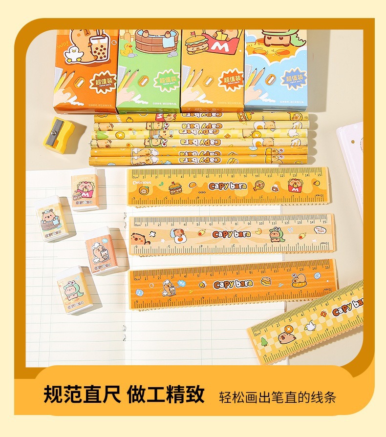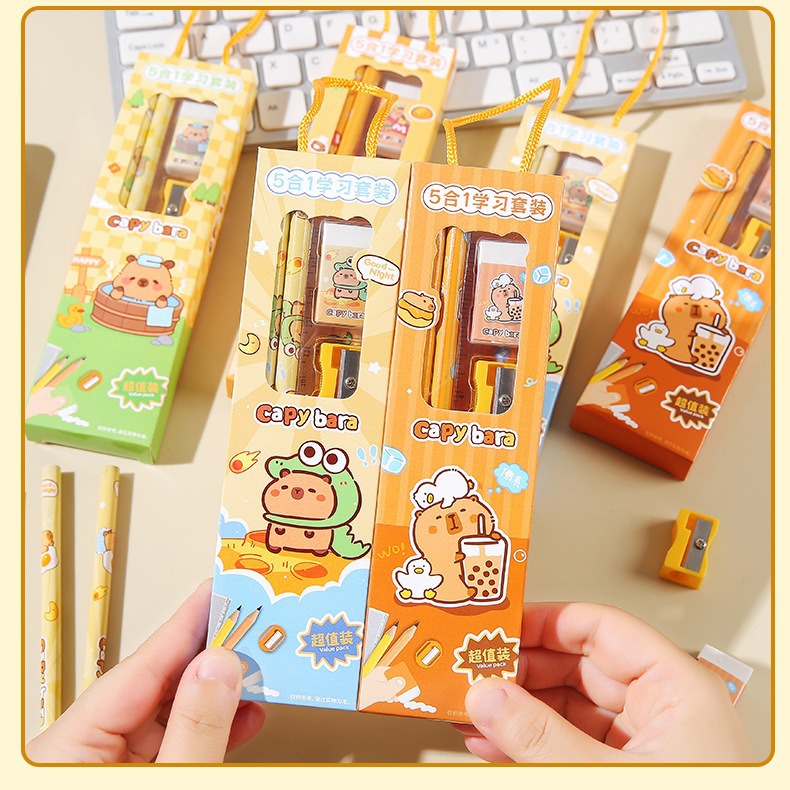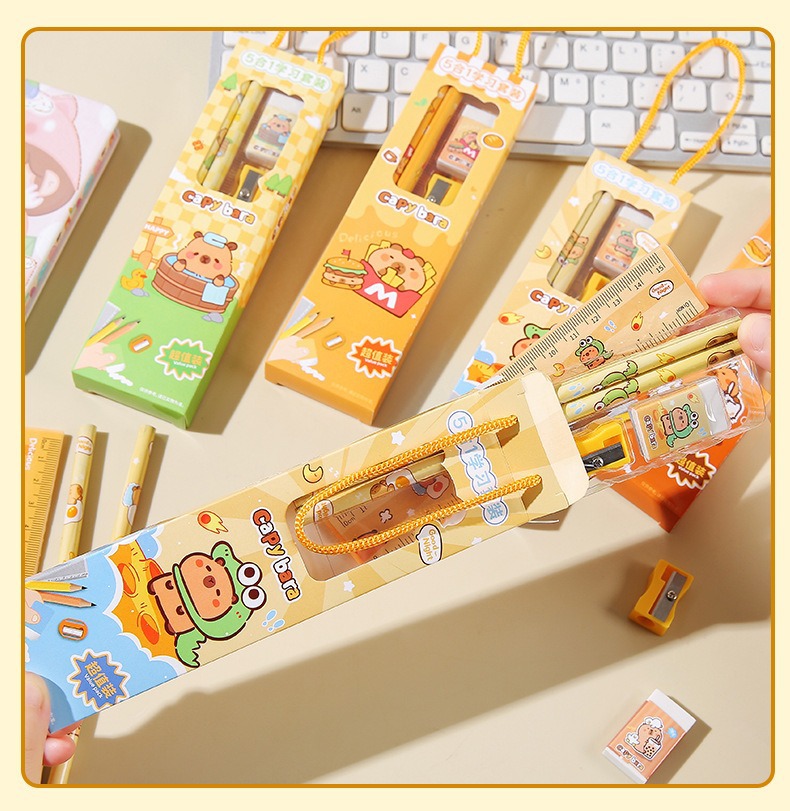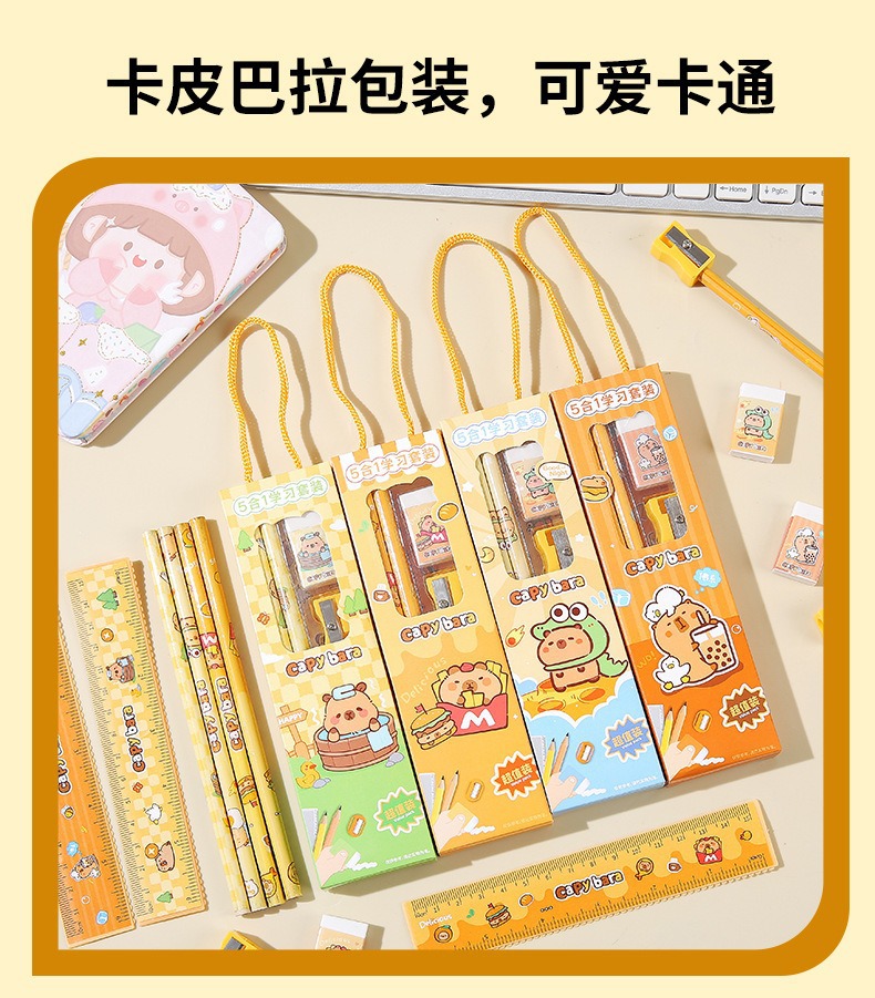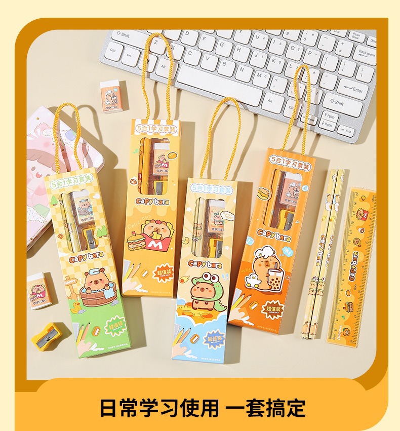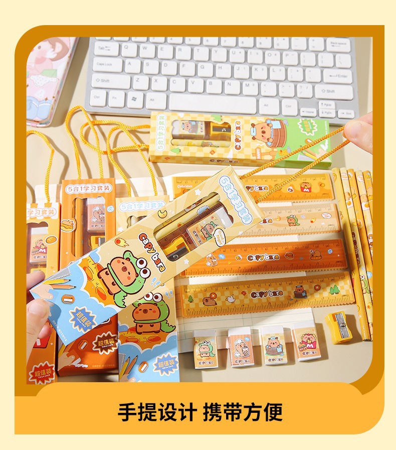 Kapibala 5-in-one 연필 문구 세트 어린이 5피스 상품 눈금자 지우개 세트 선물 상자 도매