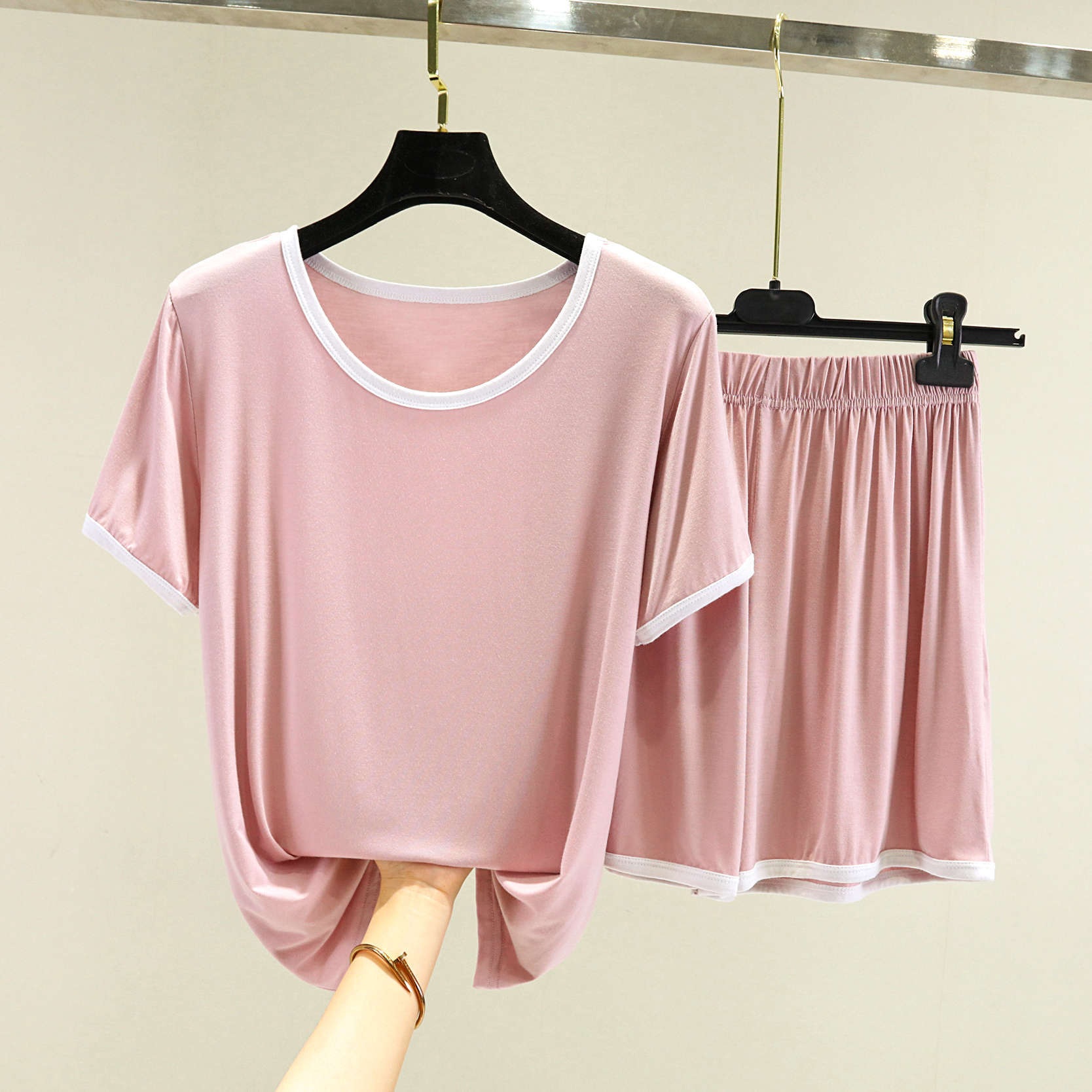 2025 여름 모달 잠옷 세트 여성용 얇은 홈 루즈 반팔 티셔츠 플러스 사이즈 탑 반바지 투피스 세트