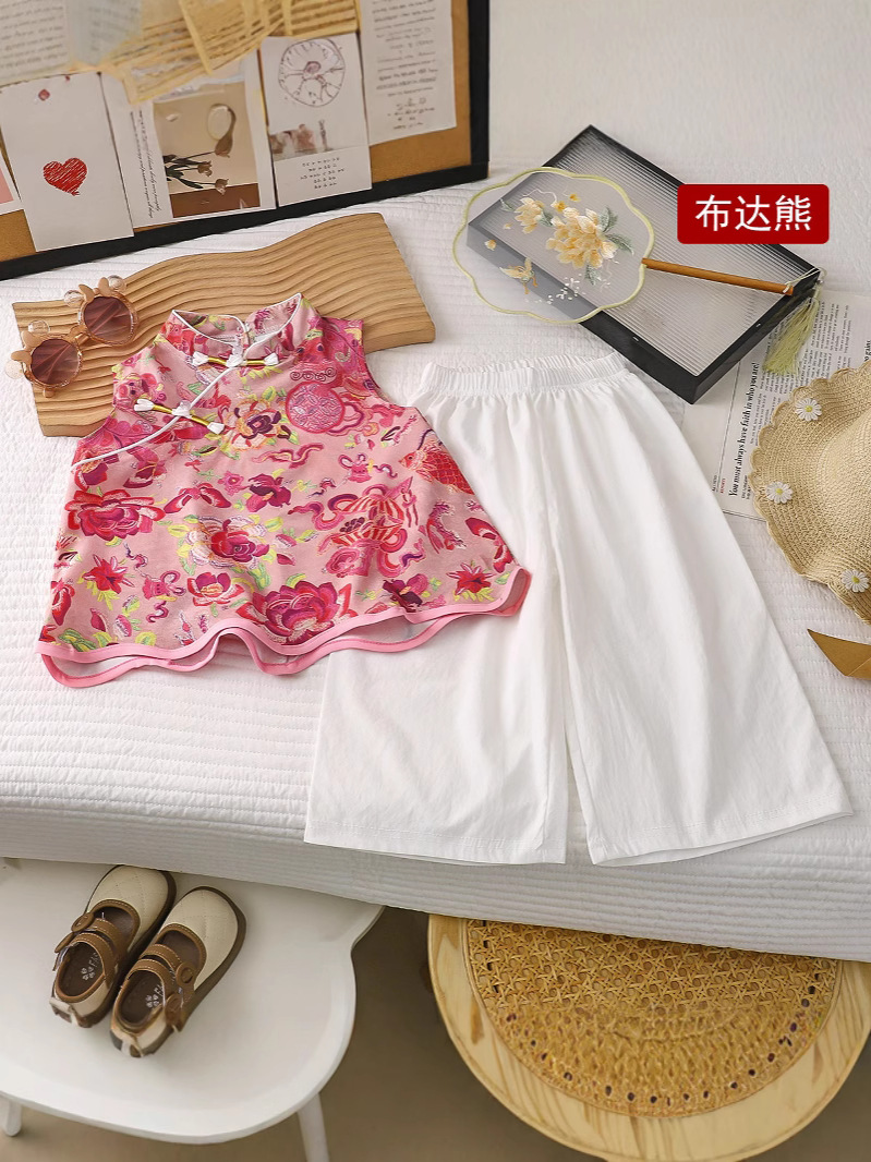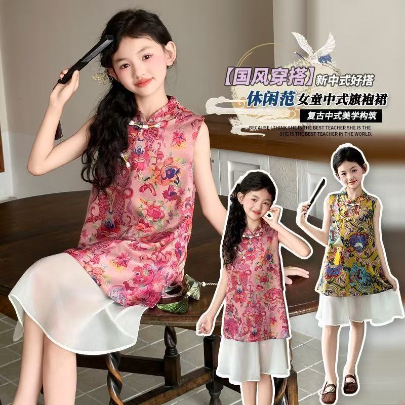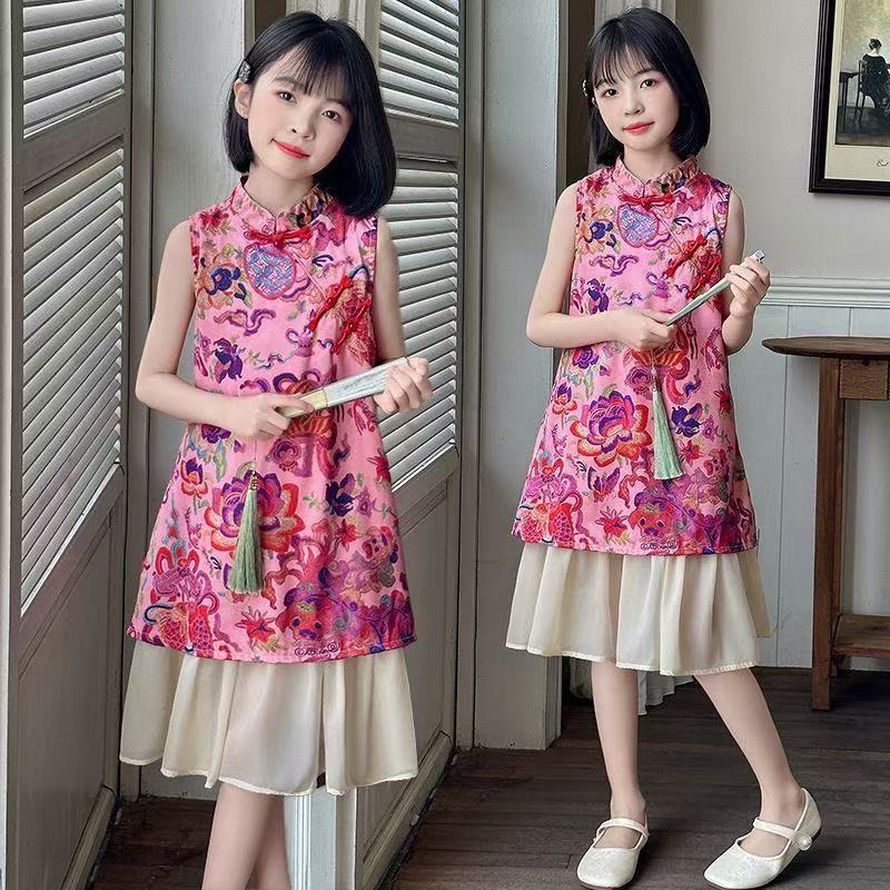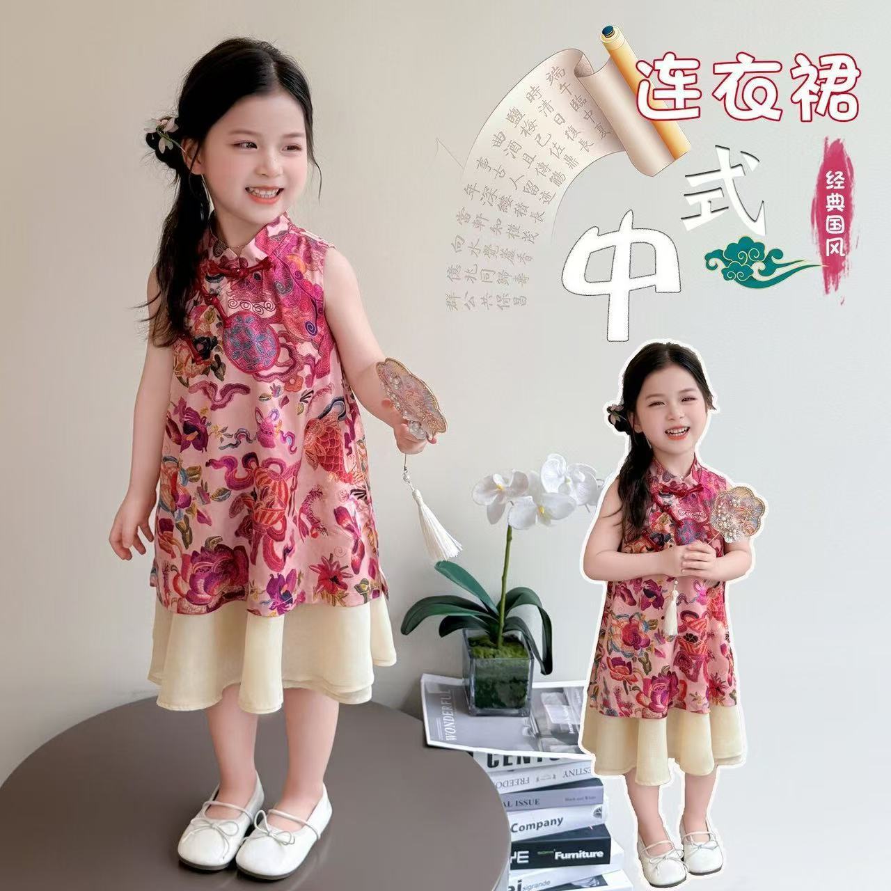 여자 중국 스타일 정장 여름 2025 새로운 슈퍼 멋진 아동복 새로운 중국 스타일 아기 소녀 여름 옷 Hanfu 민소매