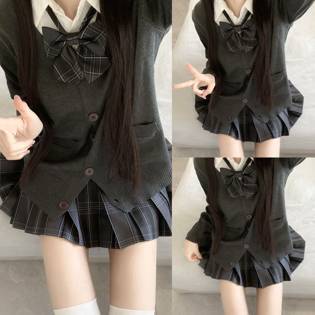 • 화이트 셔츠 + 보타이 + 달란 스커트 + 다크 그레이 가디건 (4종 세트)