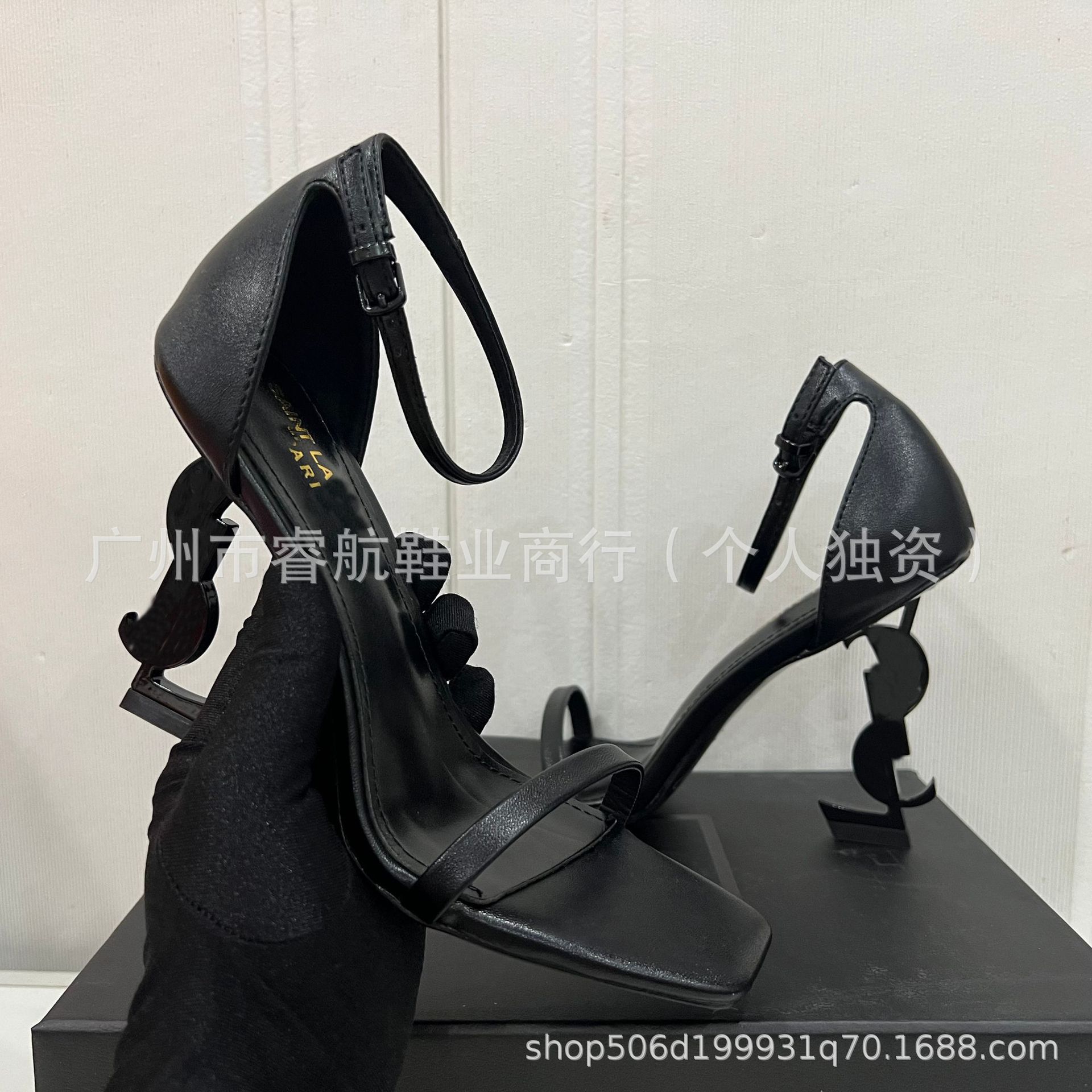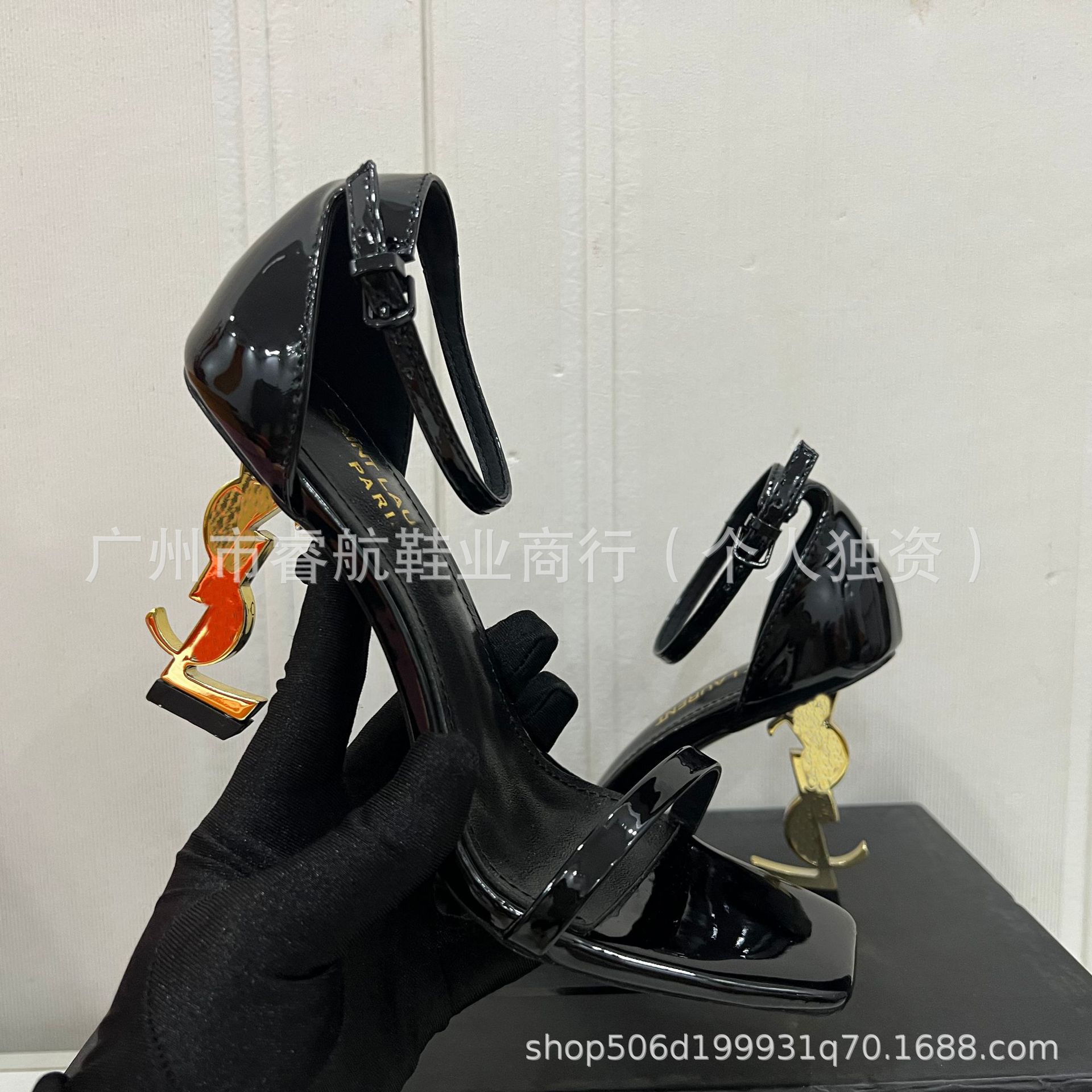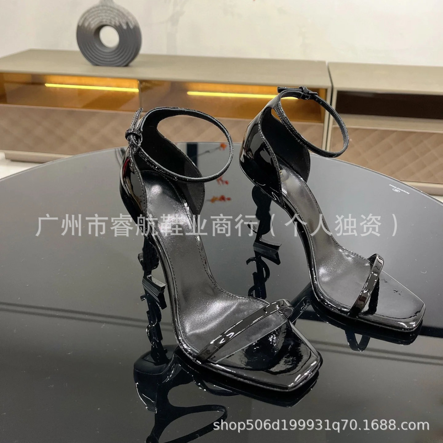 여성용 원스트랩 하이힐 2025 새로운 유럽과 미국의 레터 힐 블랙 페이턴트 가죽 섹시 샌들 같은 스타일의 슈퍼 하이힐