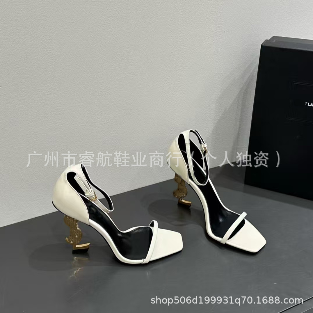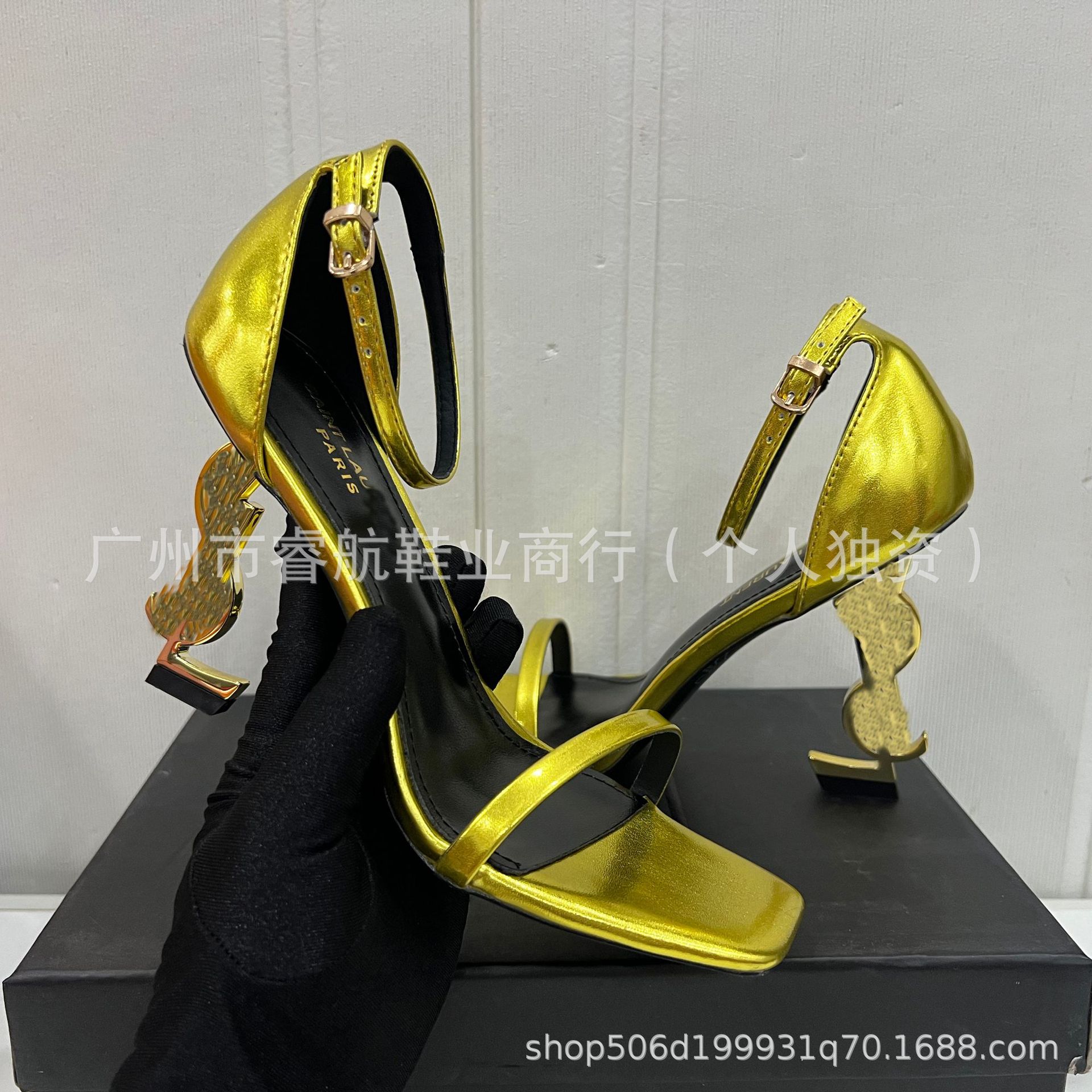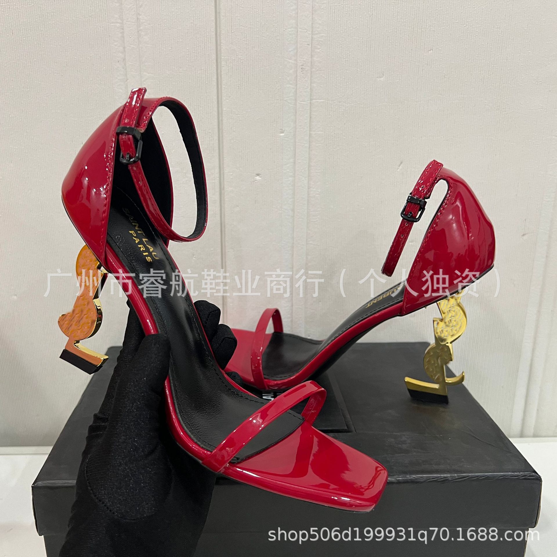 여성용 원스트랩 하이힐 2025 새로운 유럽과 미국의 레터 힐 블랙 페이턴트 가죽 섹시 샌들 같은 스타일의 슈퍼 하이힐