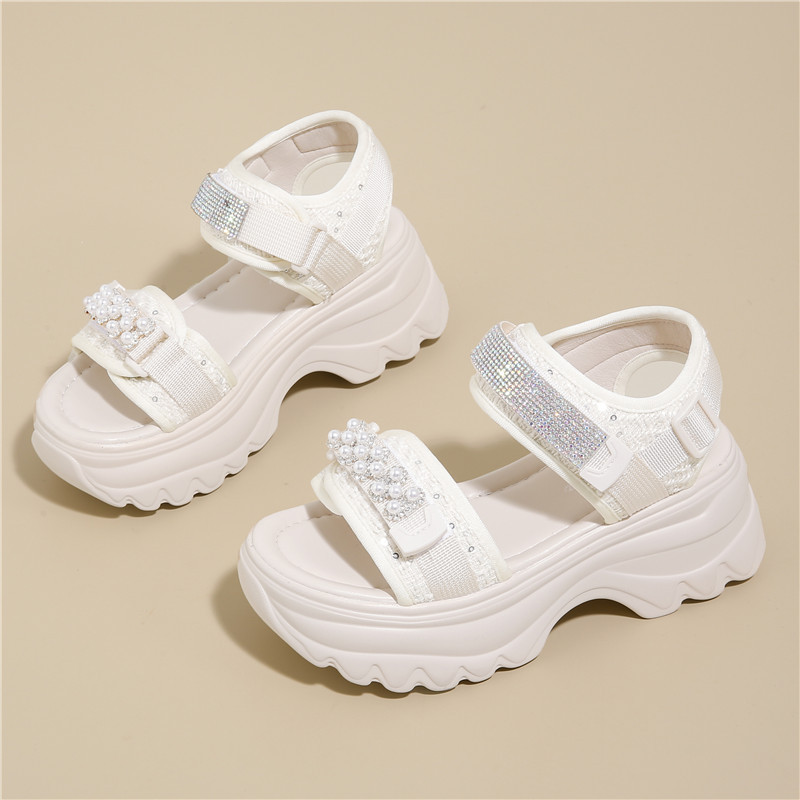작은 크기의 라인스톤 두꺼운 밑창 샌들 여름 2025 새로운 겉옷 하이힐 부드러운 밑창 높이 증가 벨크로 로마 샌들 여성용