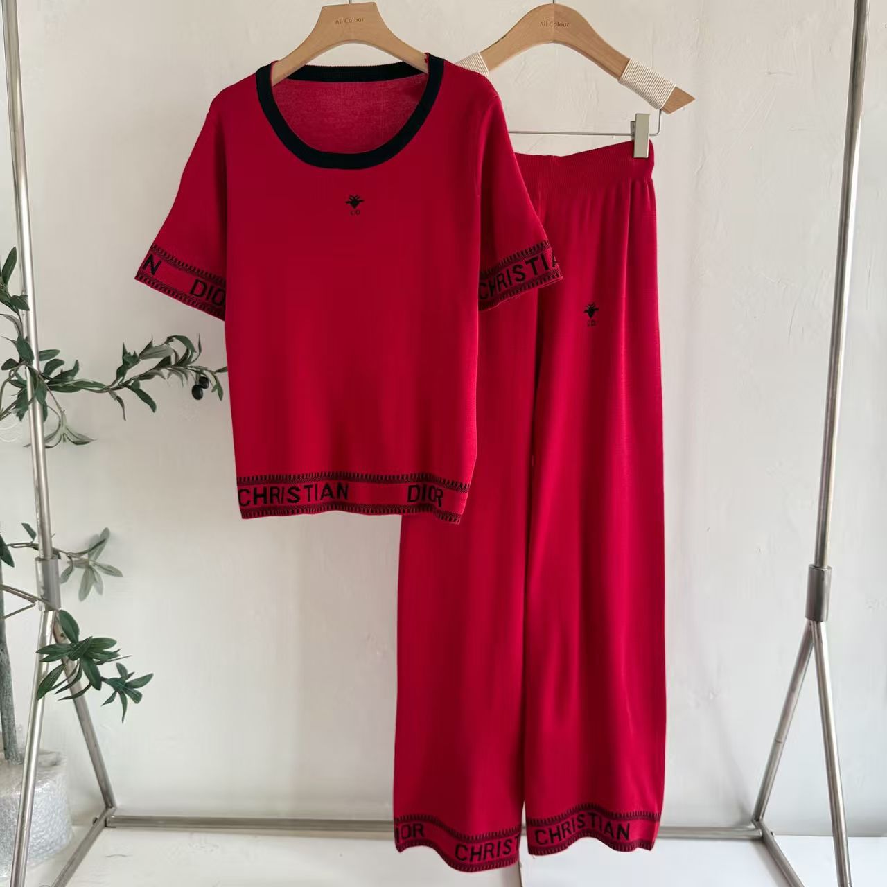 2025 새로운 여름 의류 세련된 대비 색상 니트 느슨한 캐주얼 스포츠 정장 여성 티셔츠 스트레이트 와이드 레그 팬츠스토어 가기