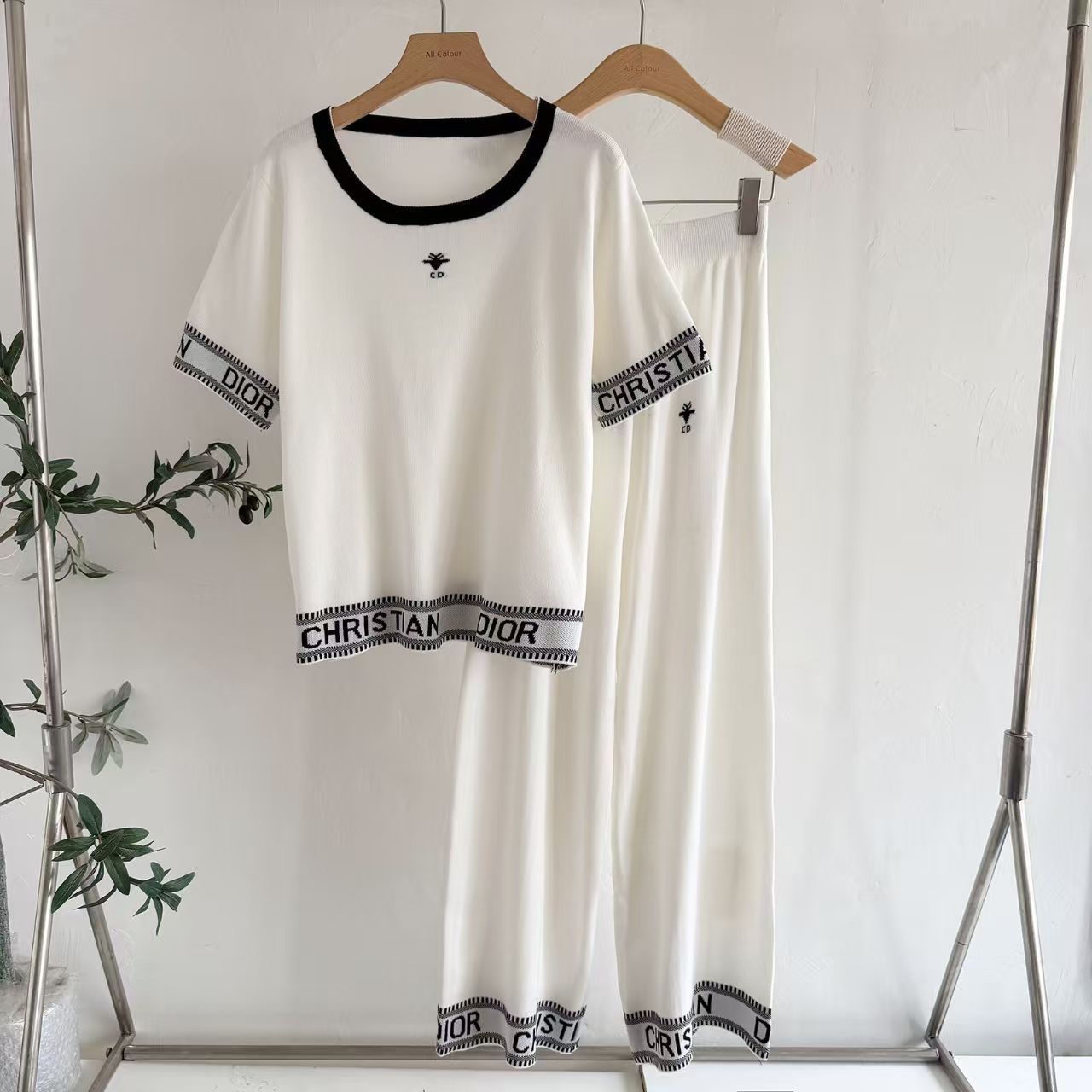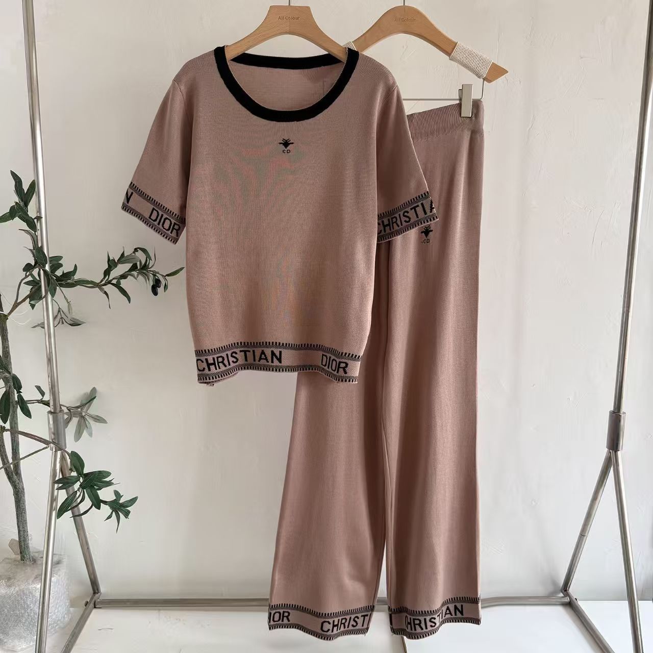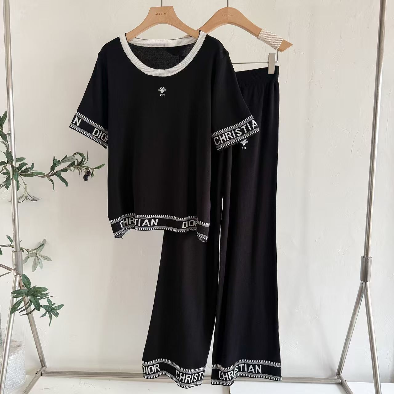 2025 새로운 여름 의류 세련된 대비 색상 니트 느슨한 캐주얼 스포츠 정장 여성 티셔츠 스트레이트 와이드 레그 팬츠
