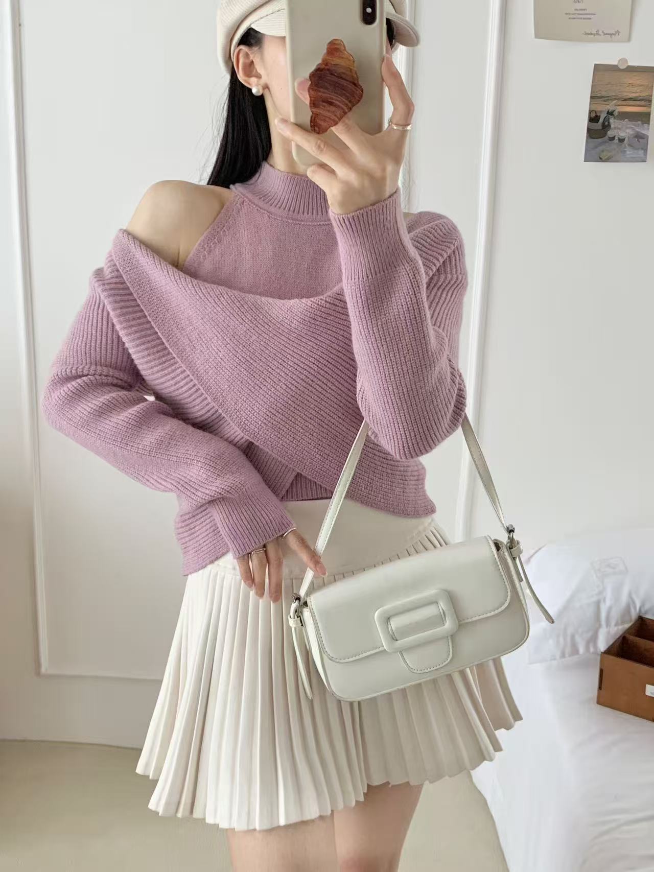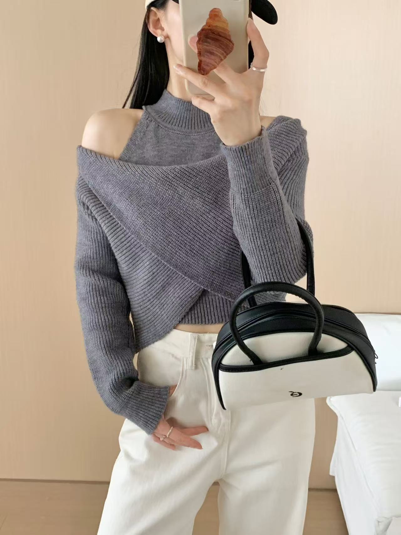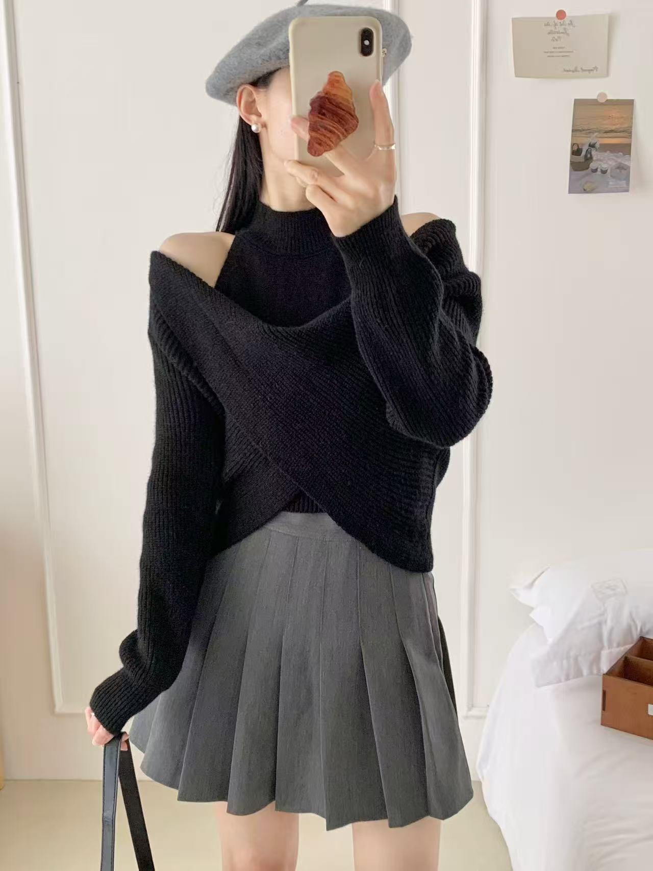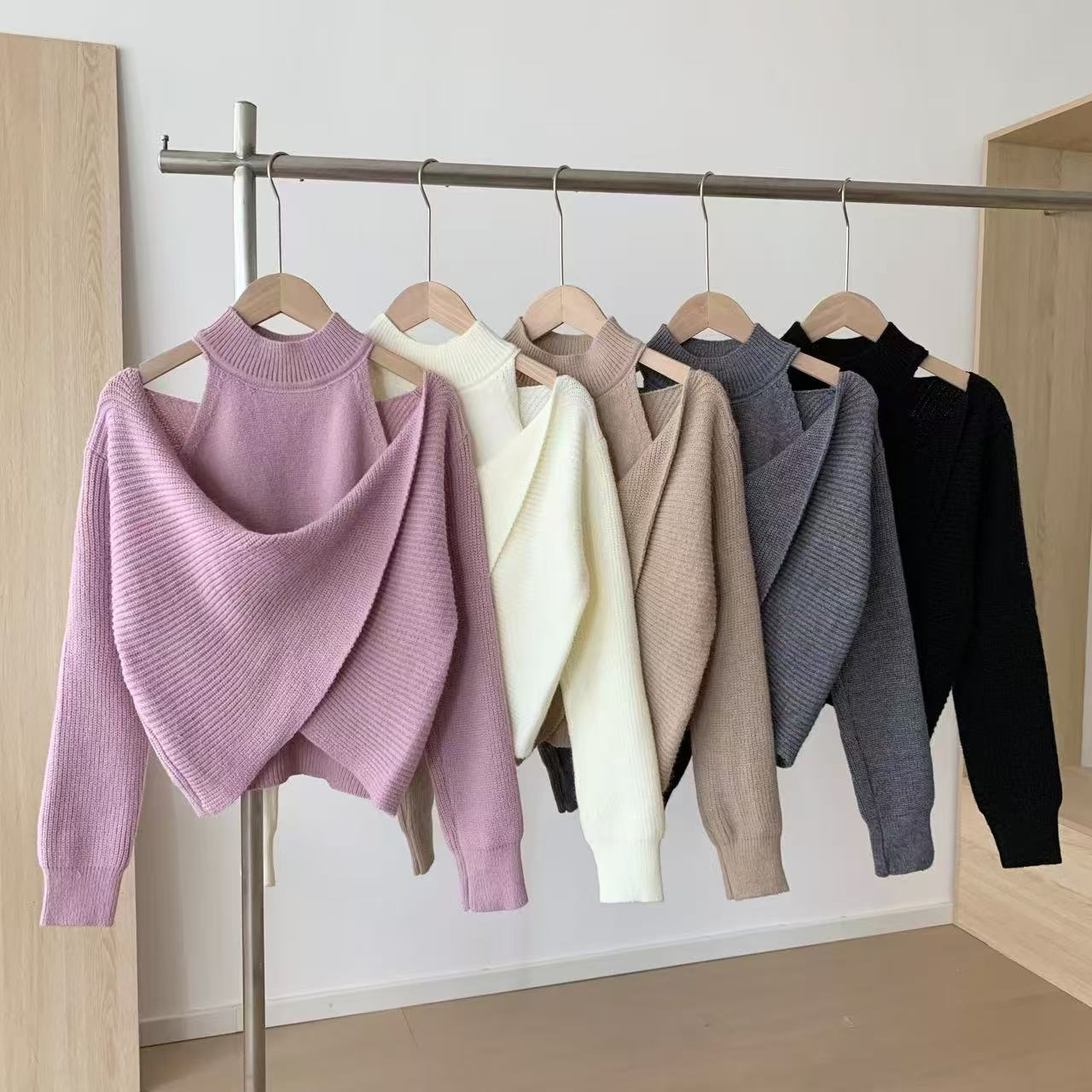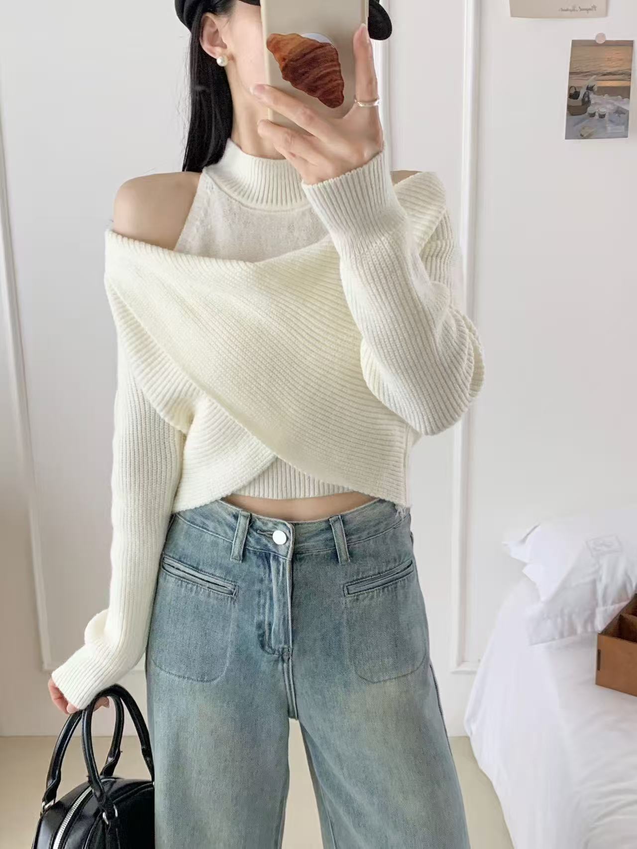 2025 오프 숄더 디자인 틈새 바닥 셔츠 여성 가을, 겨울 하프 터틀넥 가짜 투피스 니트 기질 패션 스웨터 여성스토어 가기