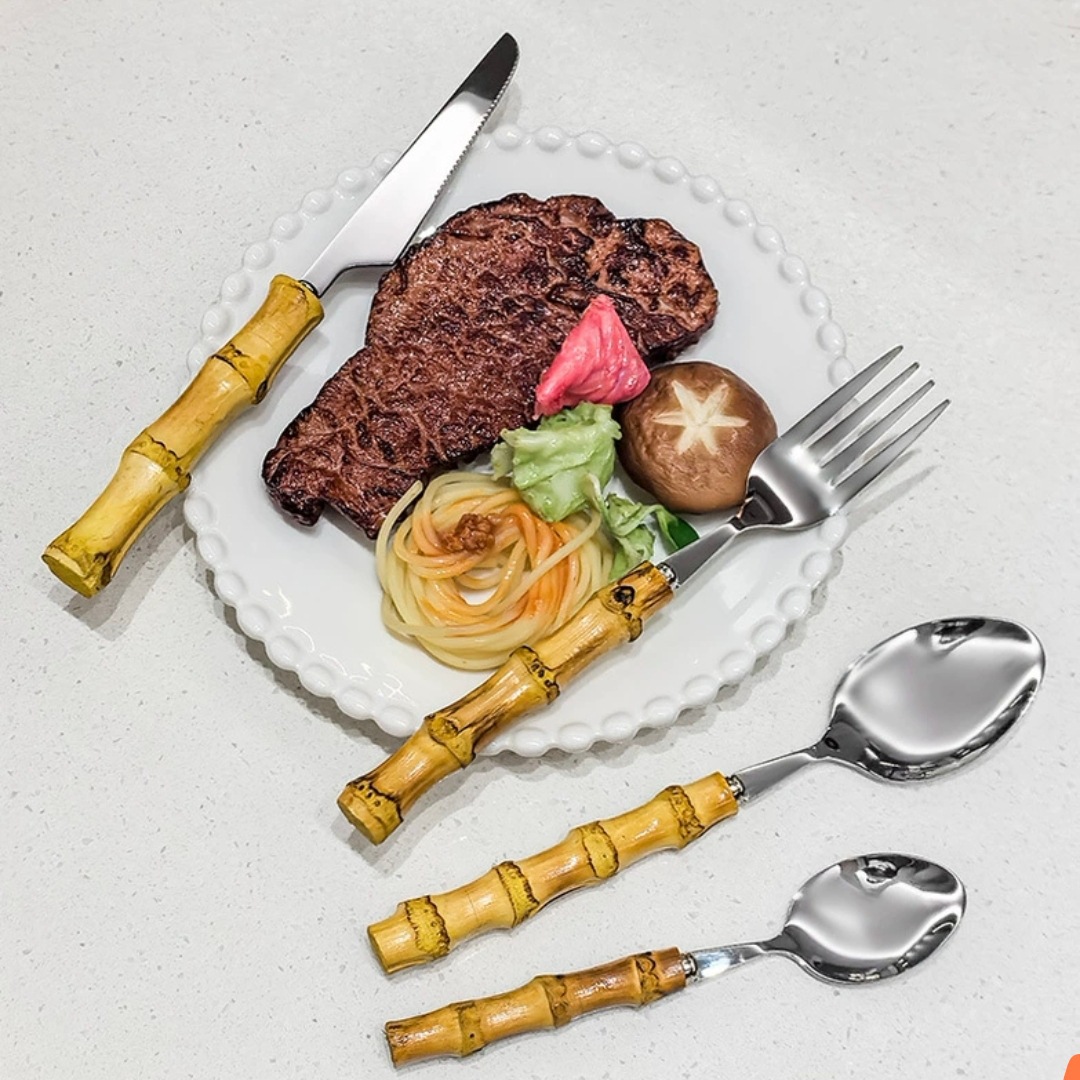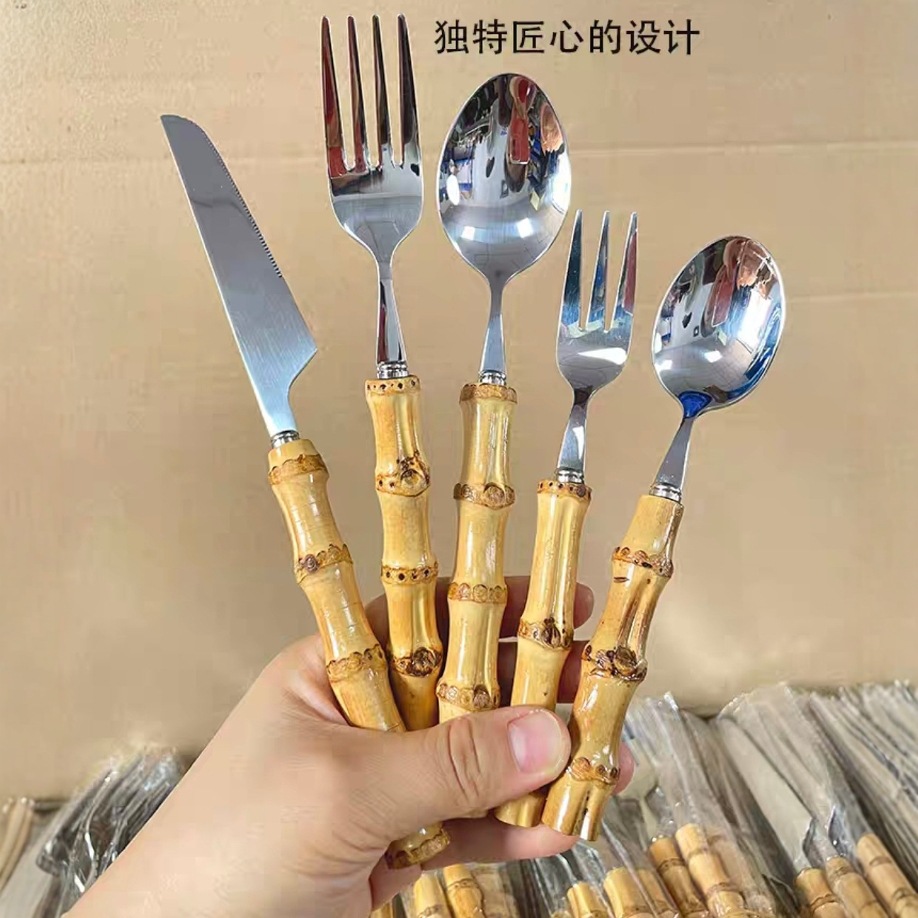 304 스테인레스 스틸 대나무 칼, 포크 및 스푼, 천연 대나무 손잡이 칼, 포크 및 스푼, 일본식 단단한 나무 손잡이 칼, 포크 및 스푼, 호텔 식기스토어 가기