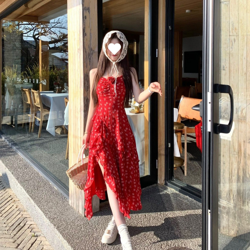 2025 봄 여름 새로운 스타일 아름다운 정의 레드 홀리데이 서스펜더 슬릿 꽃무늬 카디건 롱 스커트 여성용 투피스 슈트스토어 가기