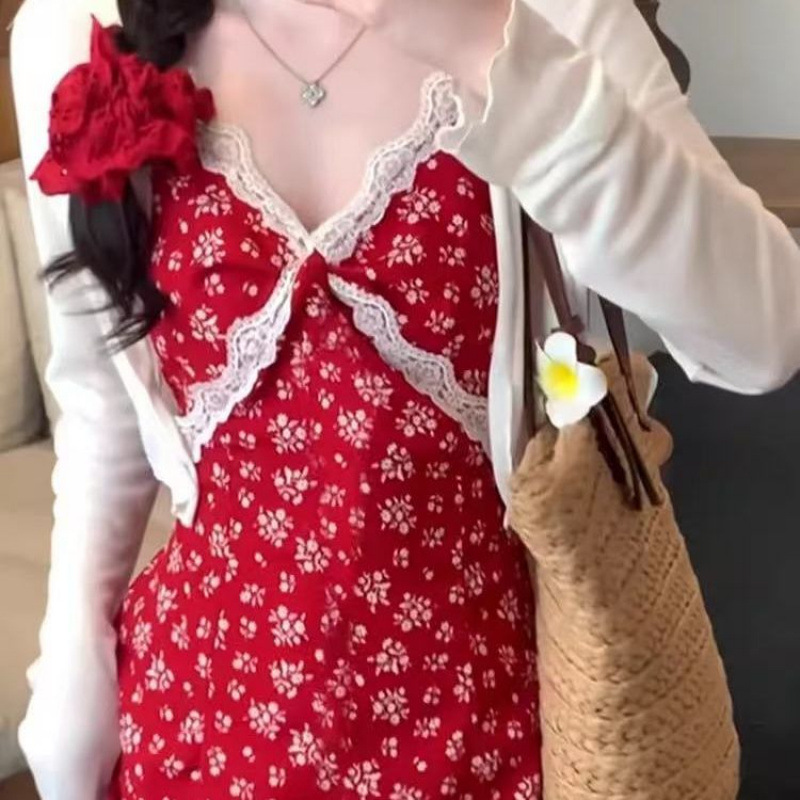 기질 프렌치 레이스 스플라이싱 꽃무늬 서스펜더 드레스 여름 신작 휴가 허리 긴 빨간색 드레스