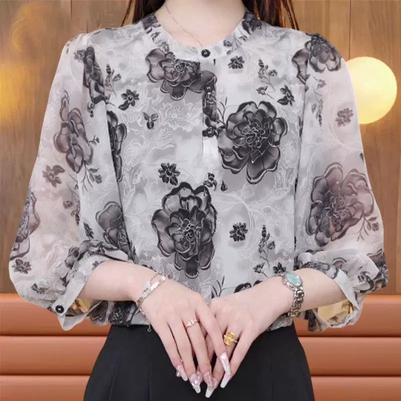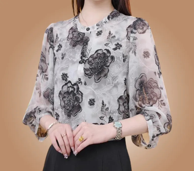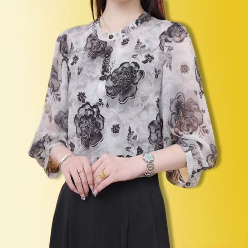 여성을 위한 기질 복고풍 패션 프린트 7부 소매 셔츠, 여름 신작 스탠드 칼라 셔츠, 패셔너블한 엄마 쉬폰 탑