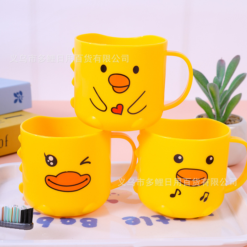 두꺼운 귀여운 만화 작은 노란색 오리 컵 손잡이가있는 플라스틱 칫솔질 구강 세척제 컵 휴대용 크리 에이 티브 워시 컵 도매
