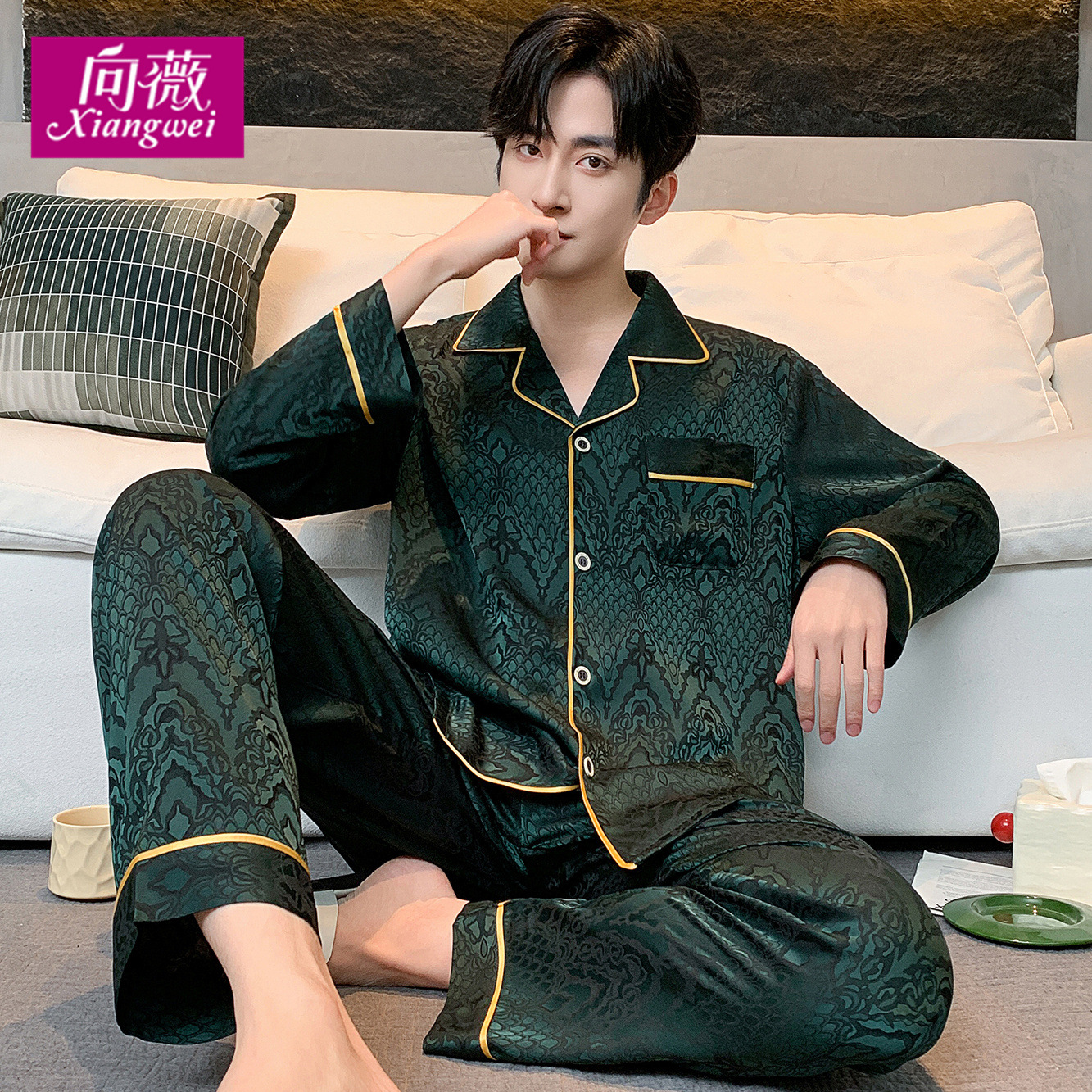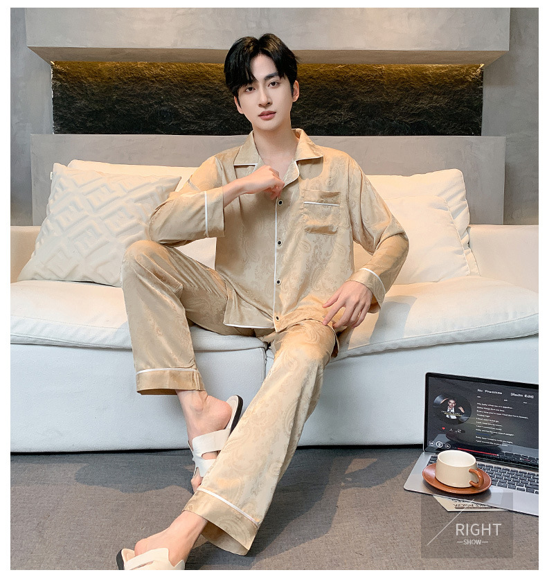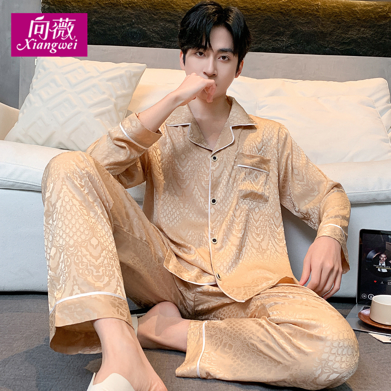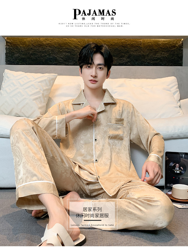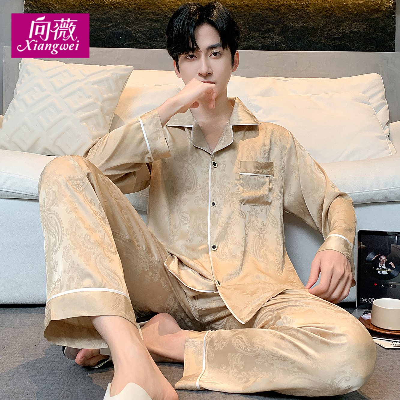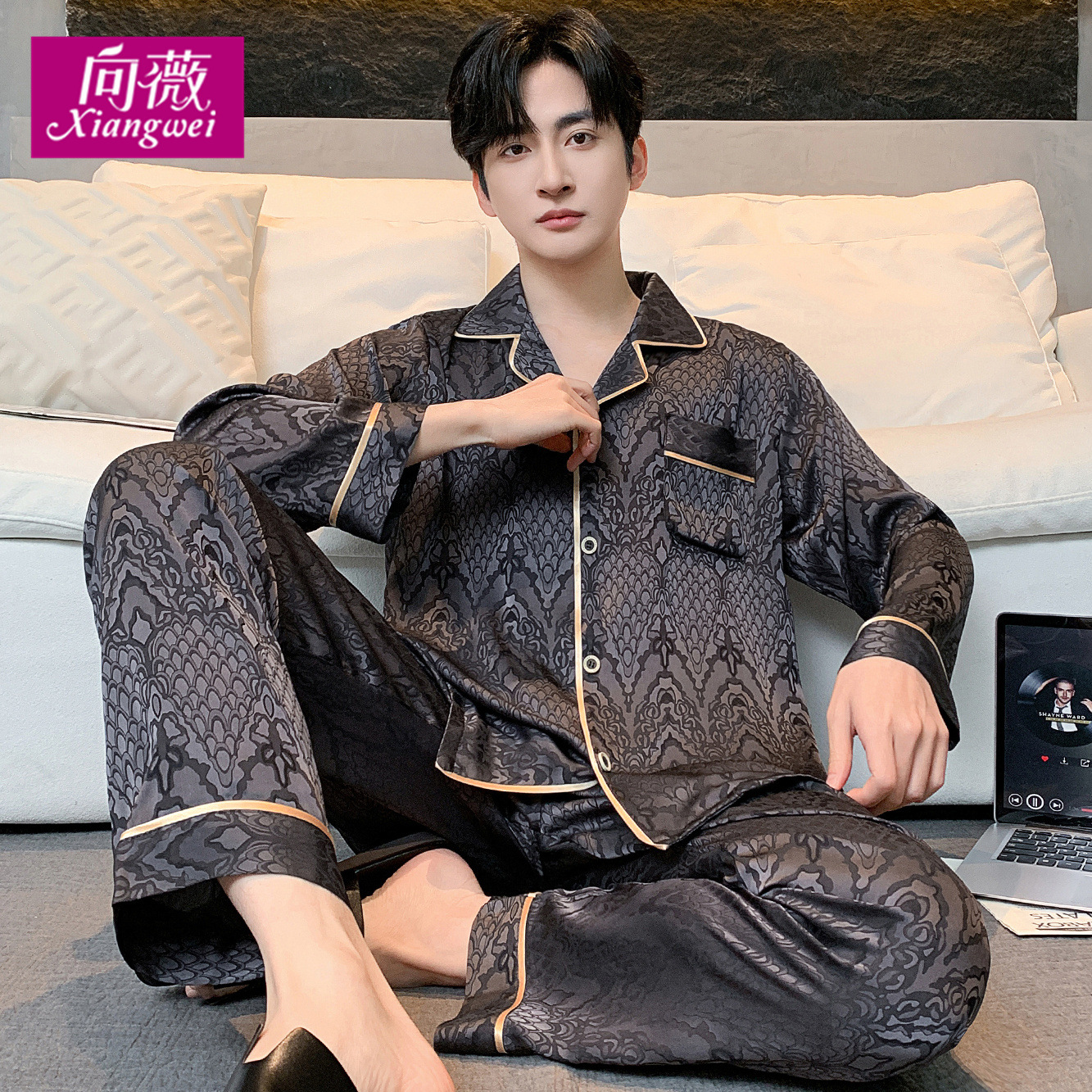 여름 얇고 가벼운 럭셔리 남성용 얼음과 눈 실크 웨어러블 사계절 홈웨어 대형 루즈 긴팔 잠옷 세트스토어 가기