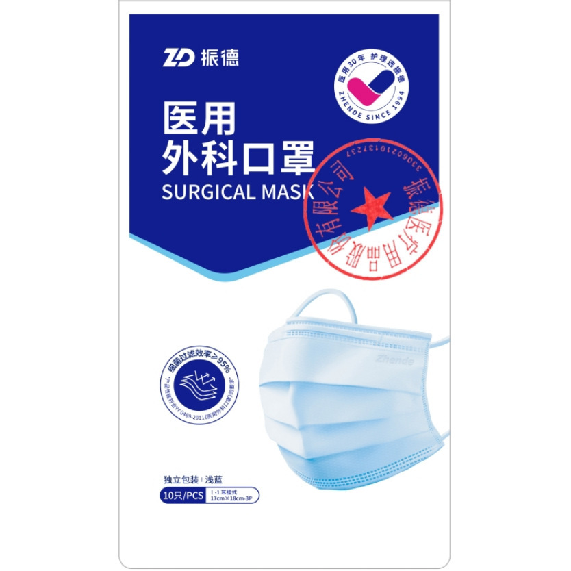 • Zhende 의료용 수술용 마스크(비멸균 I-1 귀고리 유형) 17cm×18cm-3P10개/가방--1봉지
