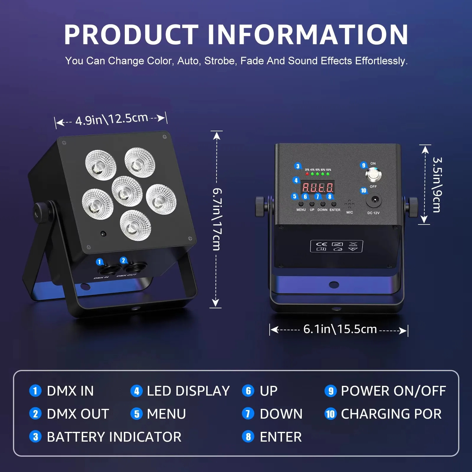 인기 있는 6개의 6-in-1 풀 컬러 무선 배터리 파 라이트, 워시 라이트는 휴대폰 앱을 지원하여 무대 조명을 제어합니다.스토어 가기