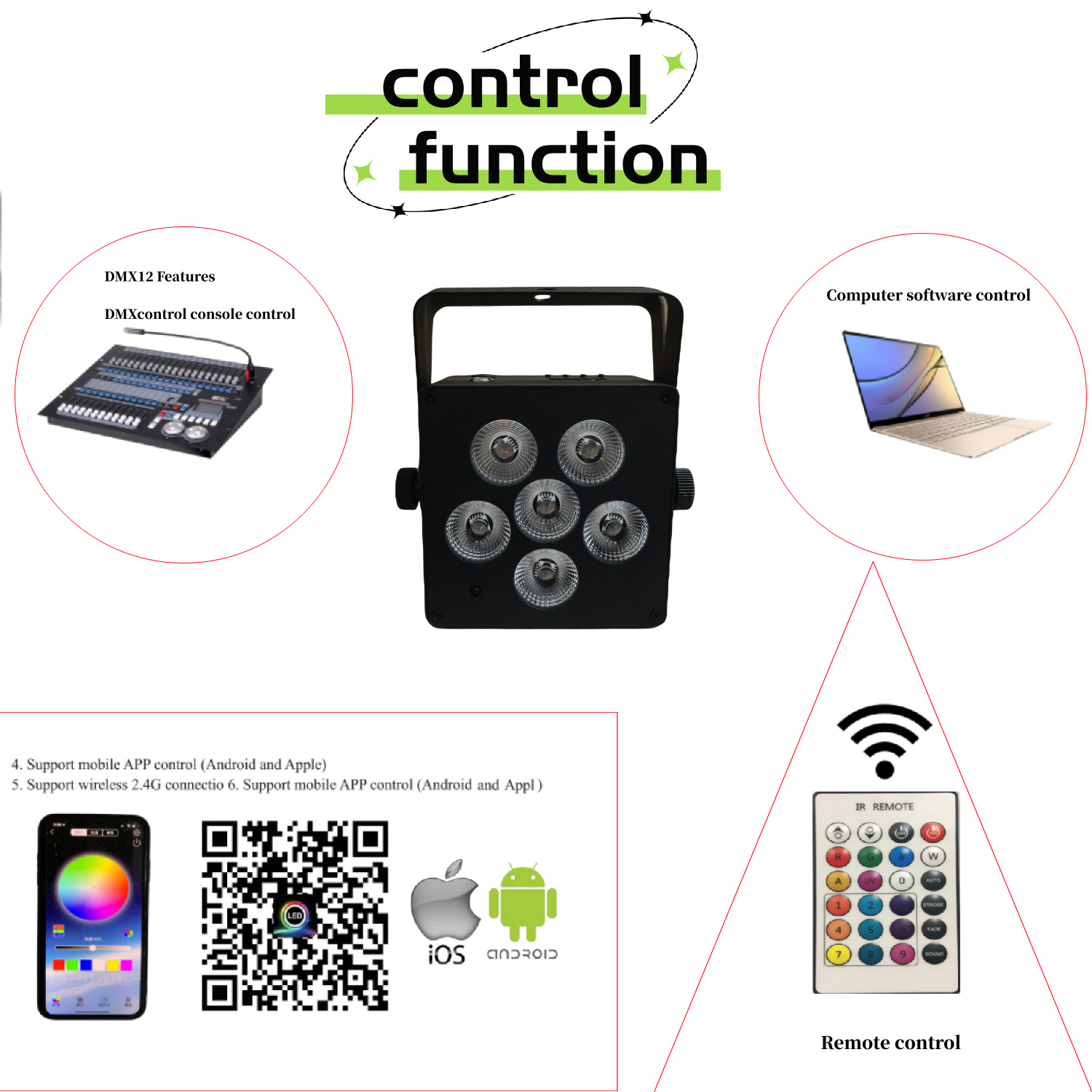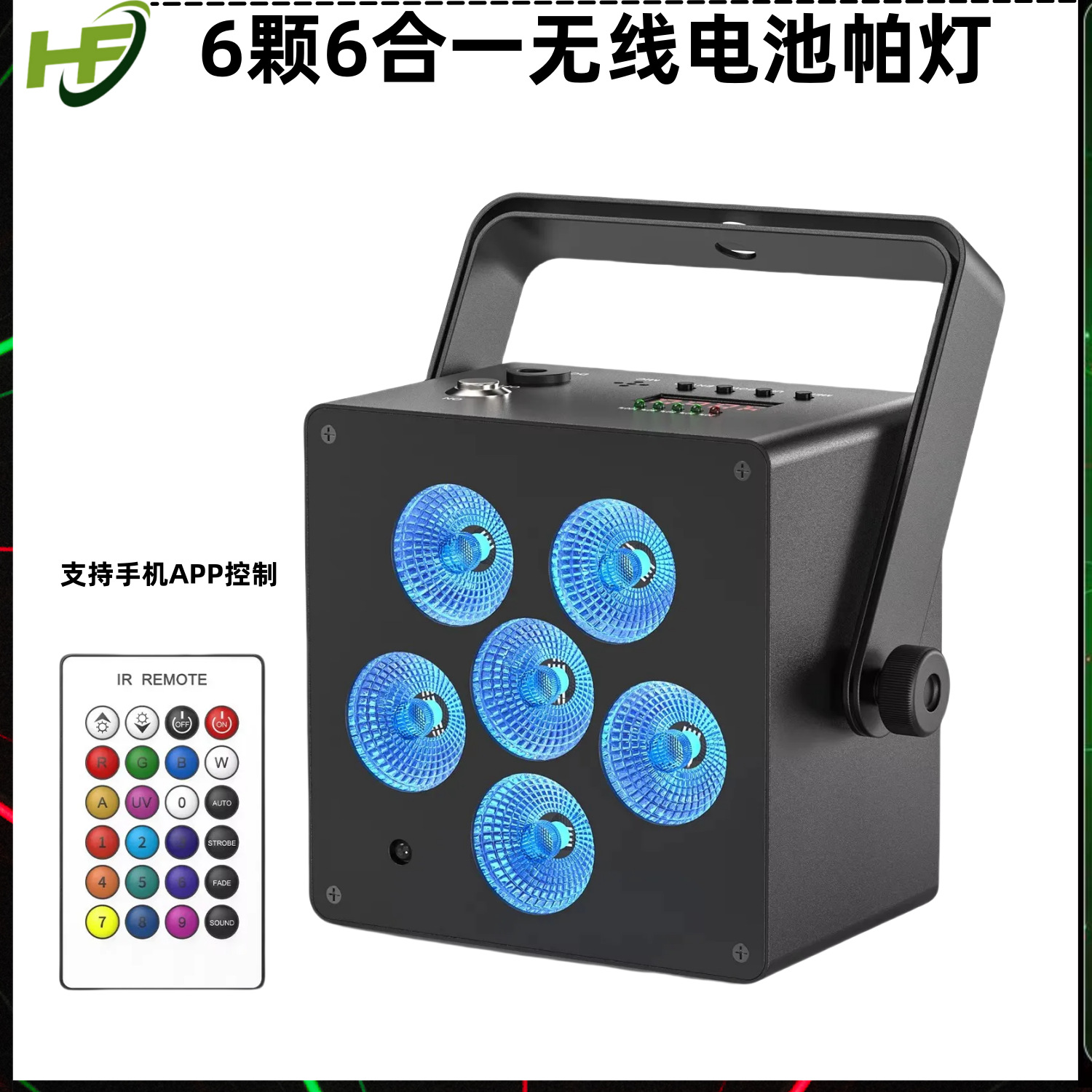 인기 있는 6개의 6-in-1 풀 컬러 무선 배터리 파 라이트, 워시 라이트는 휴대폰 앱을 지원하여 무대 조명을 제어합니다.