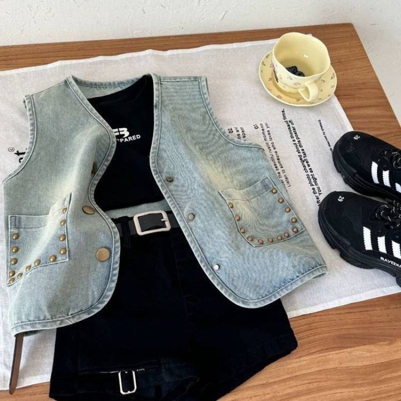 한국 스타일 소녀의 봄, 가을 새로운 스타일 리벳 조끼 데님 재킷 아기 소녀 유행 조끼 양복 조끼 여름 스타일스토어 가기