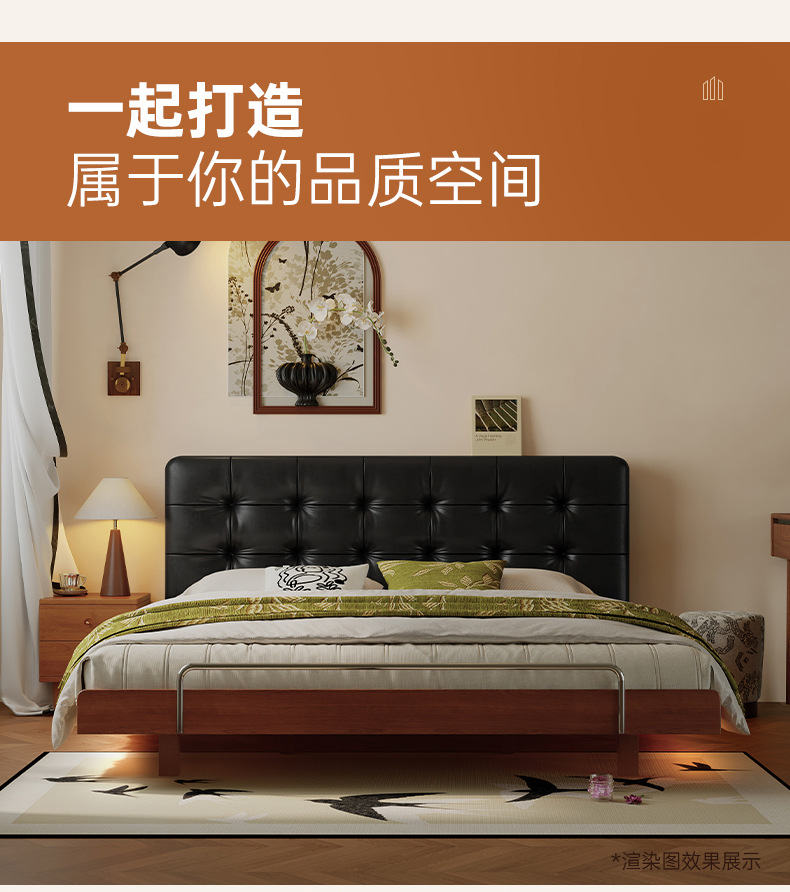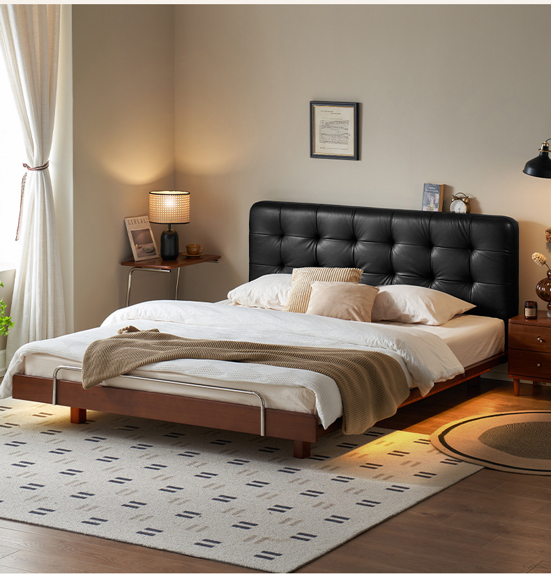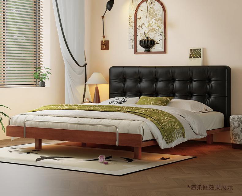 코사인 원목 침대 중세 스타일 블랙 가죽 서스펜션 침대 1.8 마스터 침실 더블 침대 와플 침대 N3017